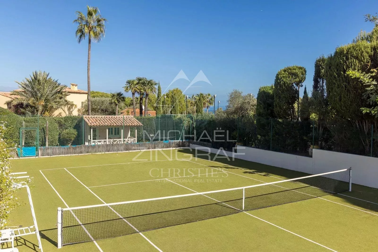 À l'extérieur, profitez d'une somptueuse piscine chauffée de 14x6 m, d'un court de tennis en gazon, et d'un magnifique terrain paysager de 5.000 m² env. Un double garage complète ce bien d'exception.