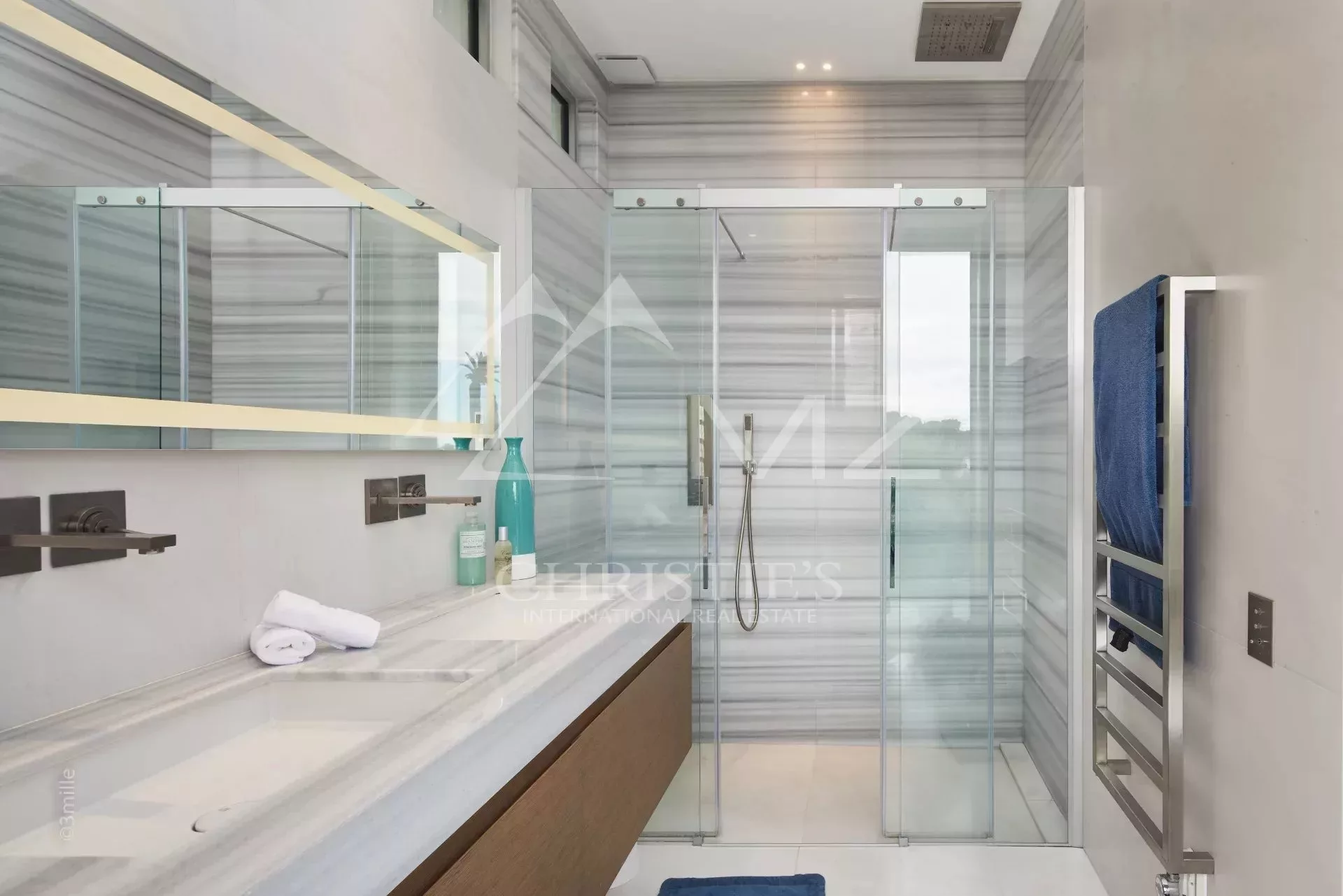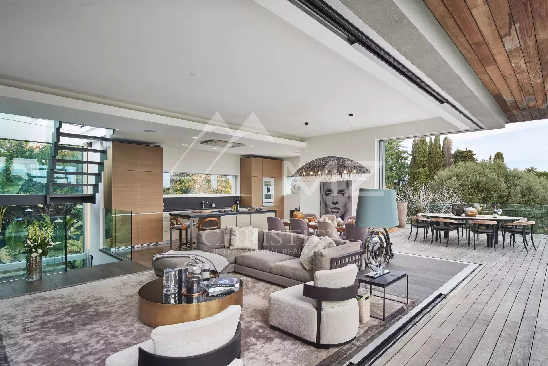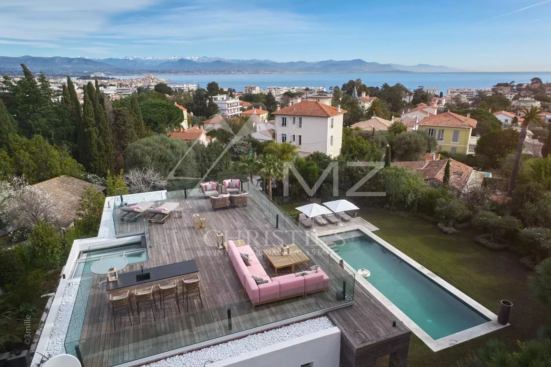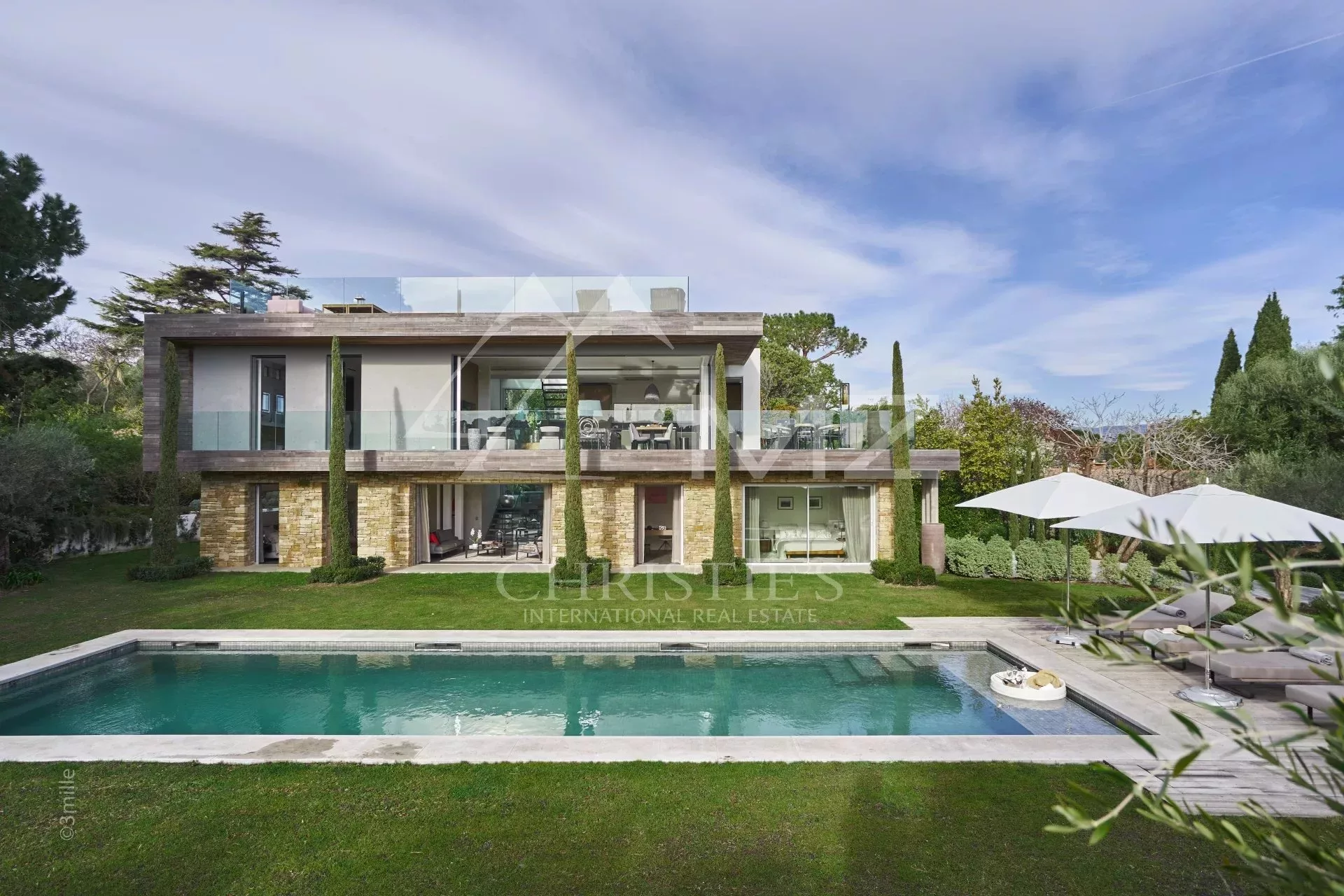 Au centre du Cap d'Antibes, somptueuse villa moderne neuve de 330 m² environ, comprenant au rez-de-chaussée : un salon avec bureau, une chambre en suite avec salle d'eau et une chambre de maitre avec salle de bains. A l'entresol, un sauna avec salle d'eau et lounge, une buanderie, une cuisine d'appoint et une chambre en suite. A l'étage, un séjour principal avec cuisine et accès terrasse, deux chambres en suite avec salle d'eau. Le toit terrasse offre une vue mer et un espace détente. Piscine chauffée 14x5. Terrain de 1800 m.
