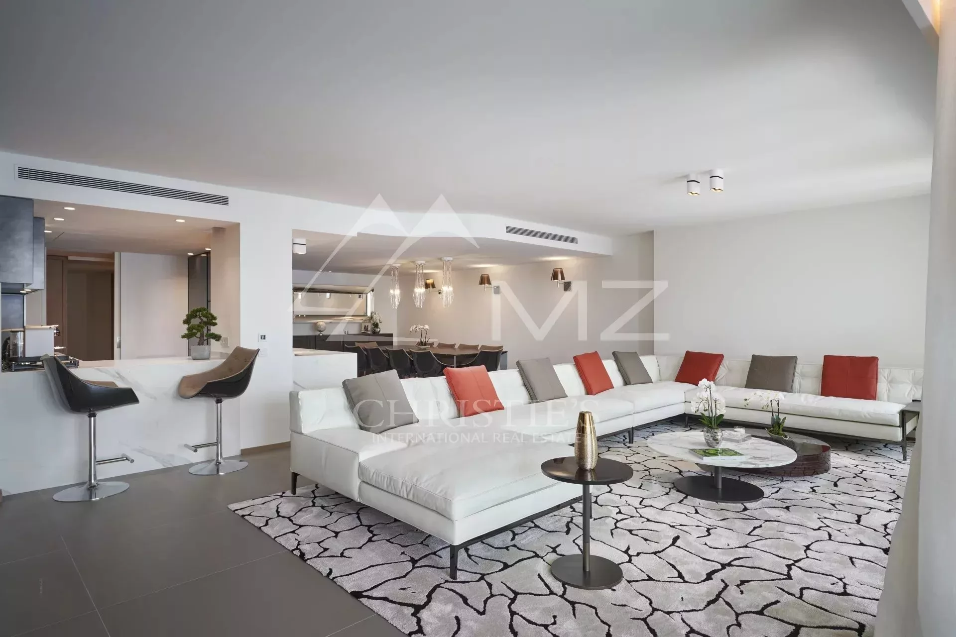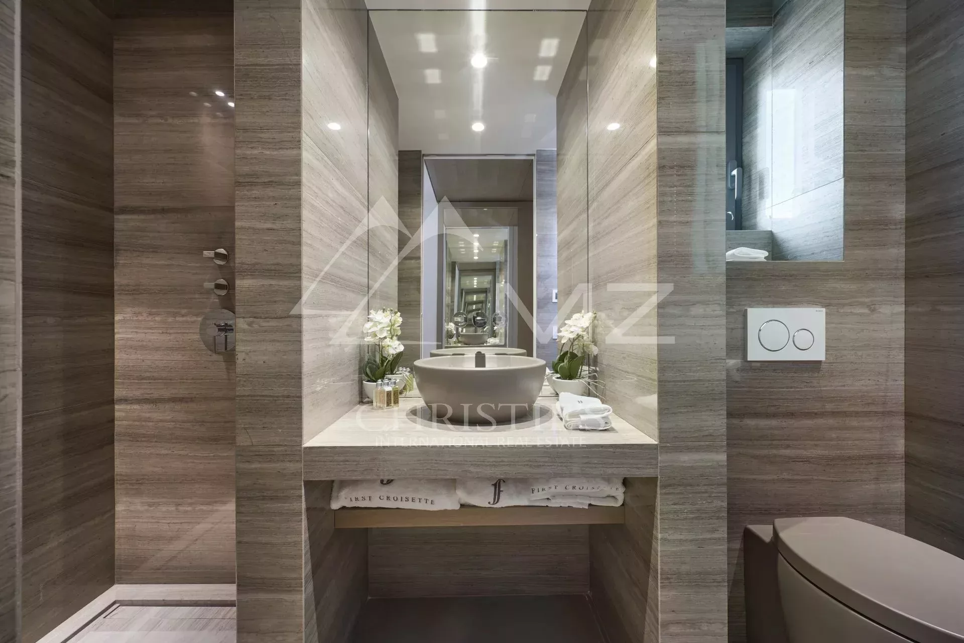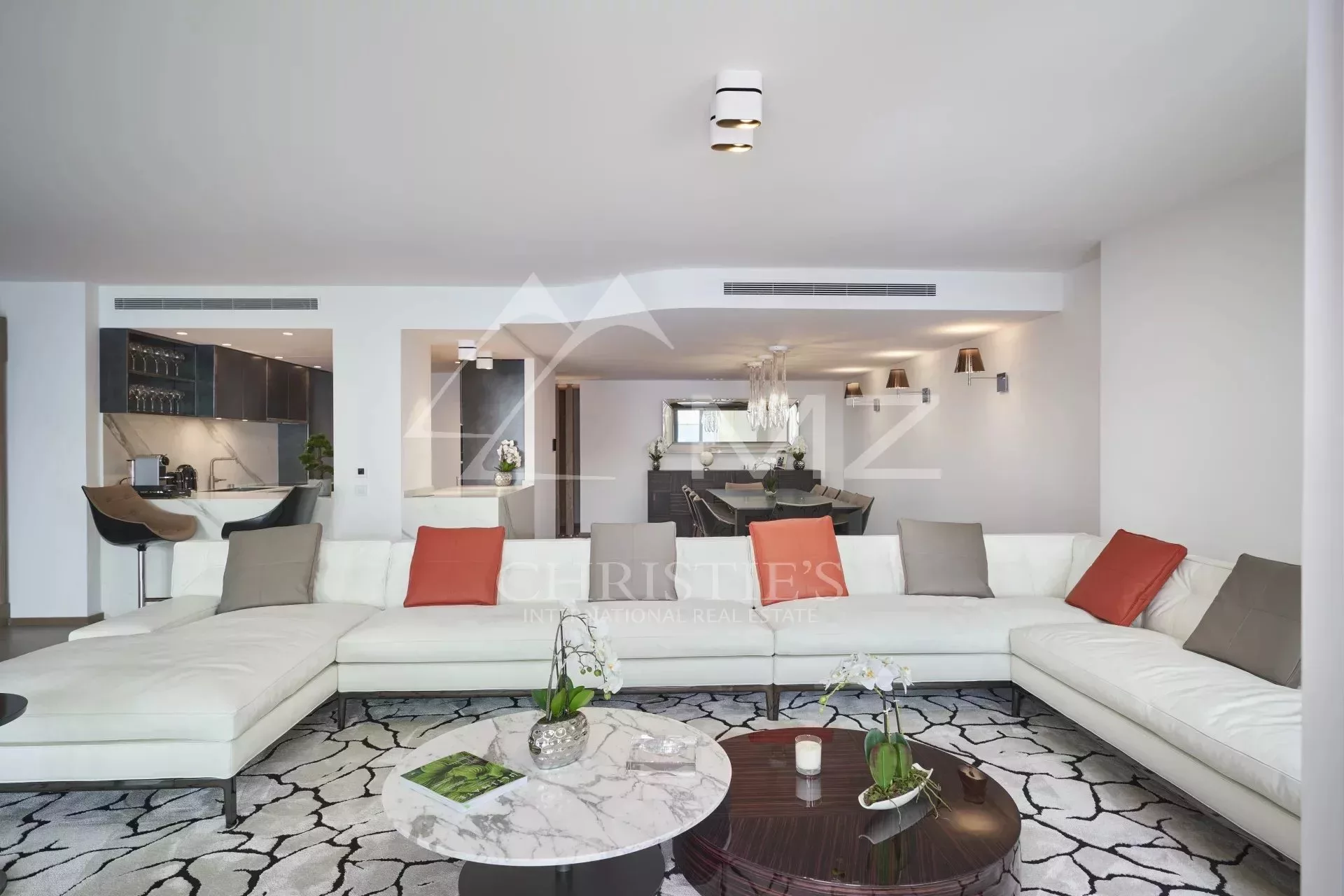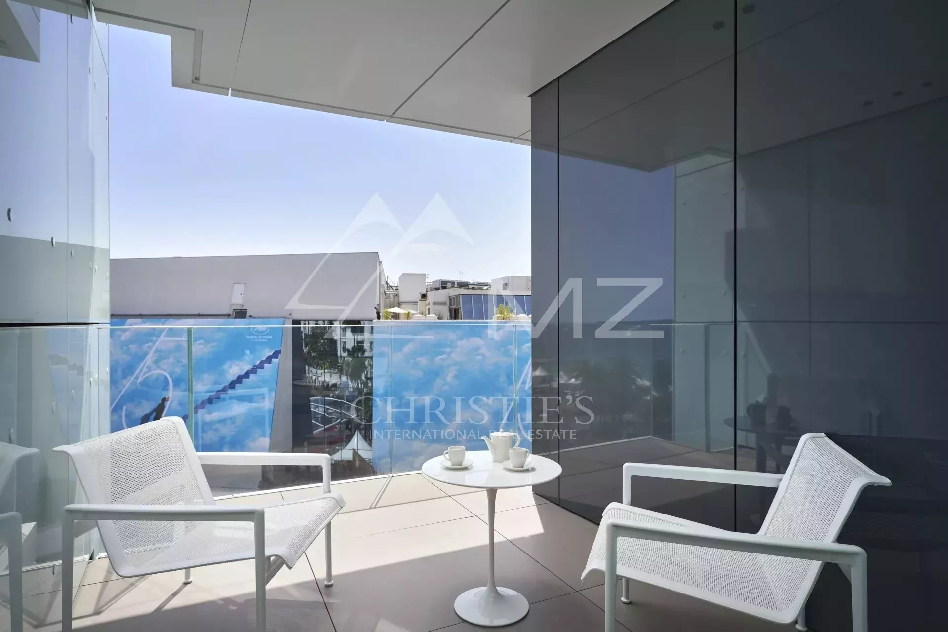602 - Situé dans un immeuble neuf de la croisette, en face du palais des festivals, appartement de 174m² environ, comprenant : un séjour, une salle à manger, une cuisine équipée, deux chambres en suite avec salle de bains et douche, et une chambre avec salle d'eau. Service conciergerie sur place. Idéal congrès et vacances.