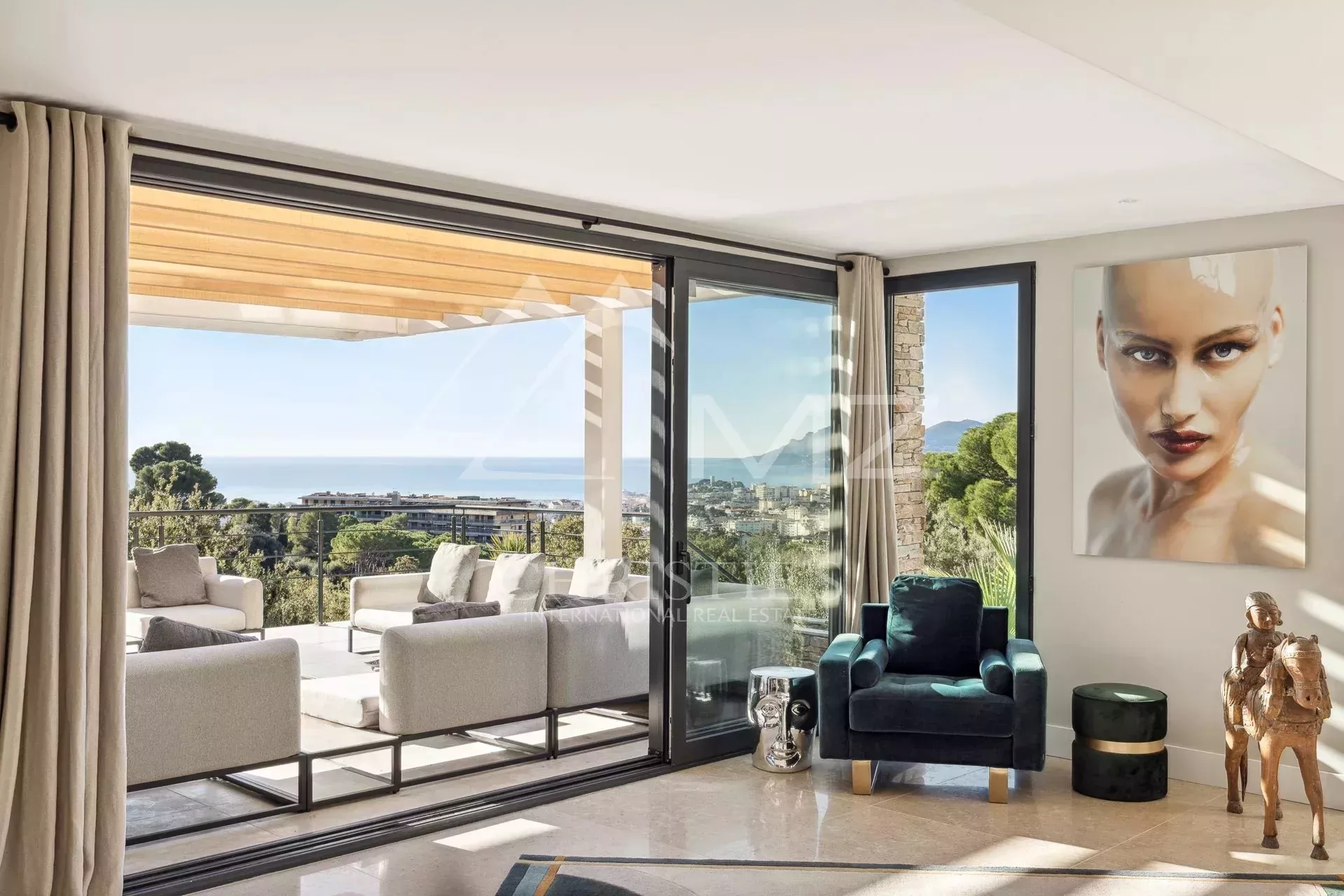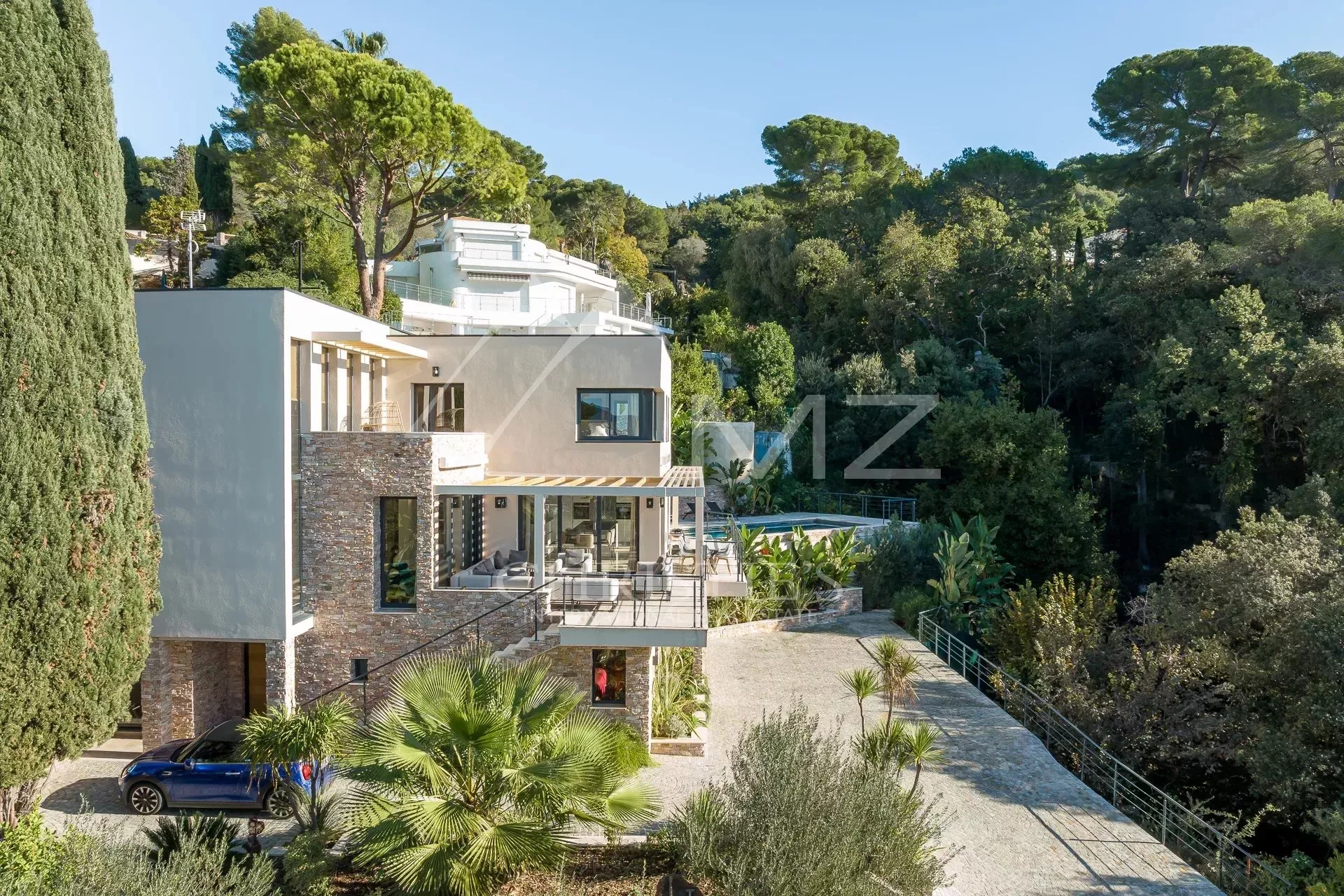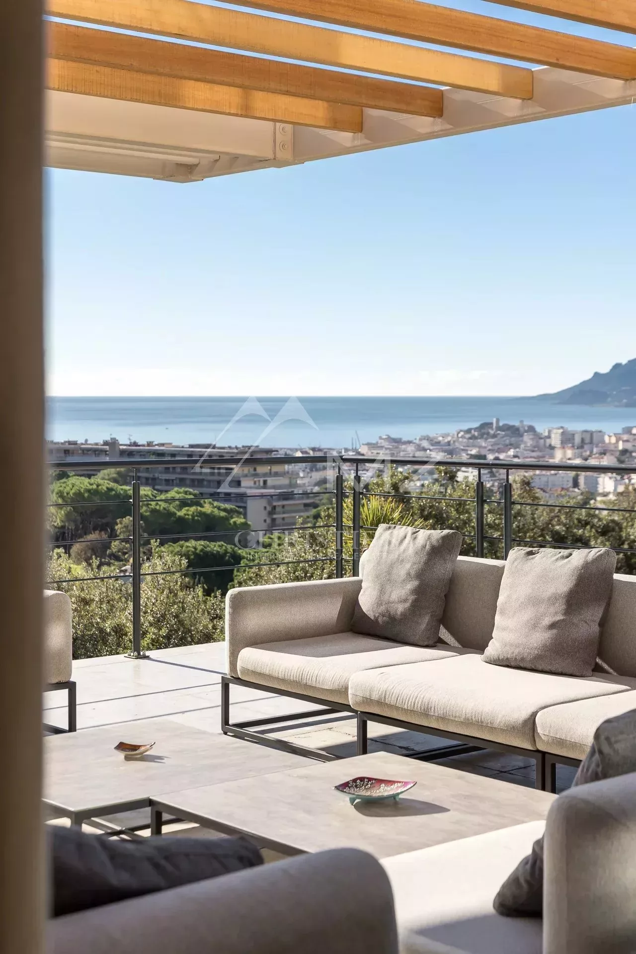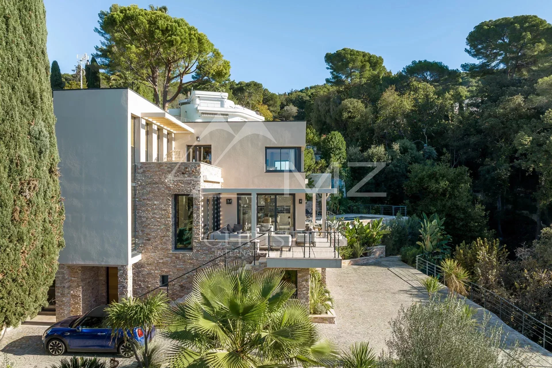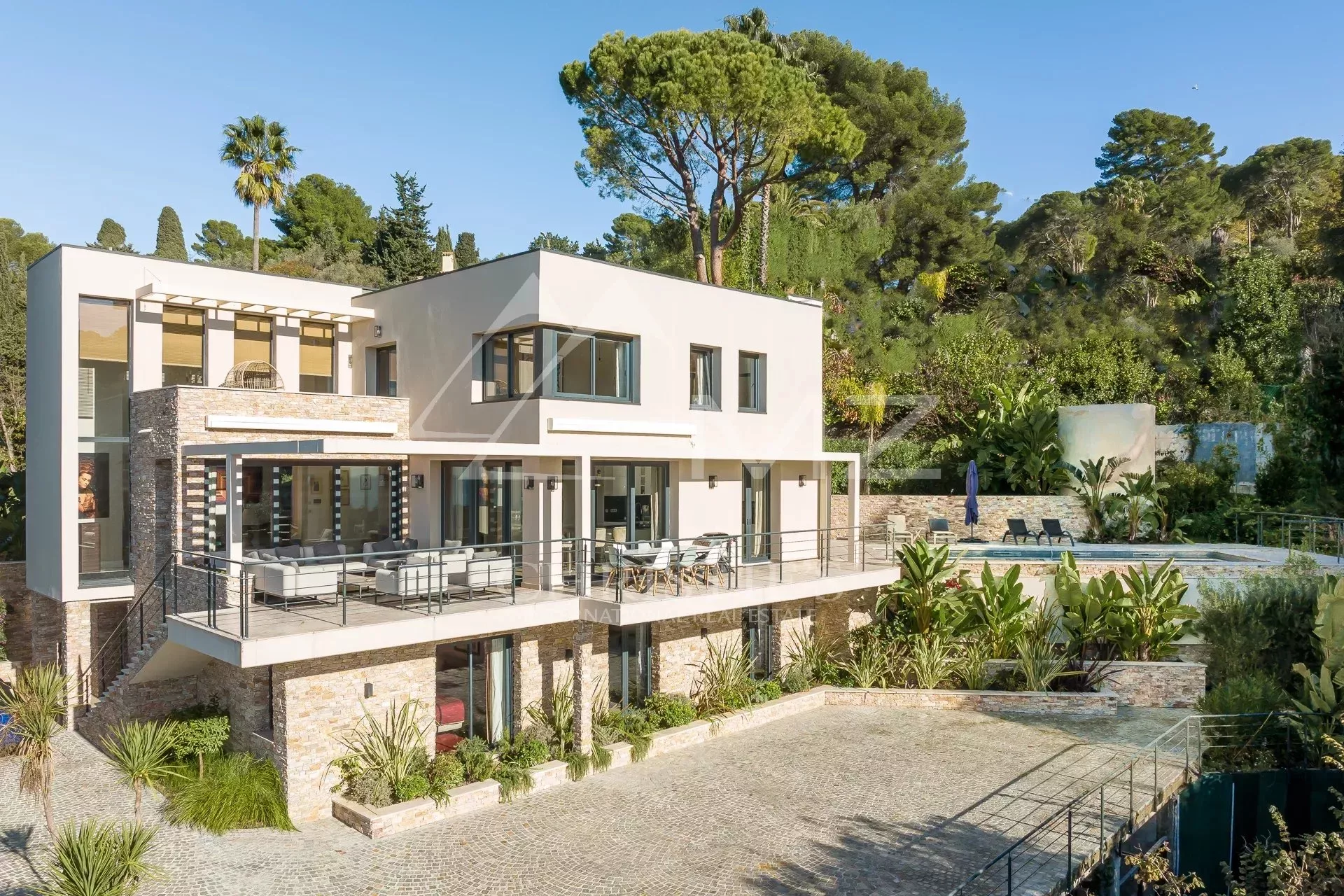 Exceptionnelle propriété contemporaine à la décoration raffinée, de 300m² environ. Offrant une vue mer sur la rade de Cannes et l'Estérel, 5 chambres en suite, salon, salle à manger, cuisine, solarium, buanderie. Terrain avec piscine chauffée entièrement paysager. Garage.