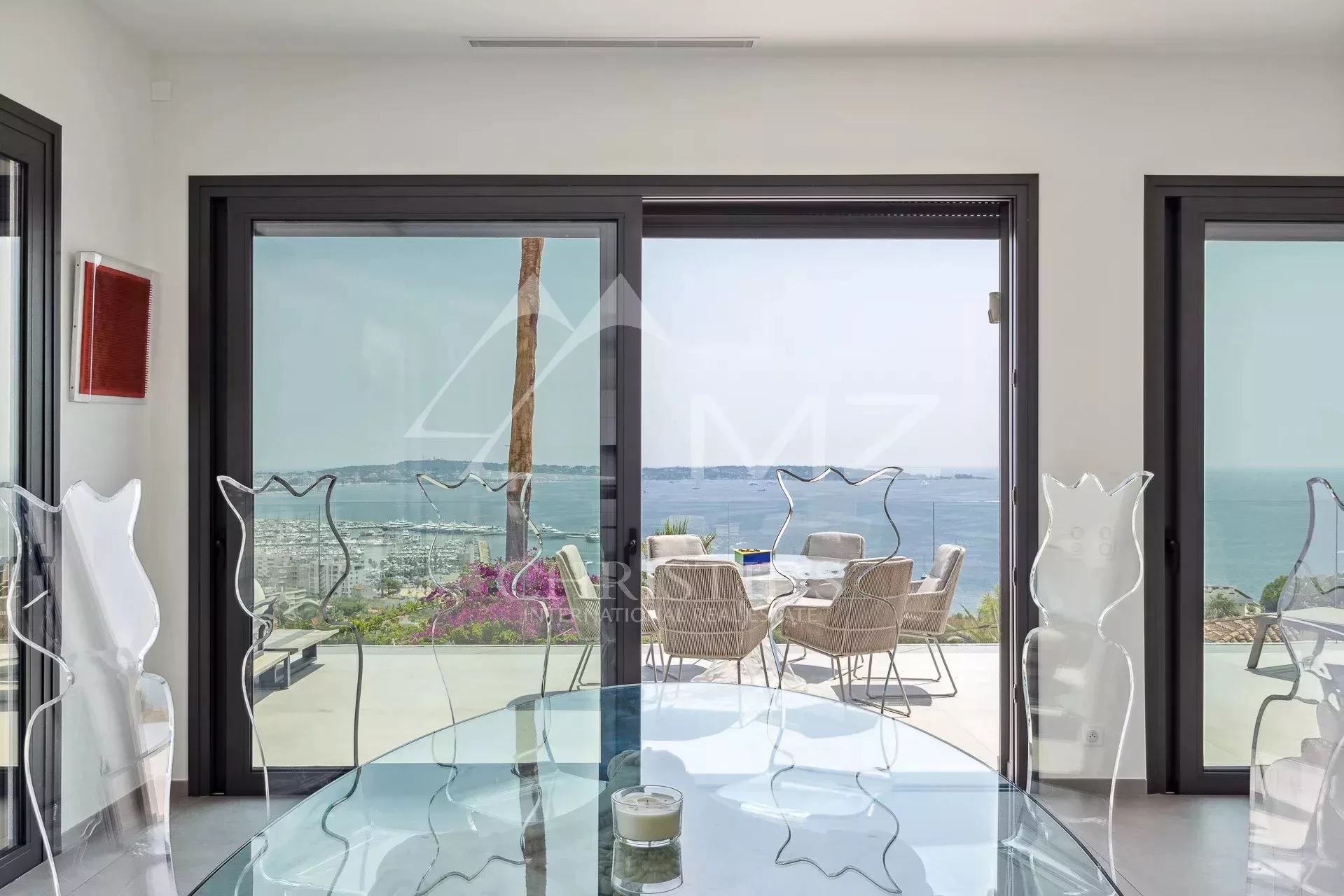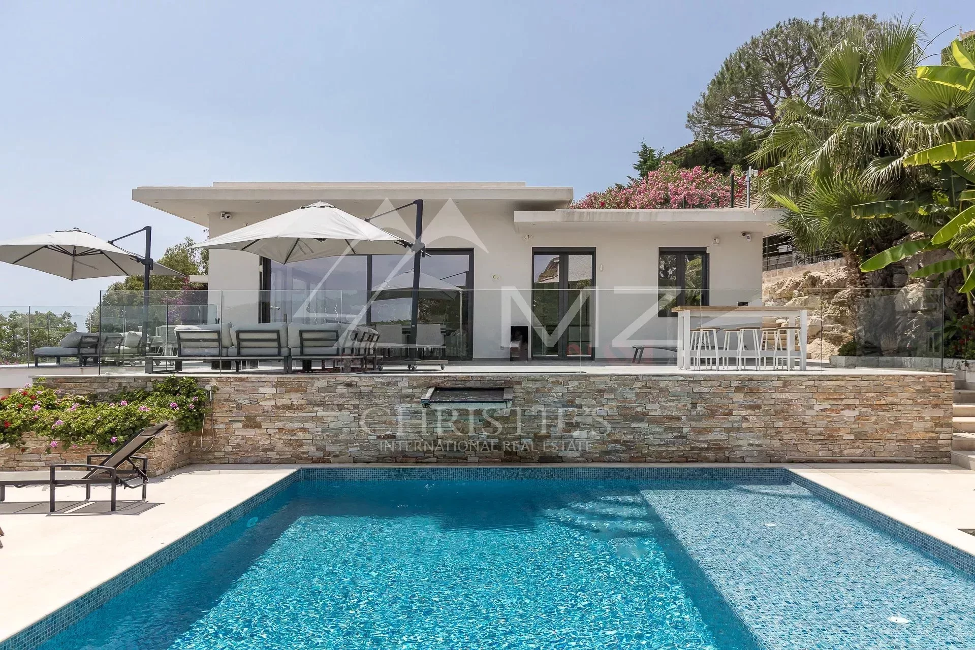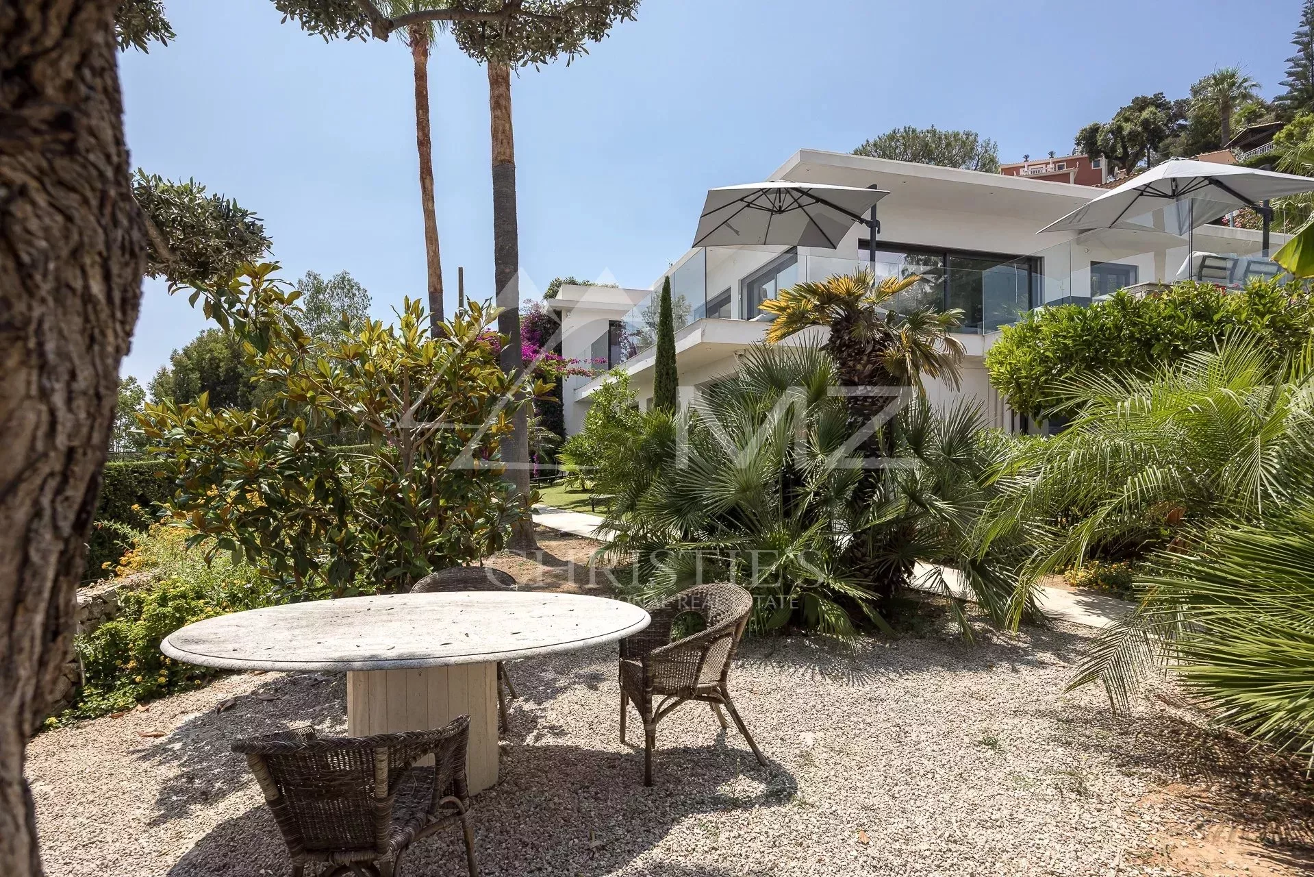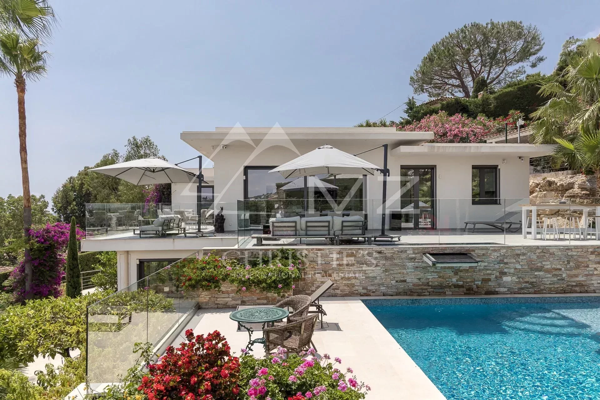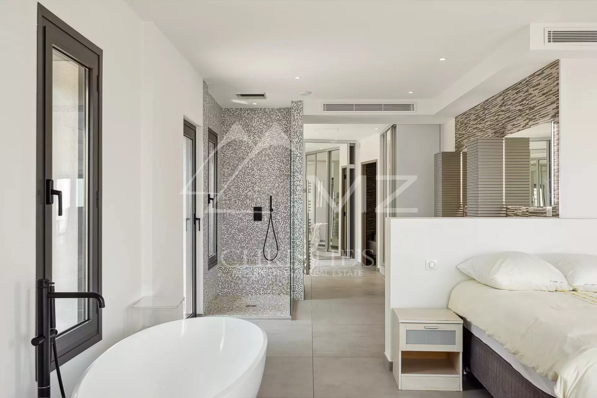 Superbe villa moderne a Golf-Juan de 419 m² environ, comprenant : A l'étage, un séjour avec salle à manger, une cuisine équipée, une chambre de maitre avec salle de douche et bain. Au rez-de-chaussée, 4 chambres en suite. Deux annexes studios. Piscine chauffée 6x11. Terrain d'environ 1500 m². Garage.
