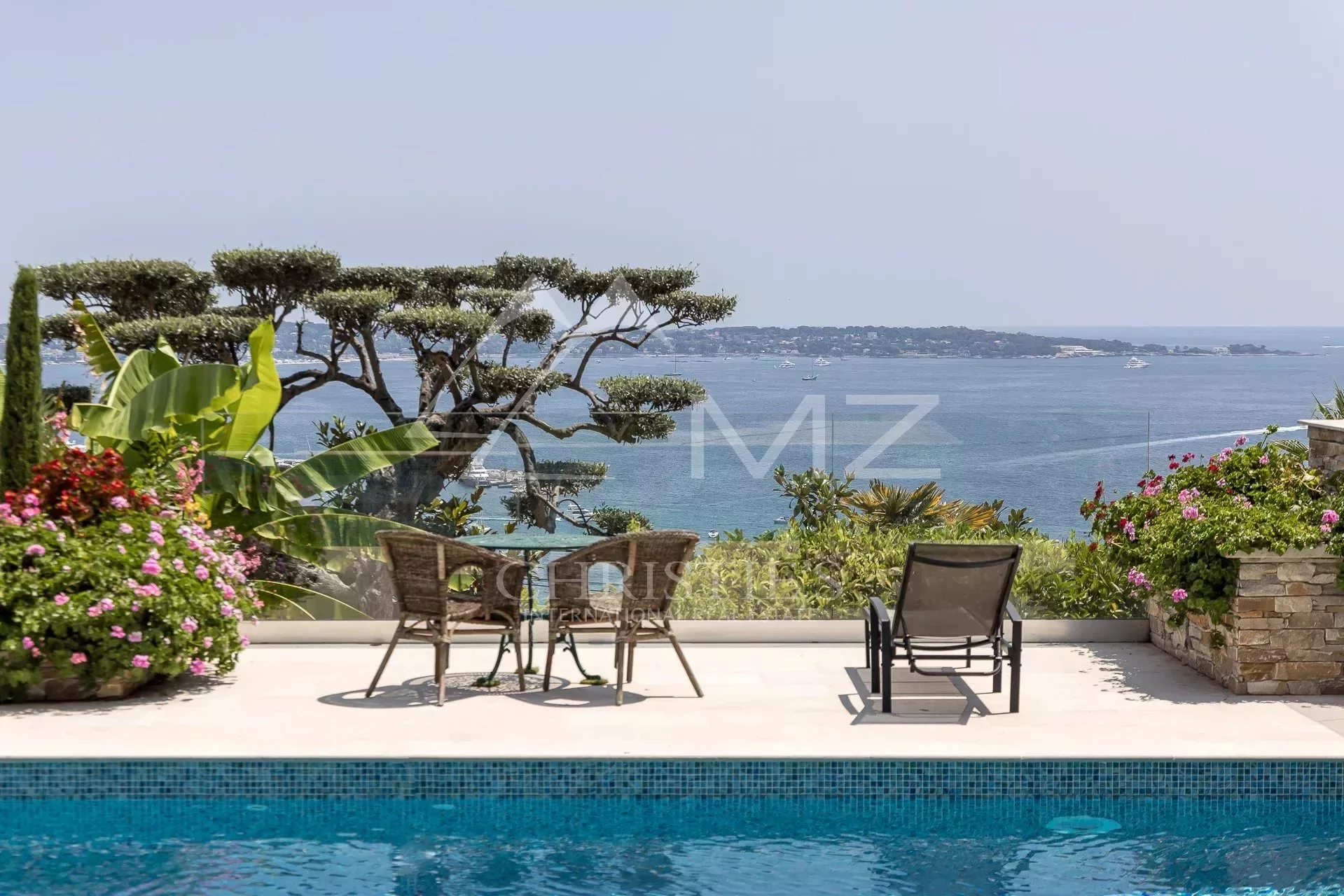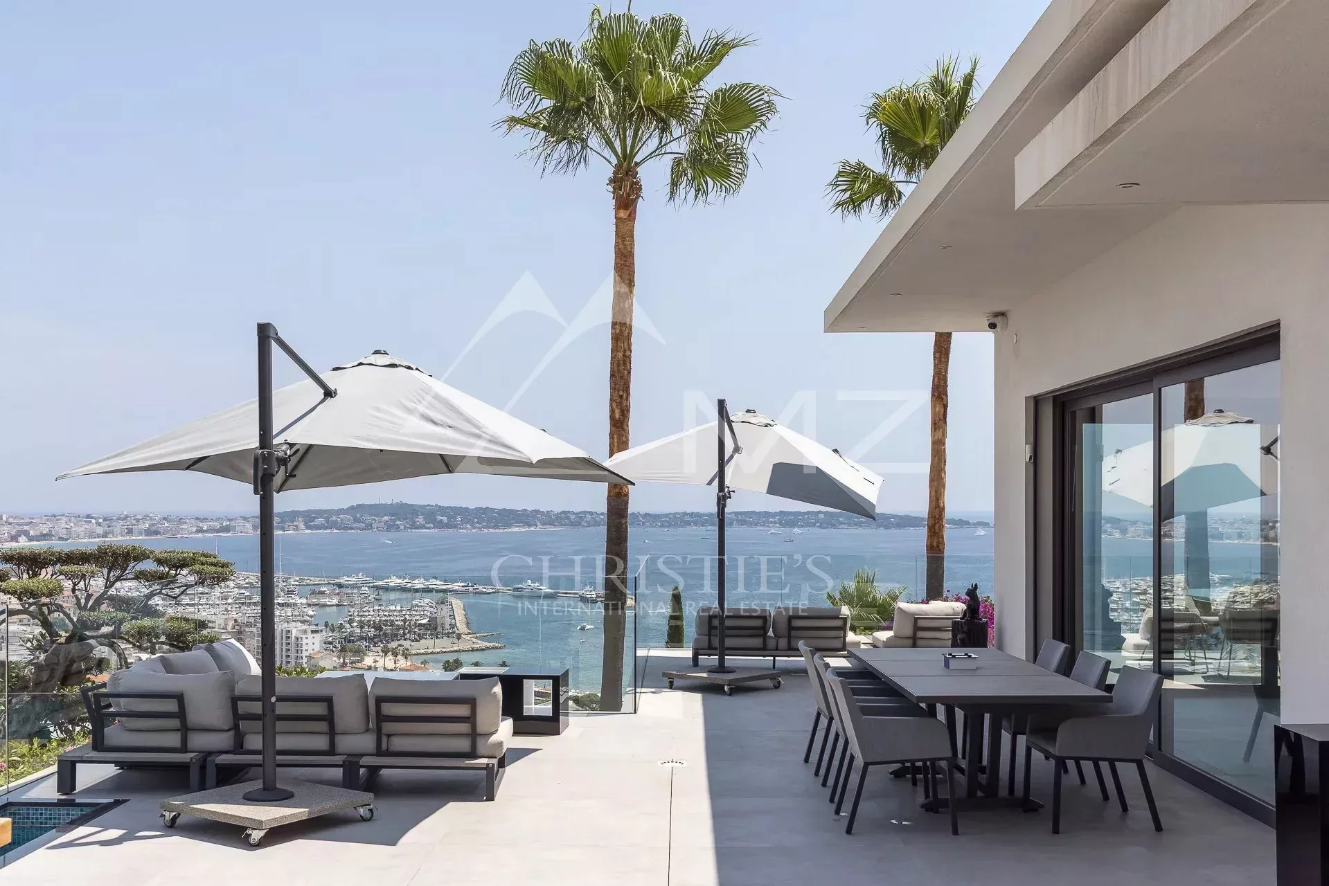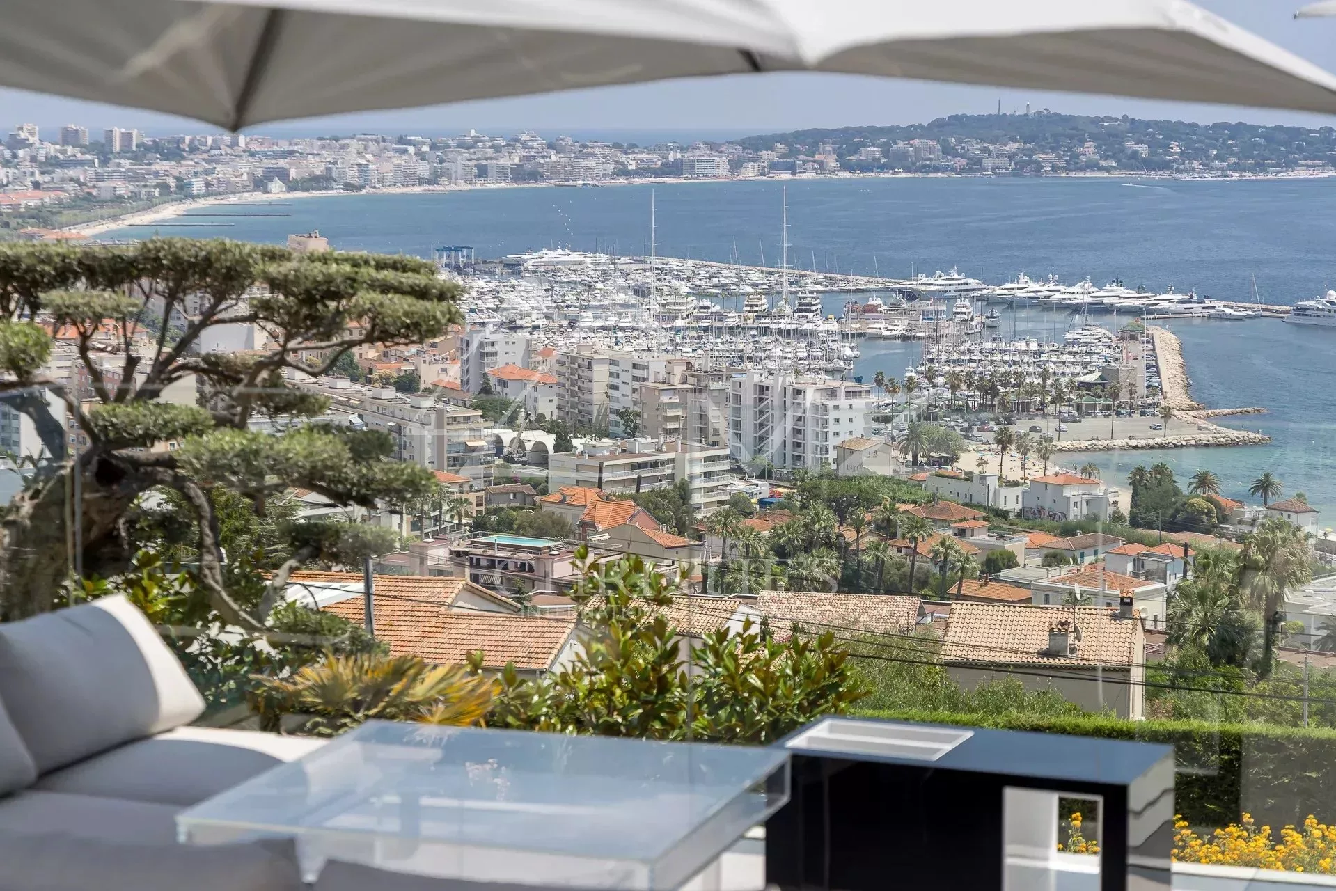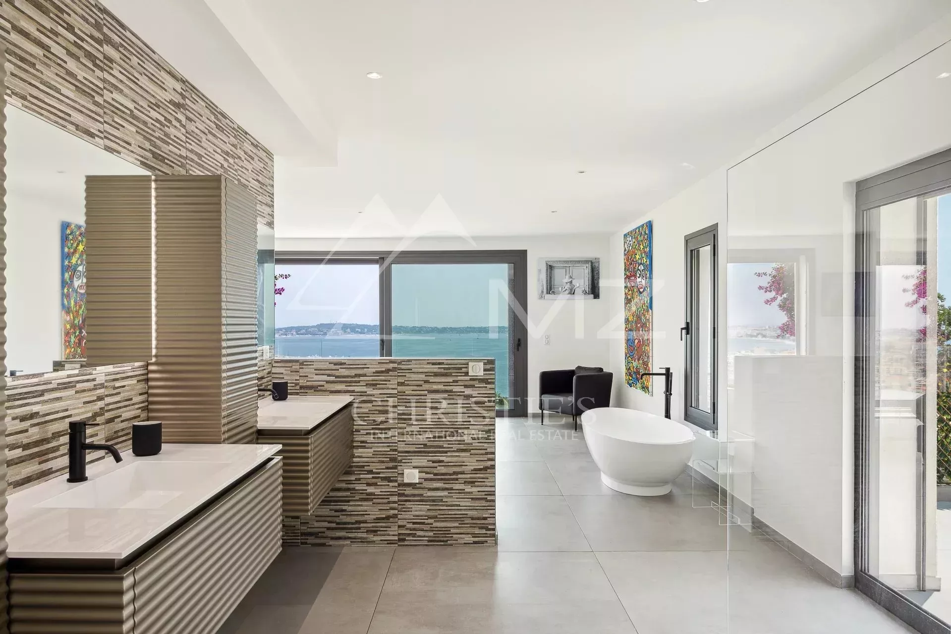 Superbe villa moderne a Golf-Juan de 419 m² environ, comprenant : A l'étage, un séjour avec salle à manger, une cuisine équipée, une chambre de maitre avec salle de douche et bain. Au rez-de-chaussée, 4 chambres en suite. Deux annexes studios. Piscine chauffée 6x11. Terrain d'environ 1500 m². Garage.