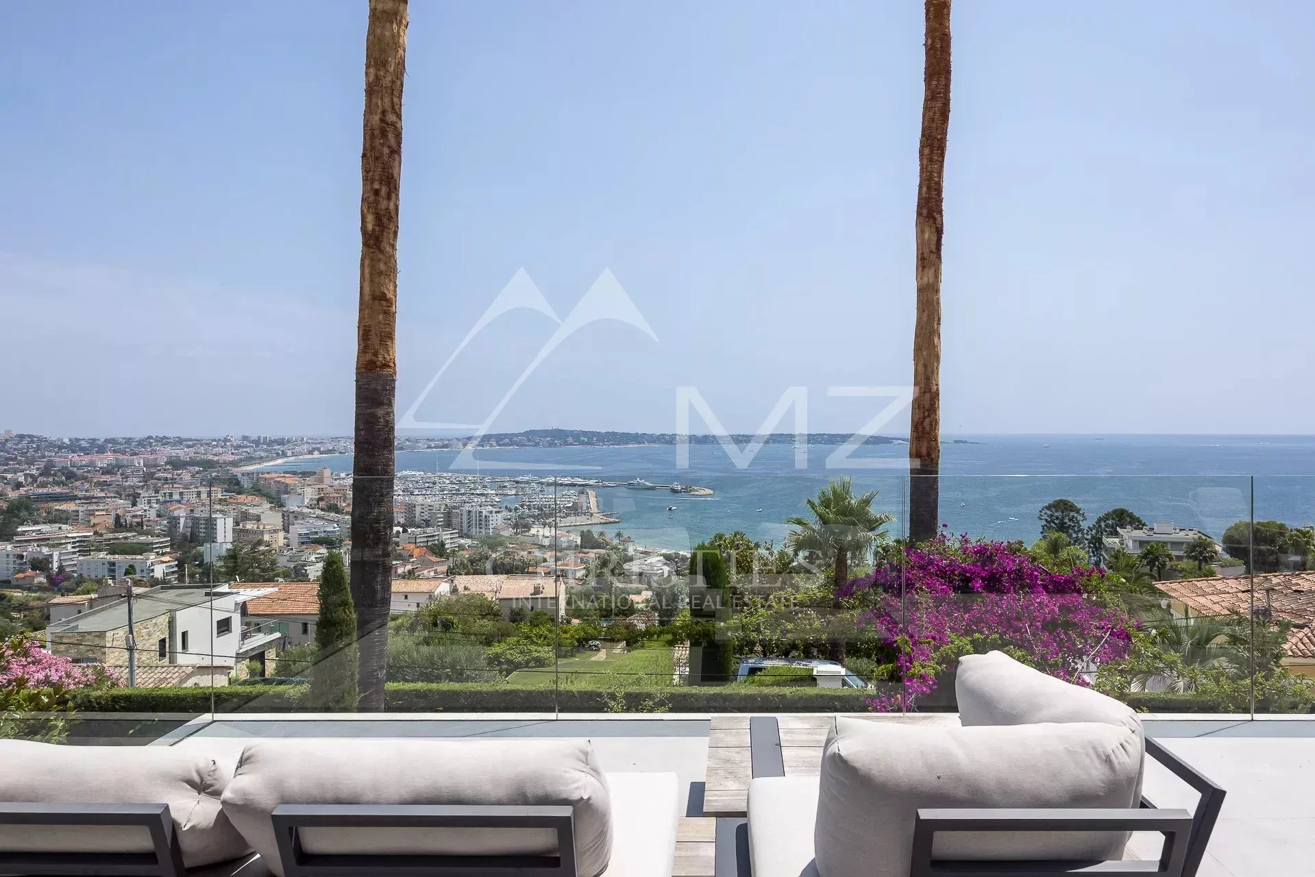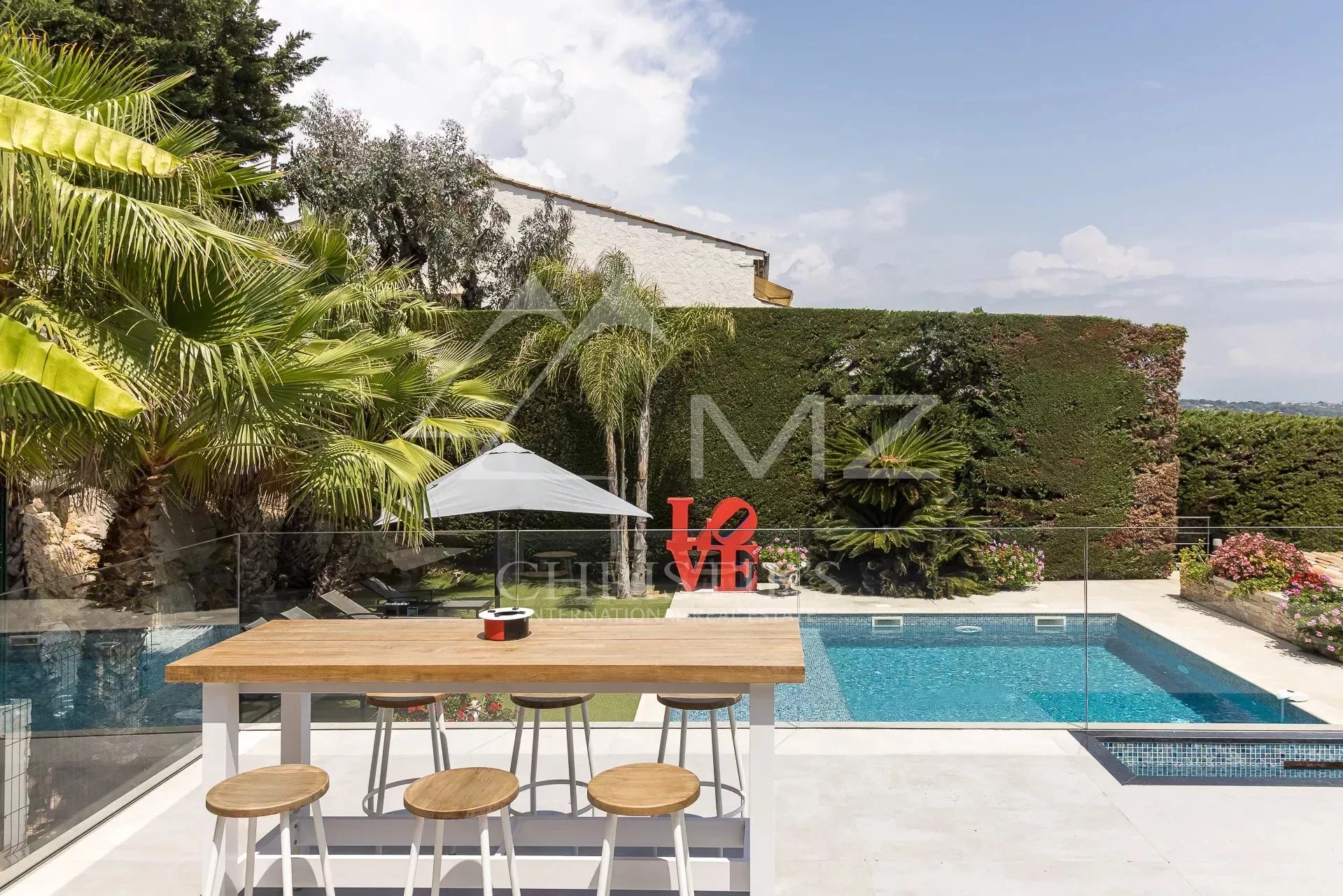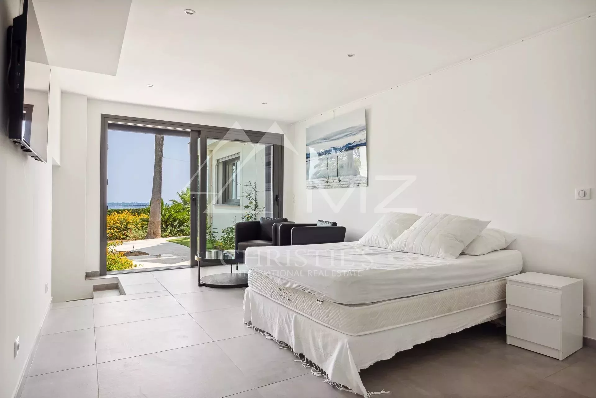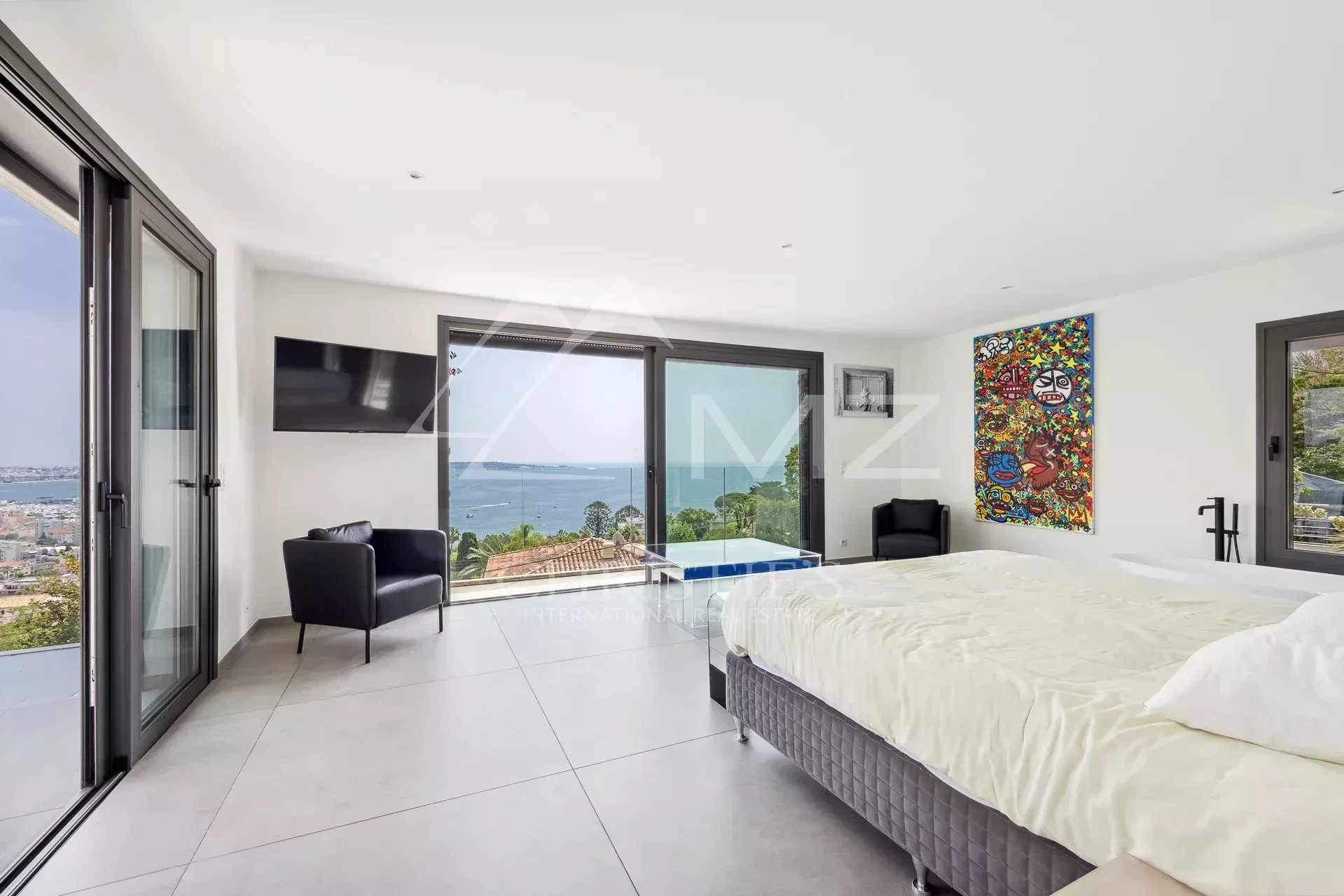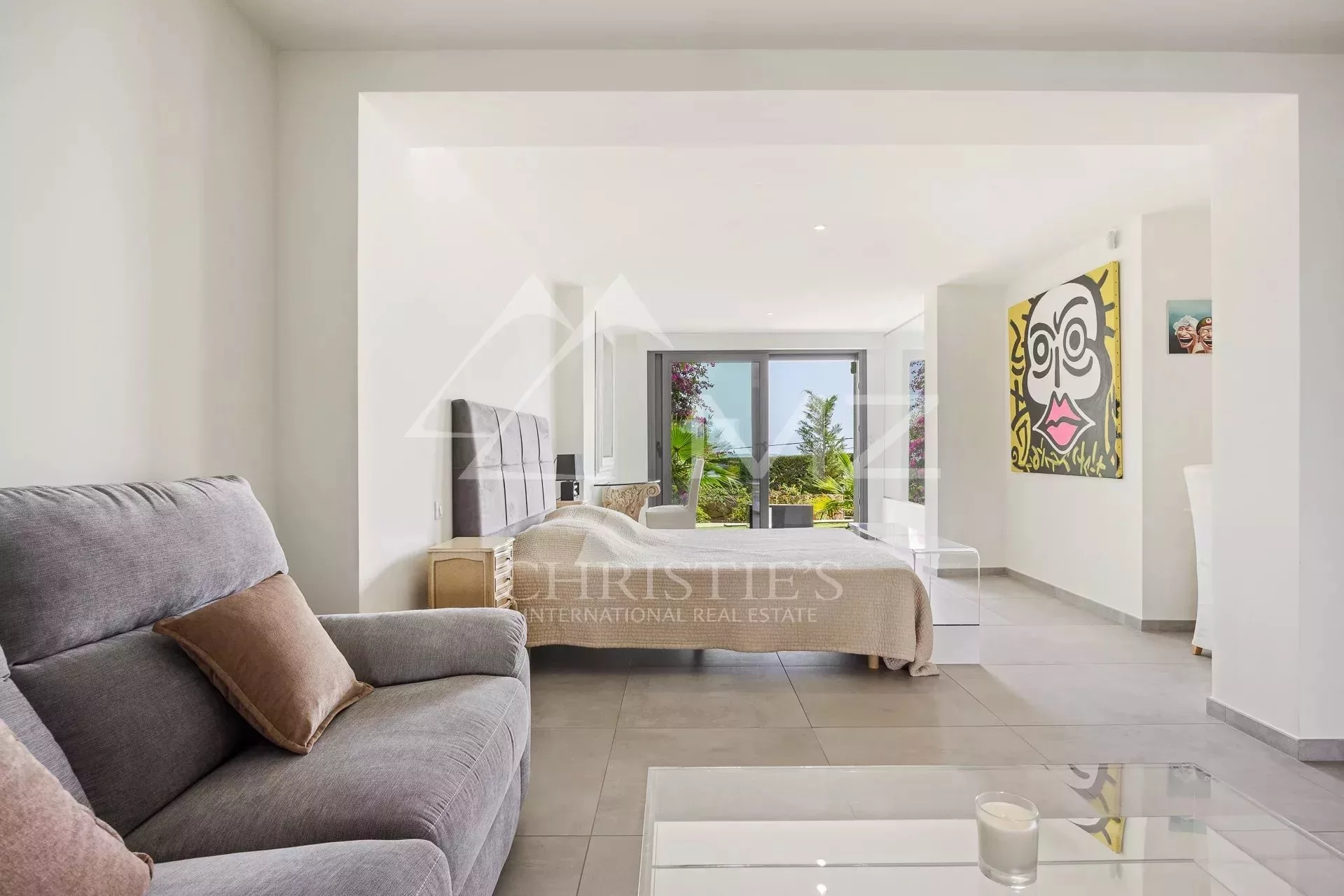 Superbe villa moderne a Golf-Juan de 419 m² environ, comprenant : A l'étage, un séjour avec salle à manger, une cuisine équipée, une chambre de maitre avec salle de douche et bain. Au rez-de-chaussée, 4 chambres en suite. Deux annexes studios. Piscine chauffée 6x11. Terrain d'environ 1500 m². Garage.