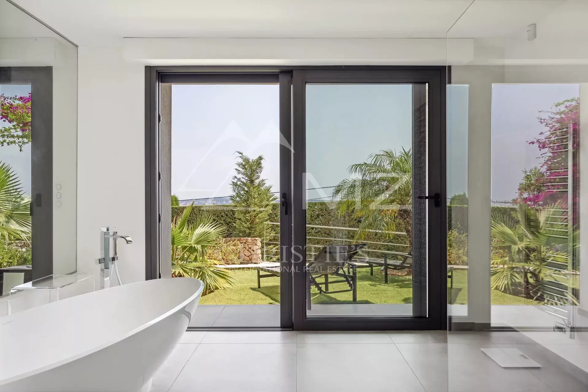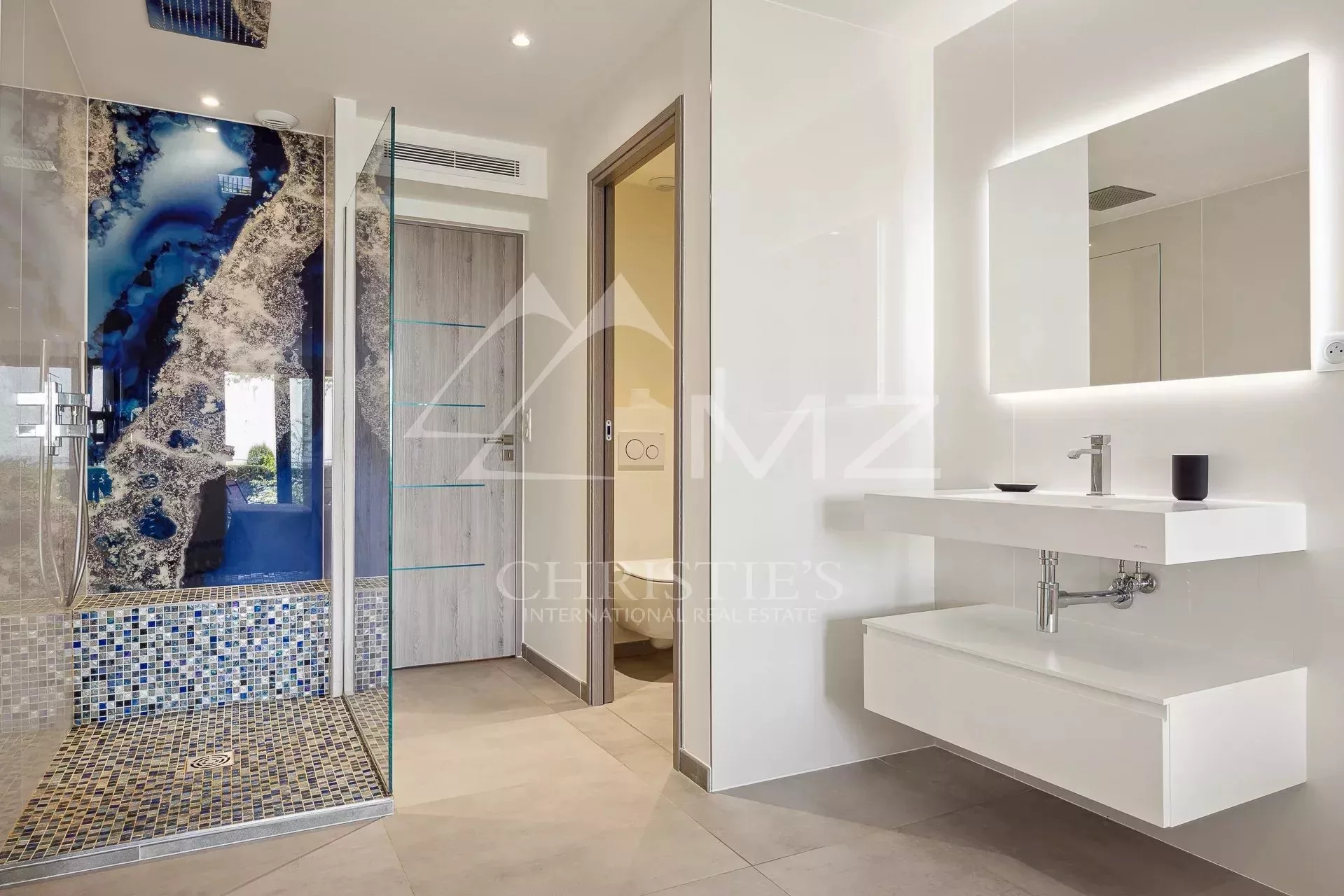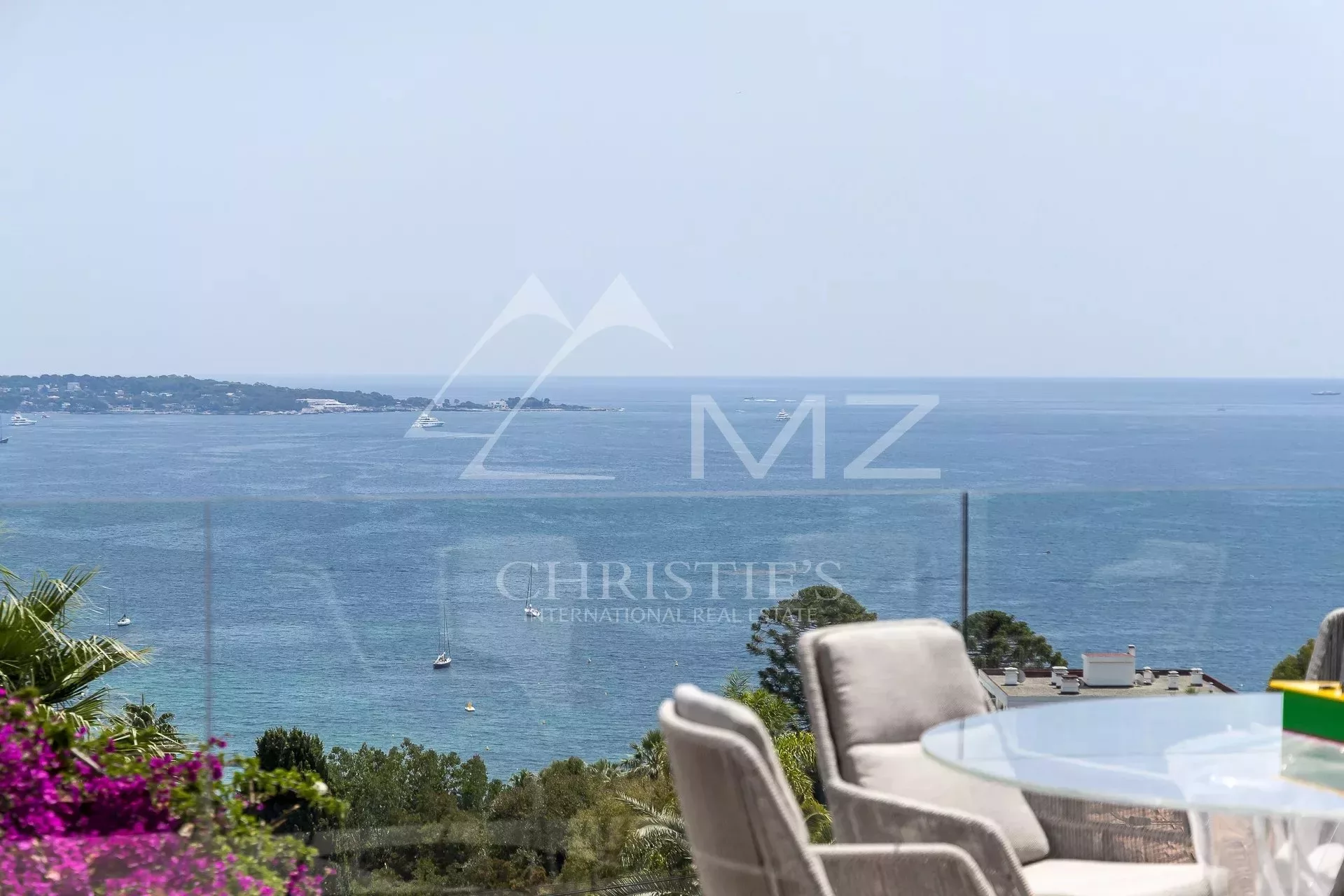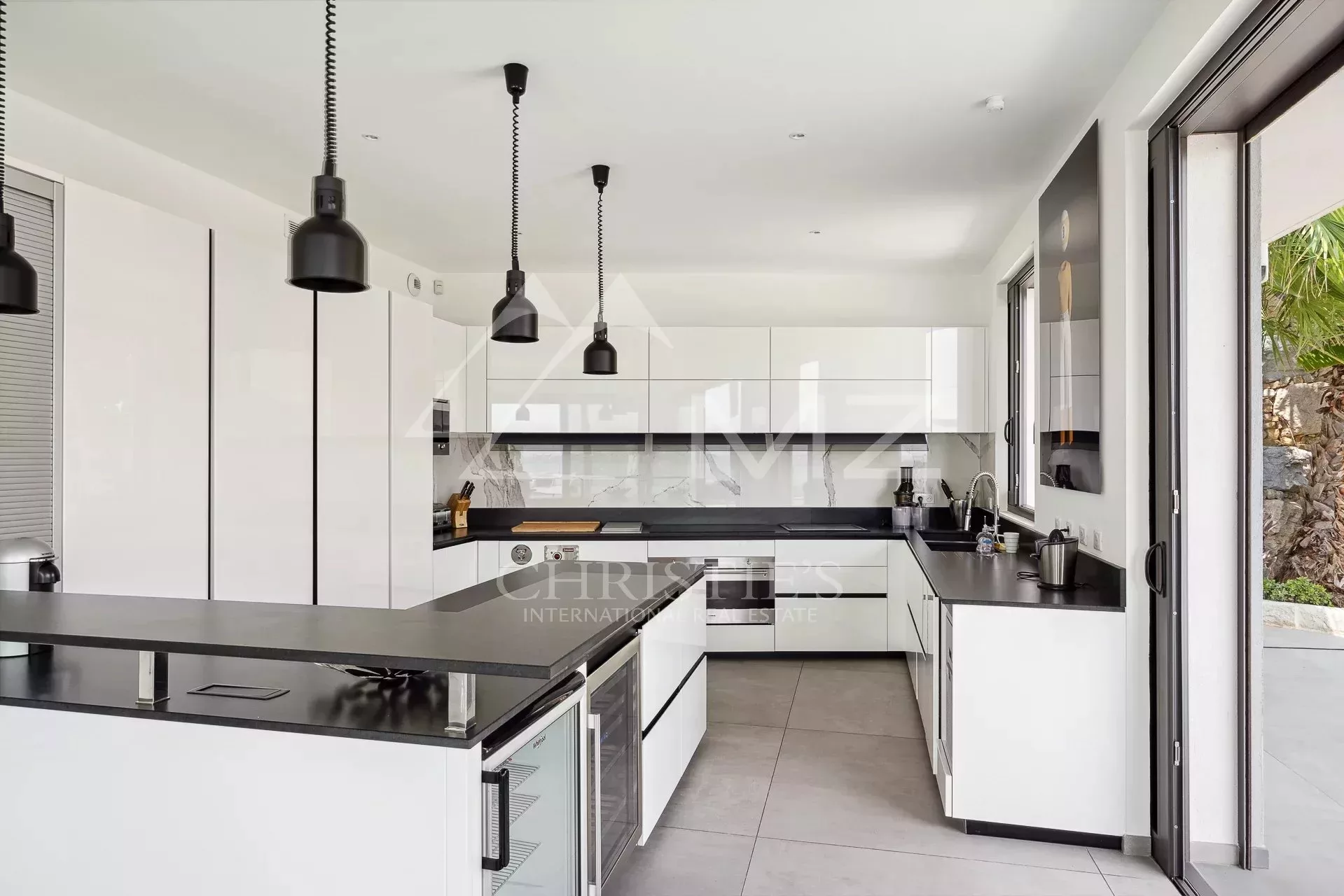 Superbe villa moderne a Golf-Juan de 419 m² environ, comprenant : A l'étage, un séjour avec salle à manger, une cuisine équipée, une chambre de maitre avec salle de douche et bain. Au rez-de-chaussée, 4 chambres en suite. Deux annexes studios. Piscine chauffée 6x11. Terrain d'environ 1500 m². Garage.
