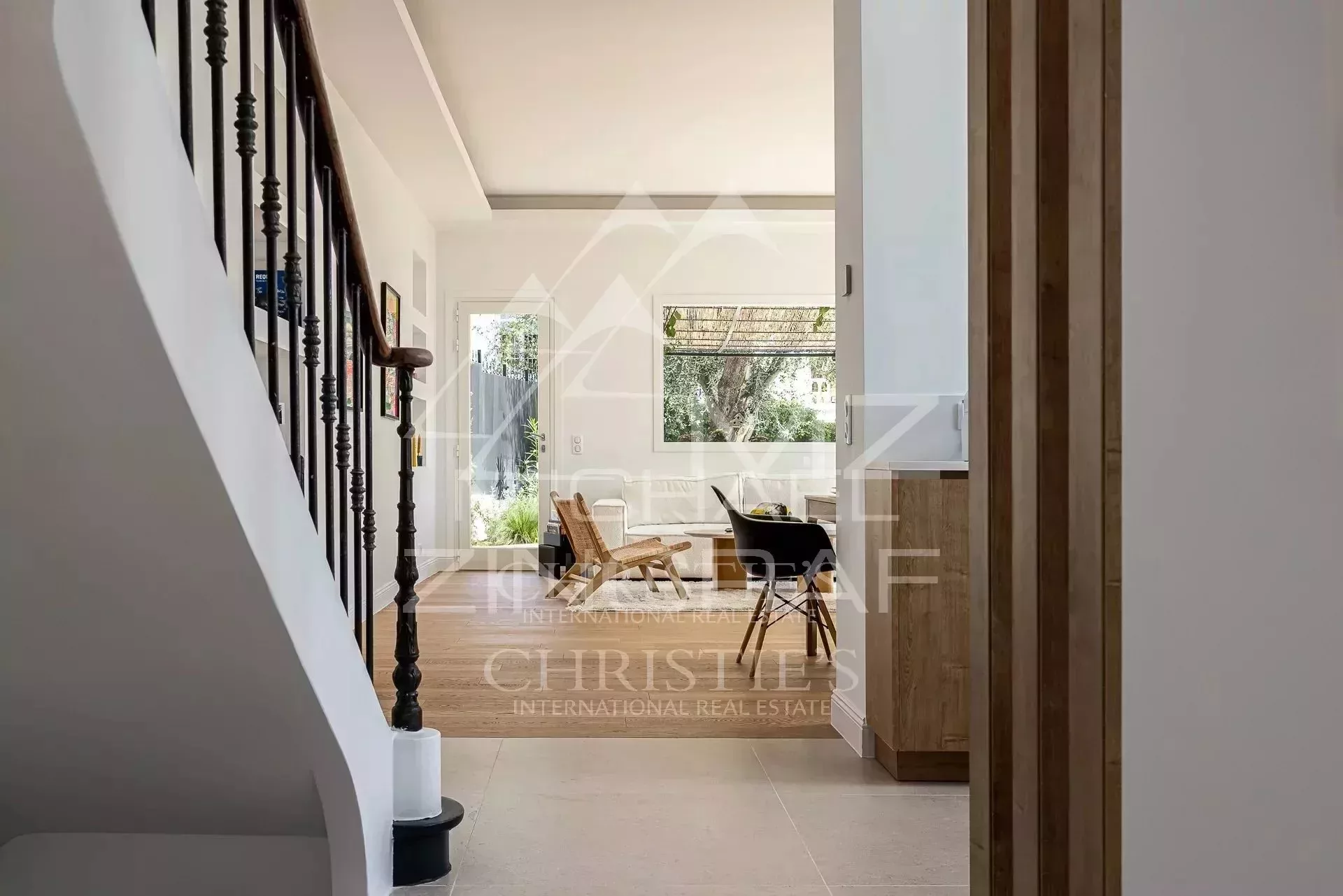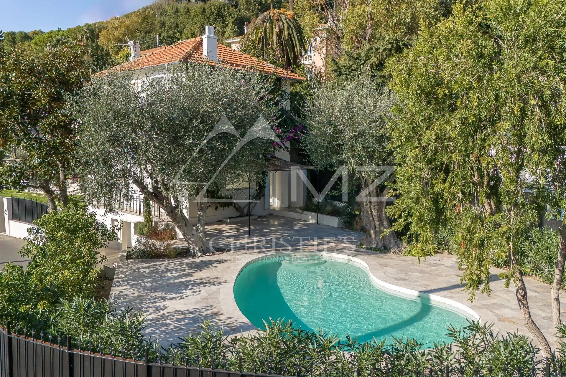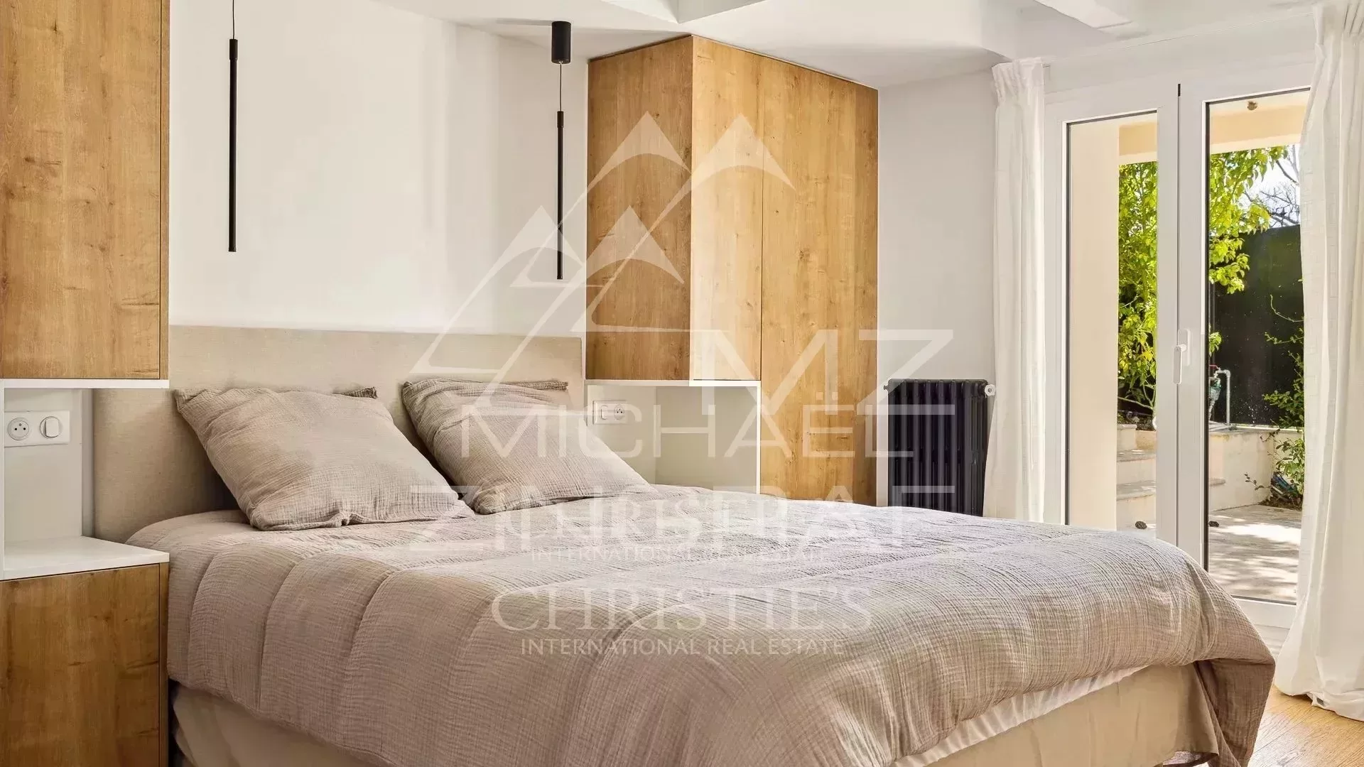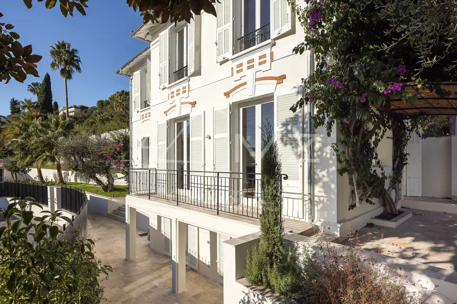 Idéalement située à proximité immédiate du centre historique du Cannet, des commerces et de la place Bellevue, étonnante villa des années 30, d'environ 165m², entièrement rénovée, comprenant 5 chambres en suite dont un studio indépendant.