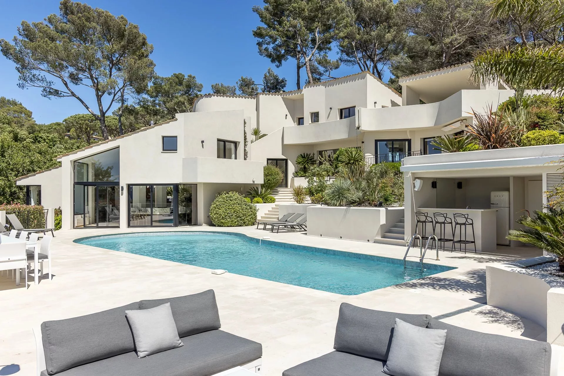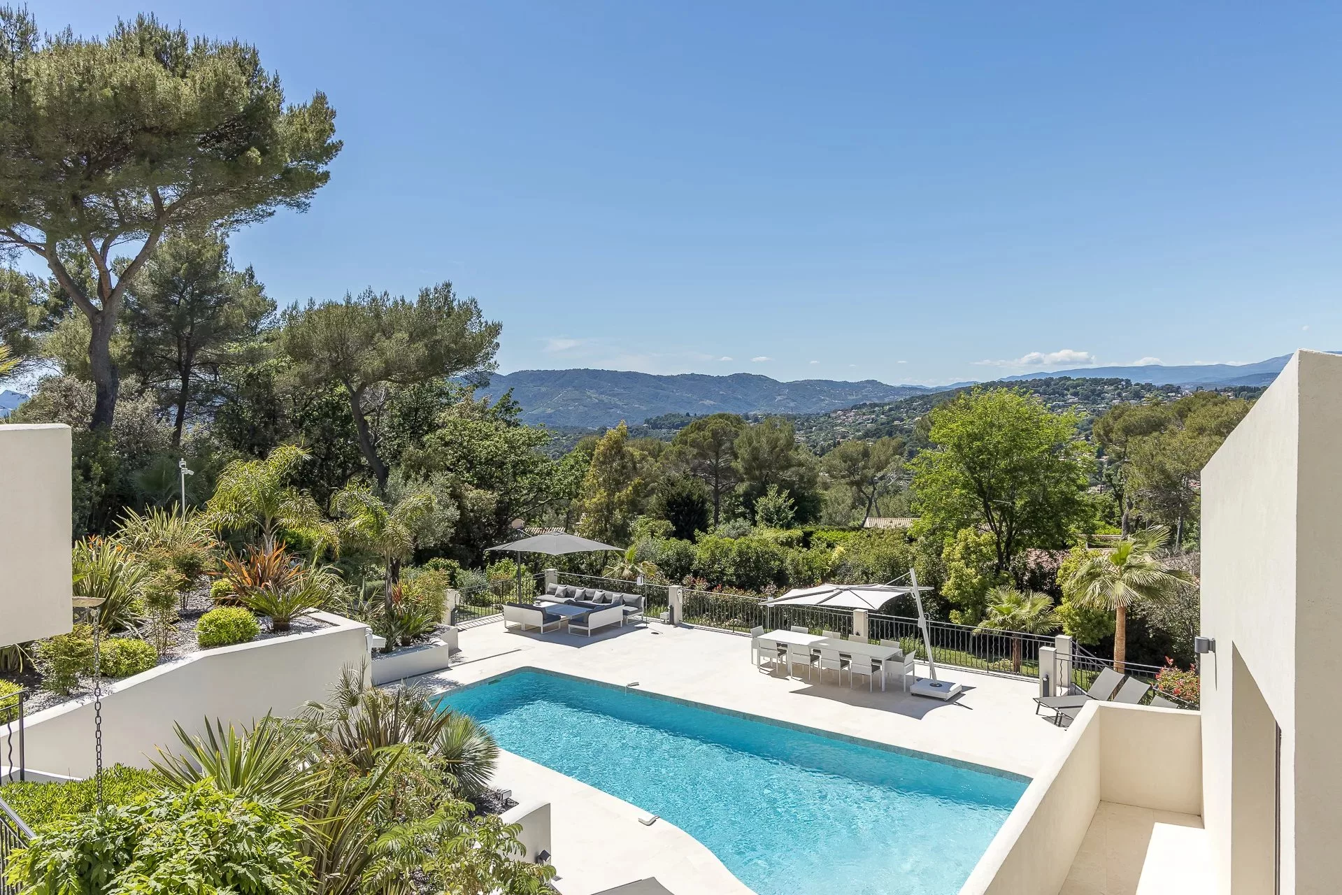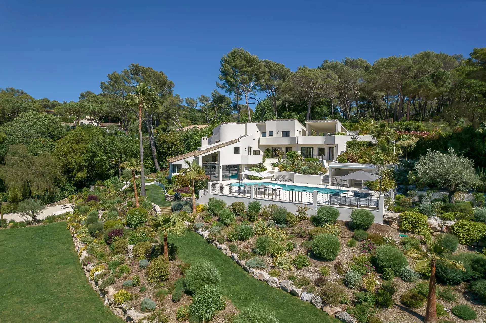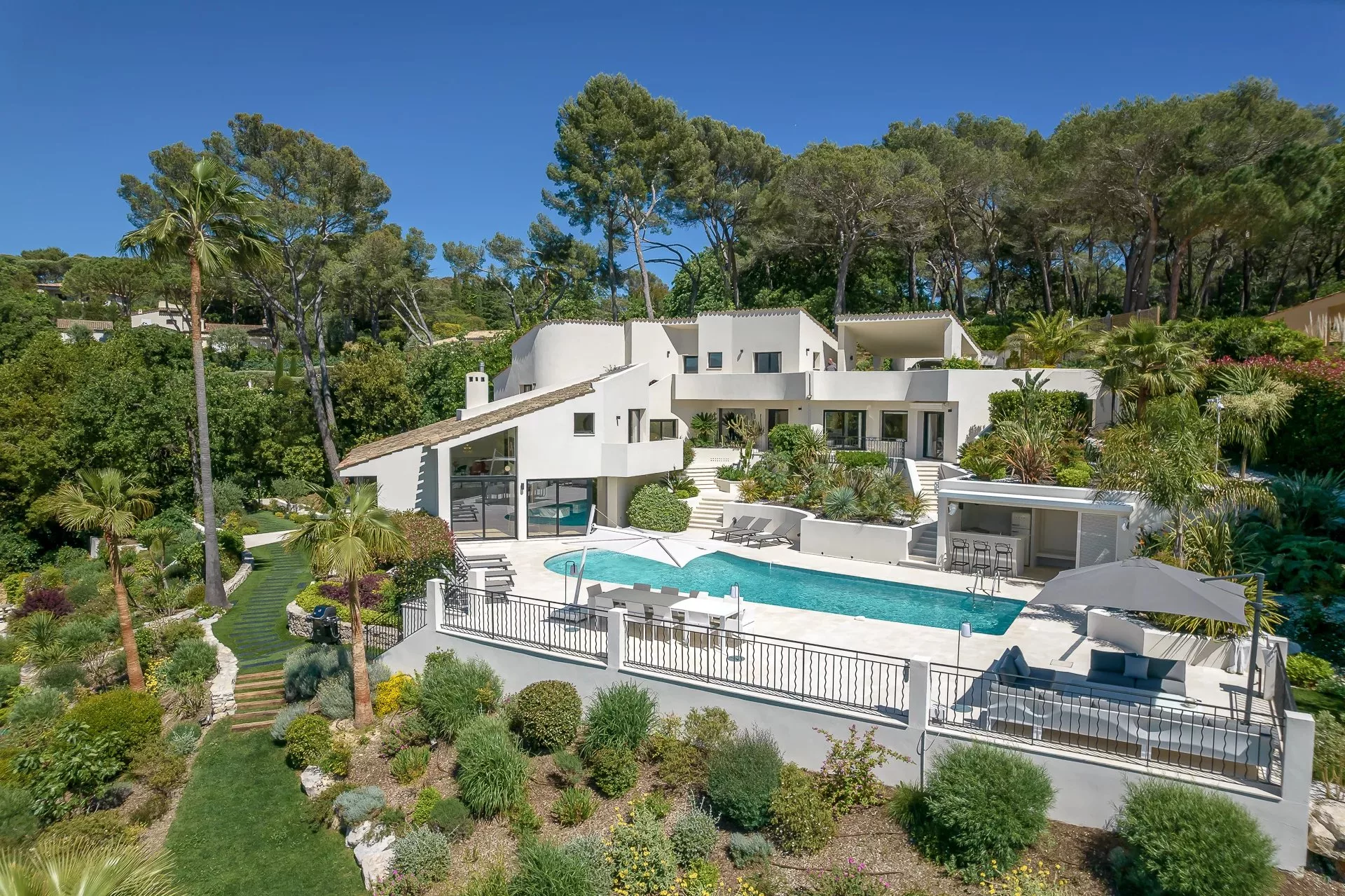 Située dans un domaine privé, dans un quartier calme et résidentiel, cette villa de 450m² à la position dominante offre 5 chambres doubles et 5 salles de bain/douche en suite, avec une vue dégagée sur les collines environnantes et le village de Mougins. Rénovée avec goût et offrant des prestations haut de gamme, cette propriété propose également de nombreux espaces de détente intérieur et extérieur avec une triple réception ouvrant sur la piscine et ses nombreuses terrasses aménagées. Piscine chauffée au sel de 17m. Pool house avec bar, douche et toilettes.