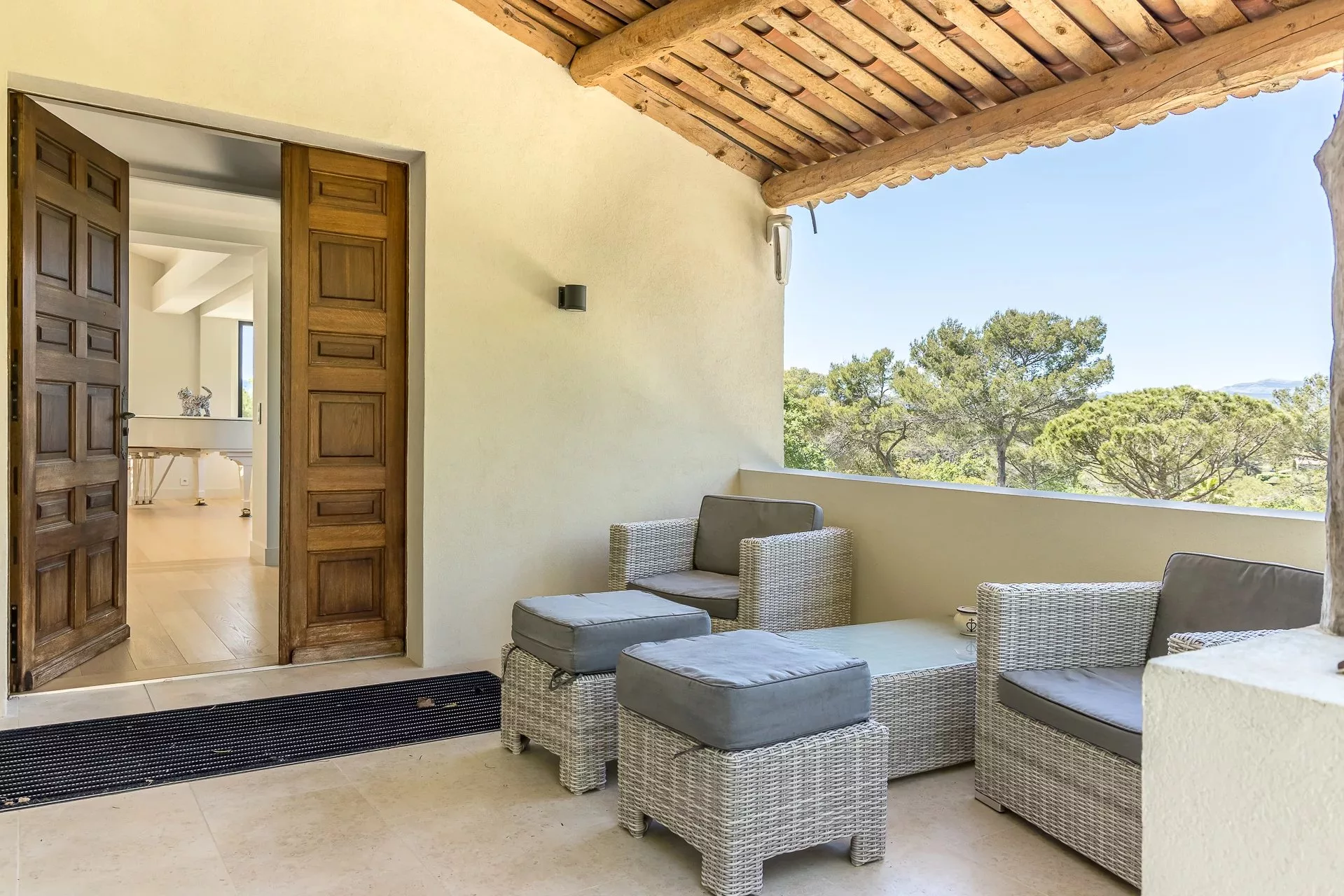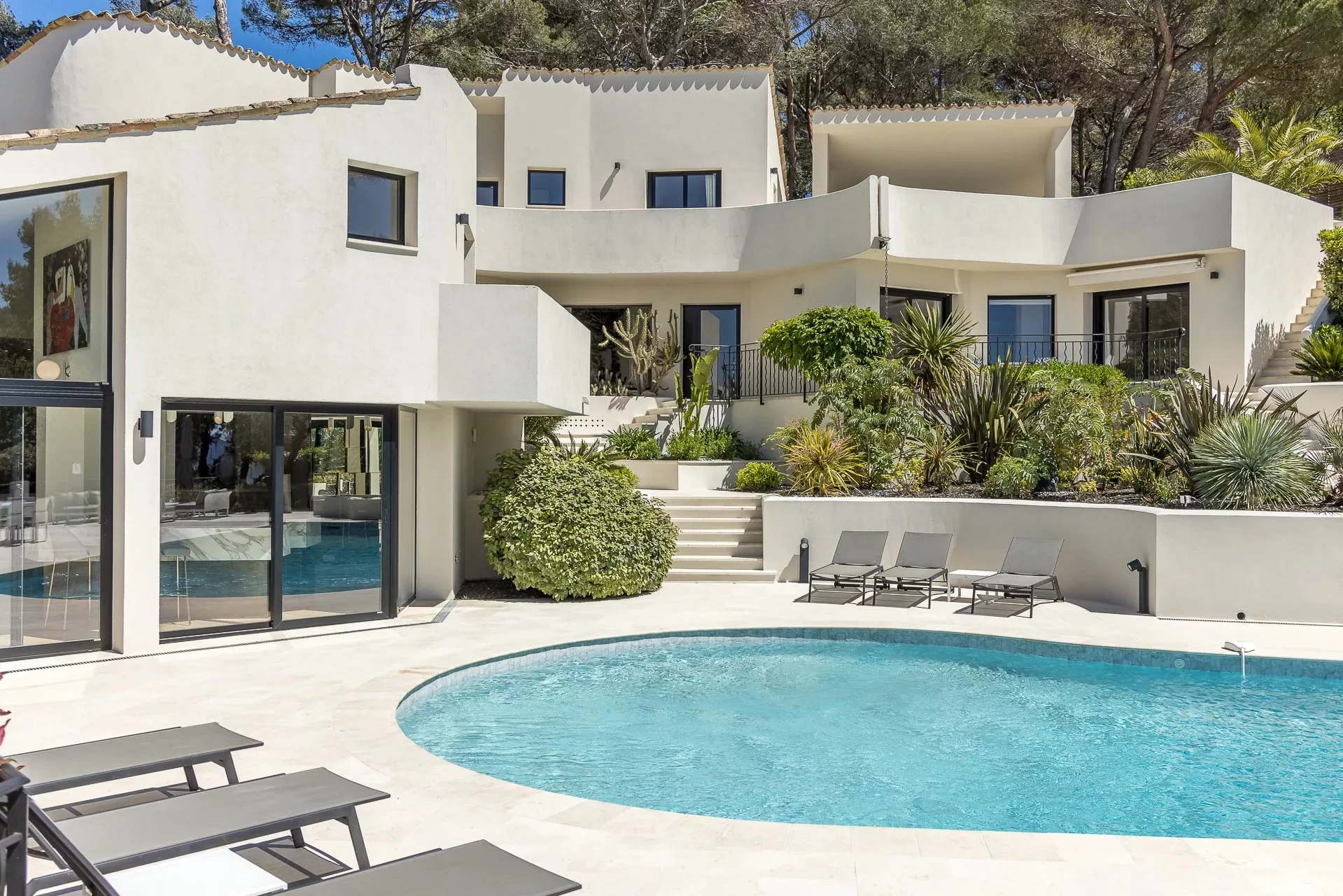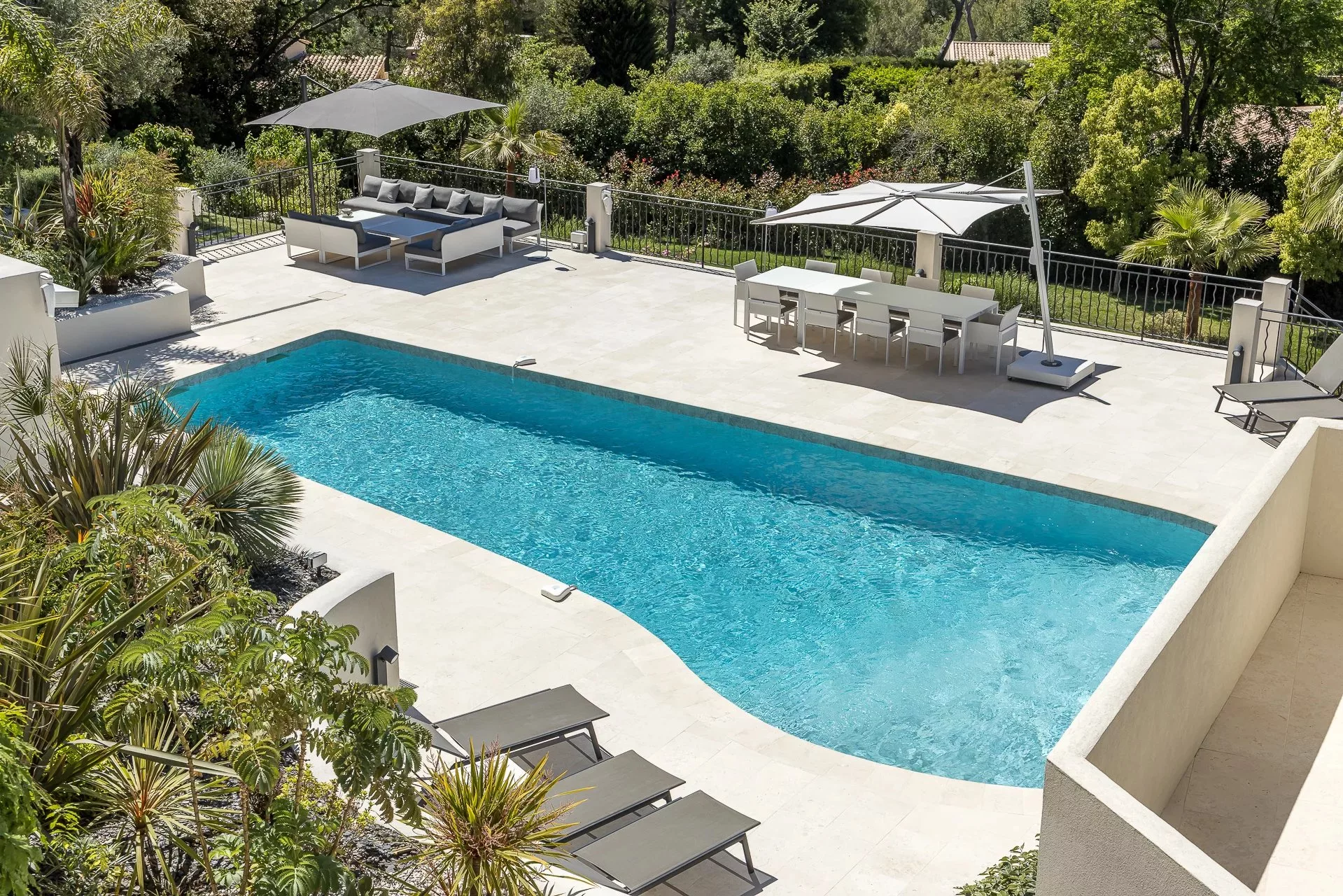 Située dans un domaine privé, dans un quartier calme et résidentiel, cette villa de 450m² à la position dominante offre 5 chambres doubles et 5 salles de bain/douche en suite, avec une vue dégagée sur les collines environnantes et le village de Mougins. Rénovée avec goût et offrant des prestations haut de gamme, cette propriété propose également de nombreux espaces de détente intérieur et extérieur avec une triple réception ouvrant sur la piscine et ses nombreuses terrasses aménagées. Piscine chauffée au sel de 17m. Pool house avec bar, douche et toilettes.