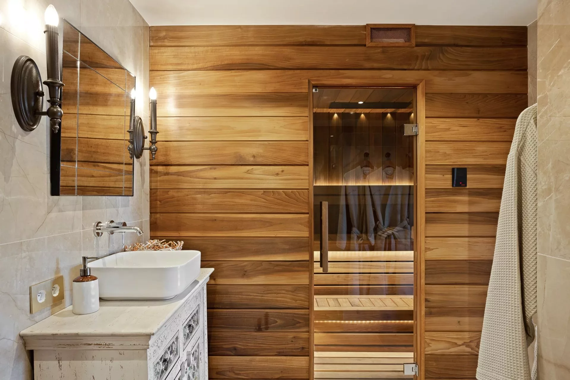Le plus de cette villa : un bel espace SPA avec sauna, jacuzzi pour 2 personnes, grande douche avec système son et lumière Aquasymphony, sans oublier son espace salon et son coin détente avec thé et café (SPA en supplément).