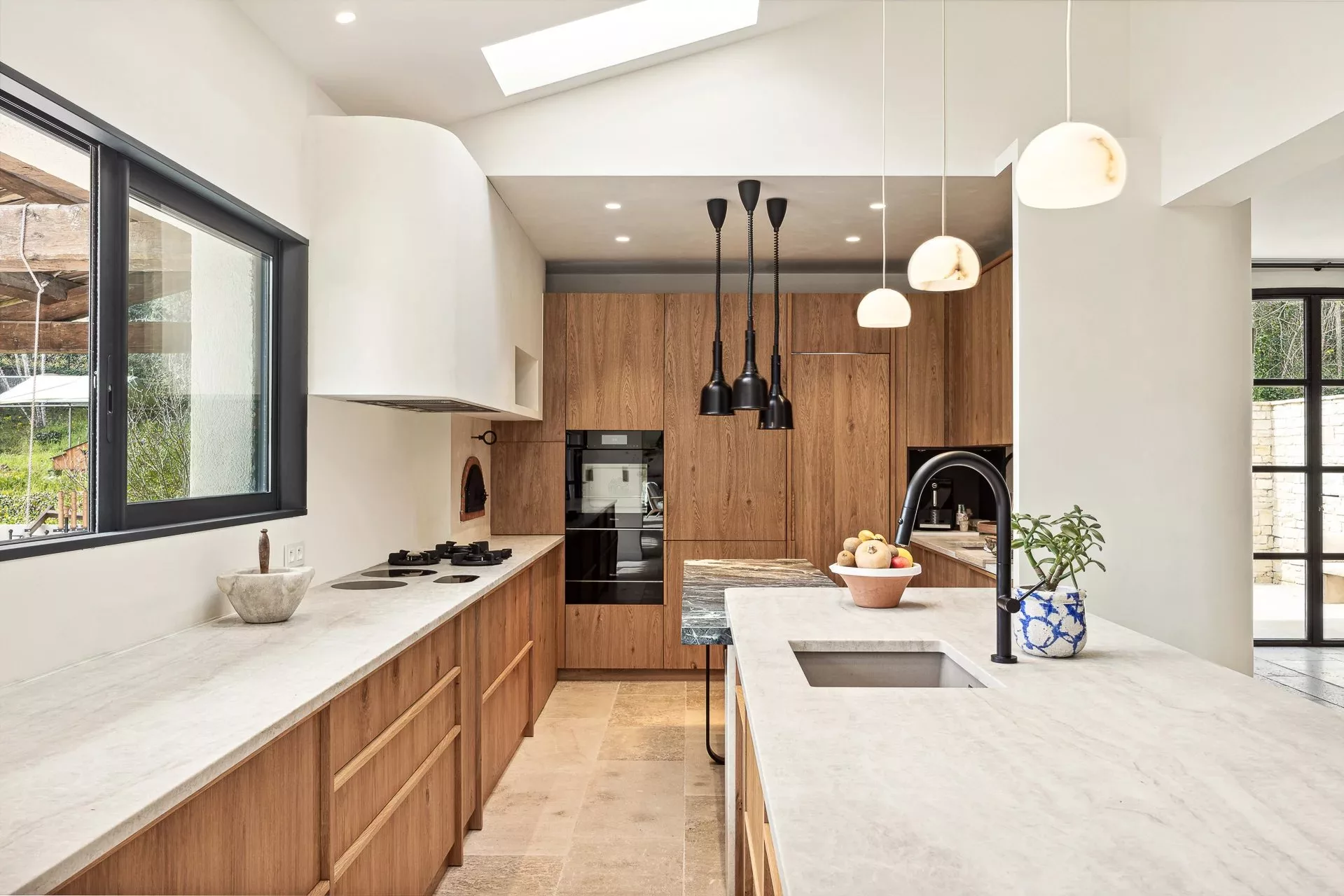 Au rez-de-jardin, une belle entrée donnant sur un grand séjour salle à manger avec cuisine américaine et un four à pizza, le tout ouvert sur une belle terrasse aménagée avec vue sur la piscine et le jardin, un grand salon lumineux avec TV et cheminée. Au même niveau, une chambre de maître ouverte sur la terrasse avec une salle de bain en-suite, baignoire et douche, double vasque et un dressing.