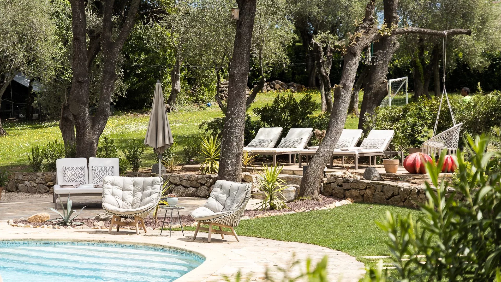 Elle dispose également d'une piscine de 15x6m, nombreuses terrasses, salon, salle à manger et cuisine d'été, de nombreuses places de parking, un terrain de jeux pour enfants, climatisation.