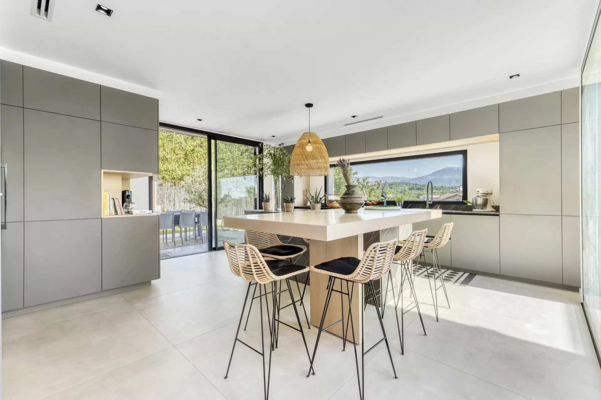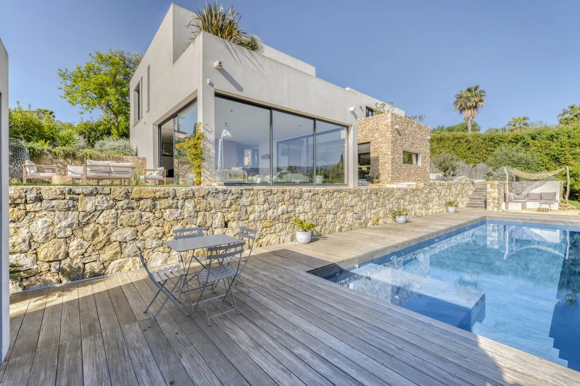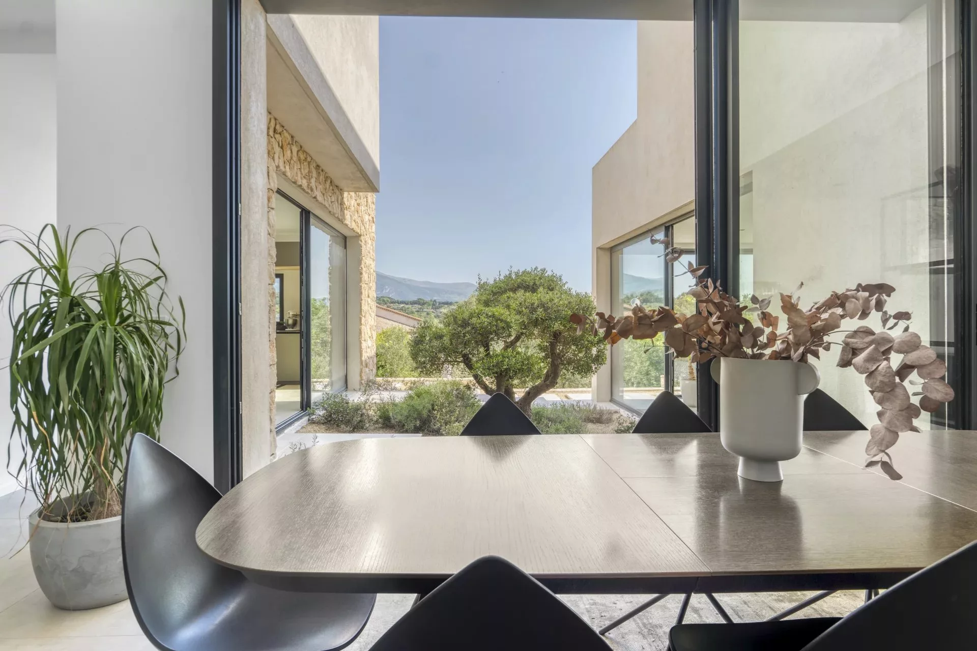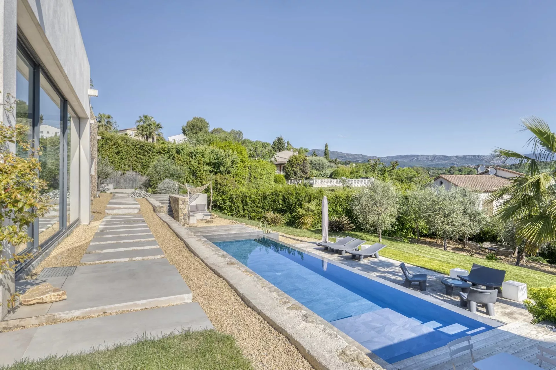 Située à quelques minutes à pied du village de Valbonne, cette villa contemporaine offre environ 300 m² habitables sur un terrain de 1 545 m². Elle bénéficie d'une vue dégagée sur les collines environnantes.
