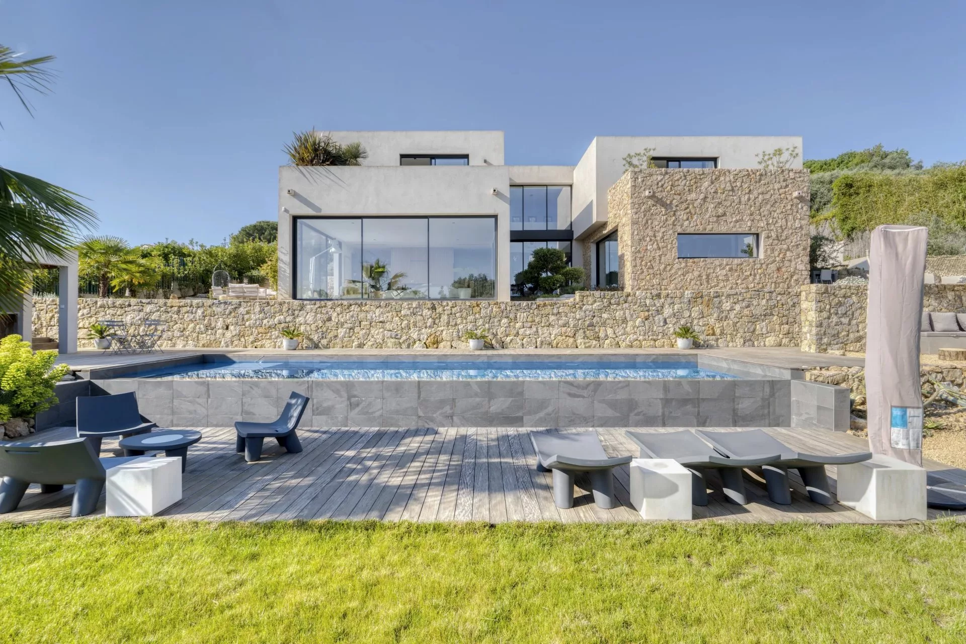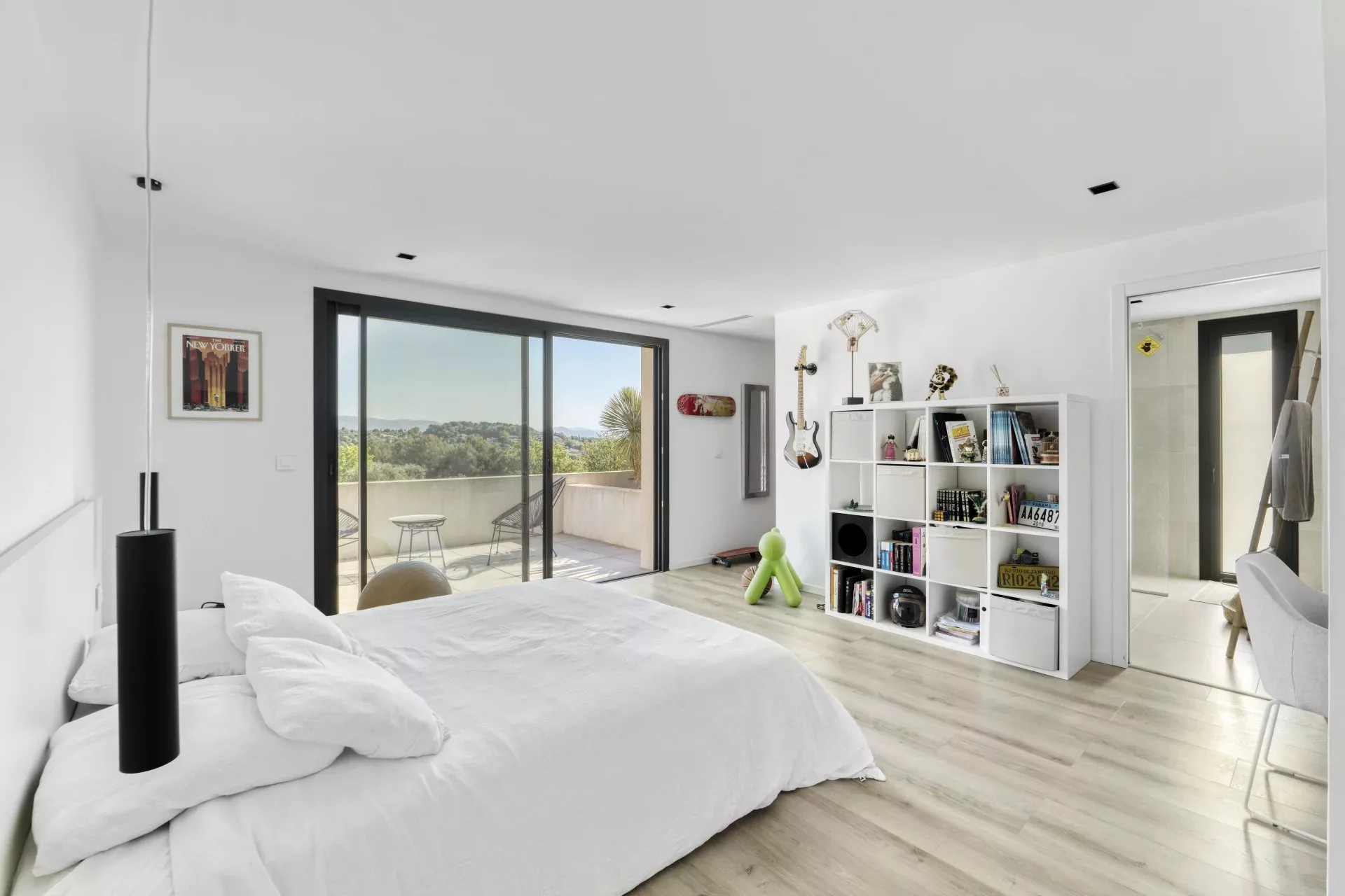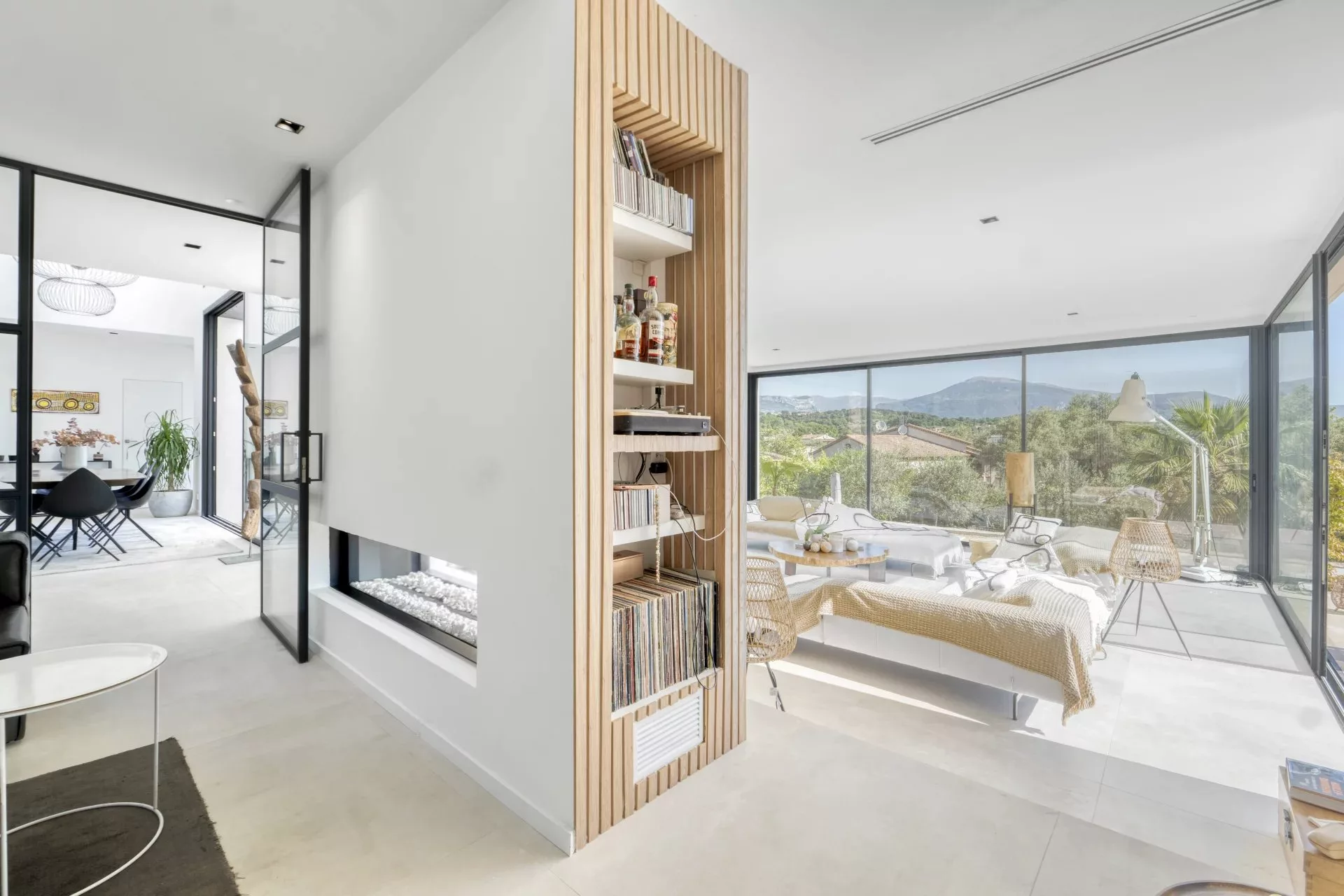 Située à quelques minutes à pied du village de Valbonne, cette villa contemporaine offre environ 300 m² habitables sur un terrain de 1 545 m². Elle bénéficie d'une vue dégagée sur les collines environnantes.