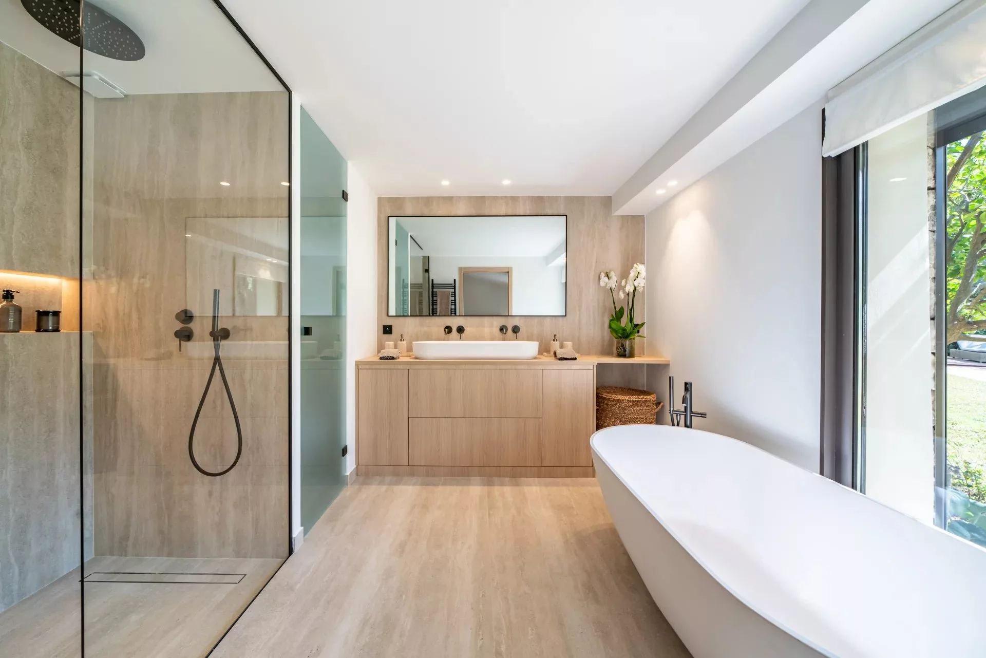 La villa offre cinq belles suites, chacune disposant de sa propre salle de bains ou salle d’eau ainsi que de dressings aménagés.
