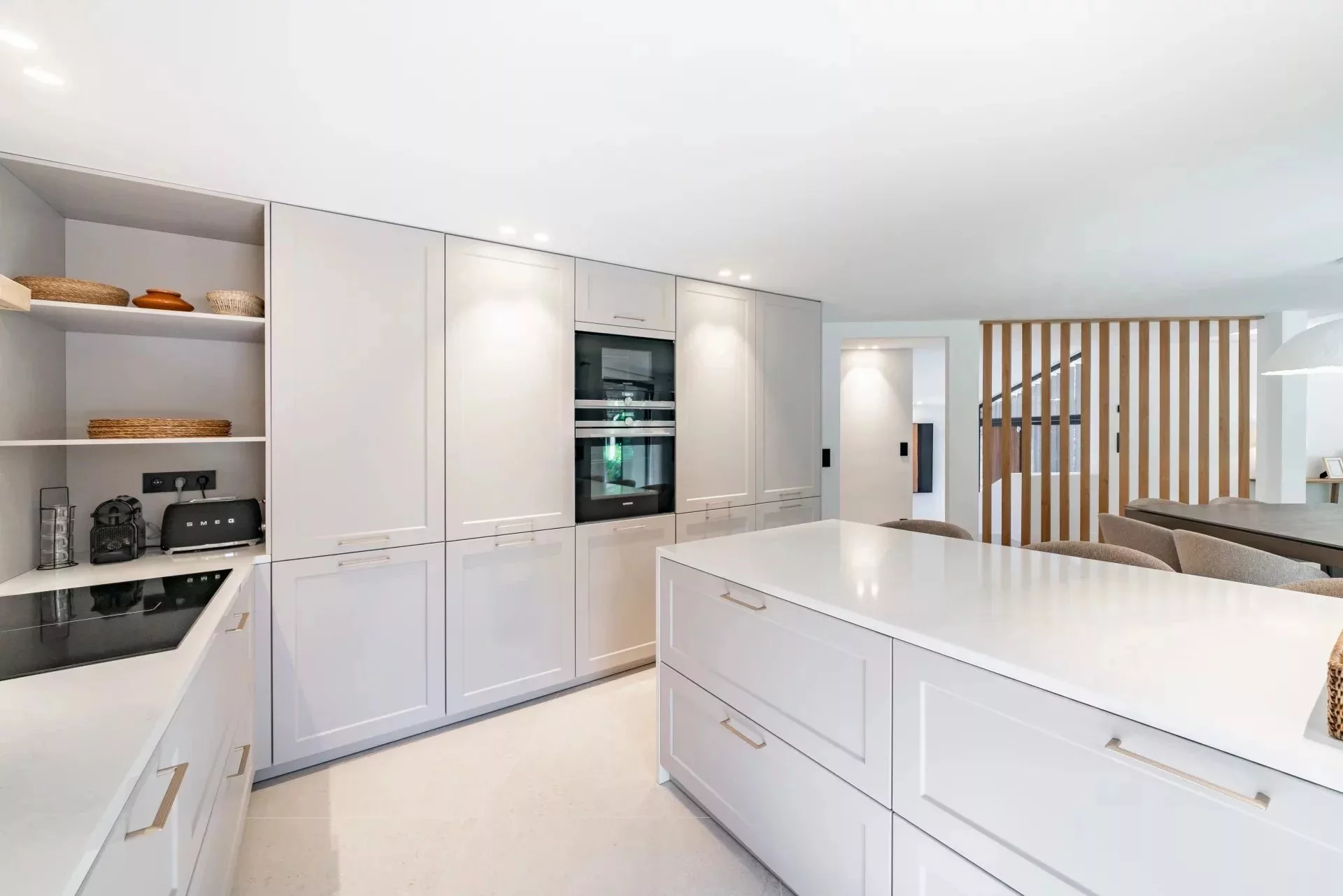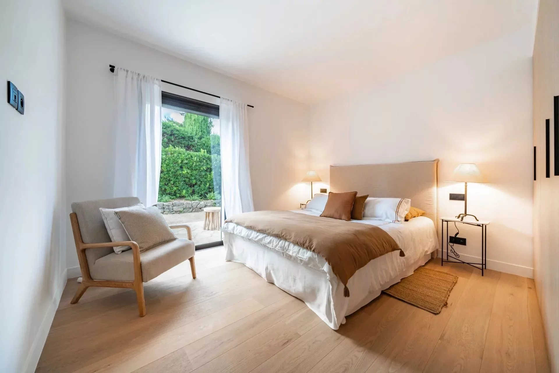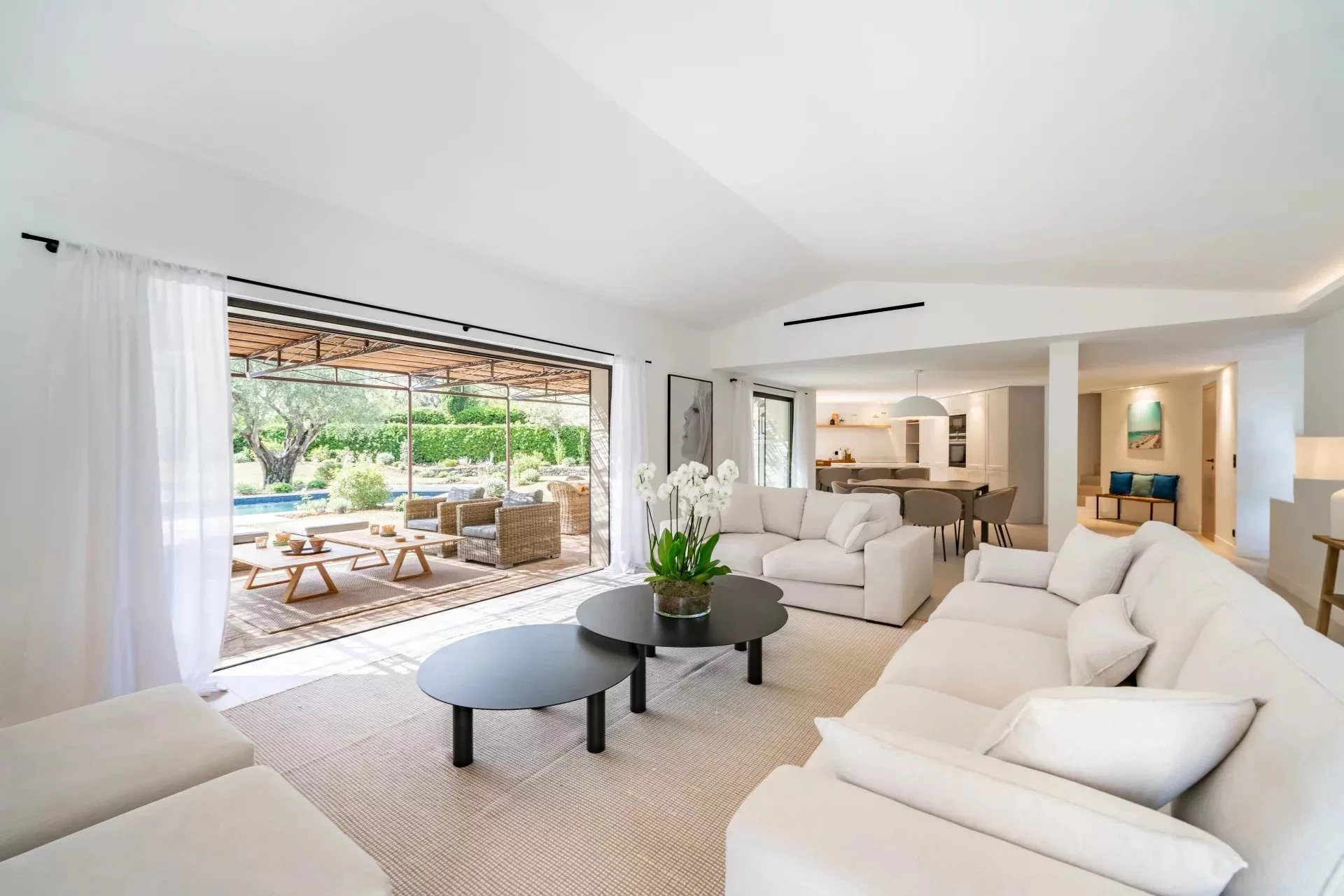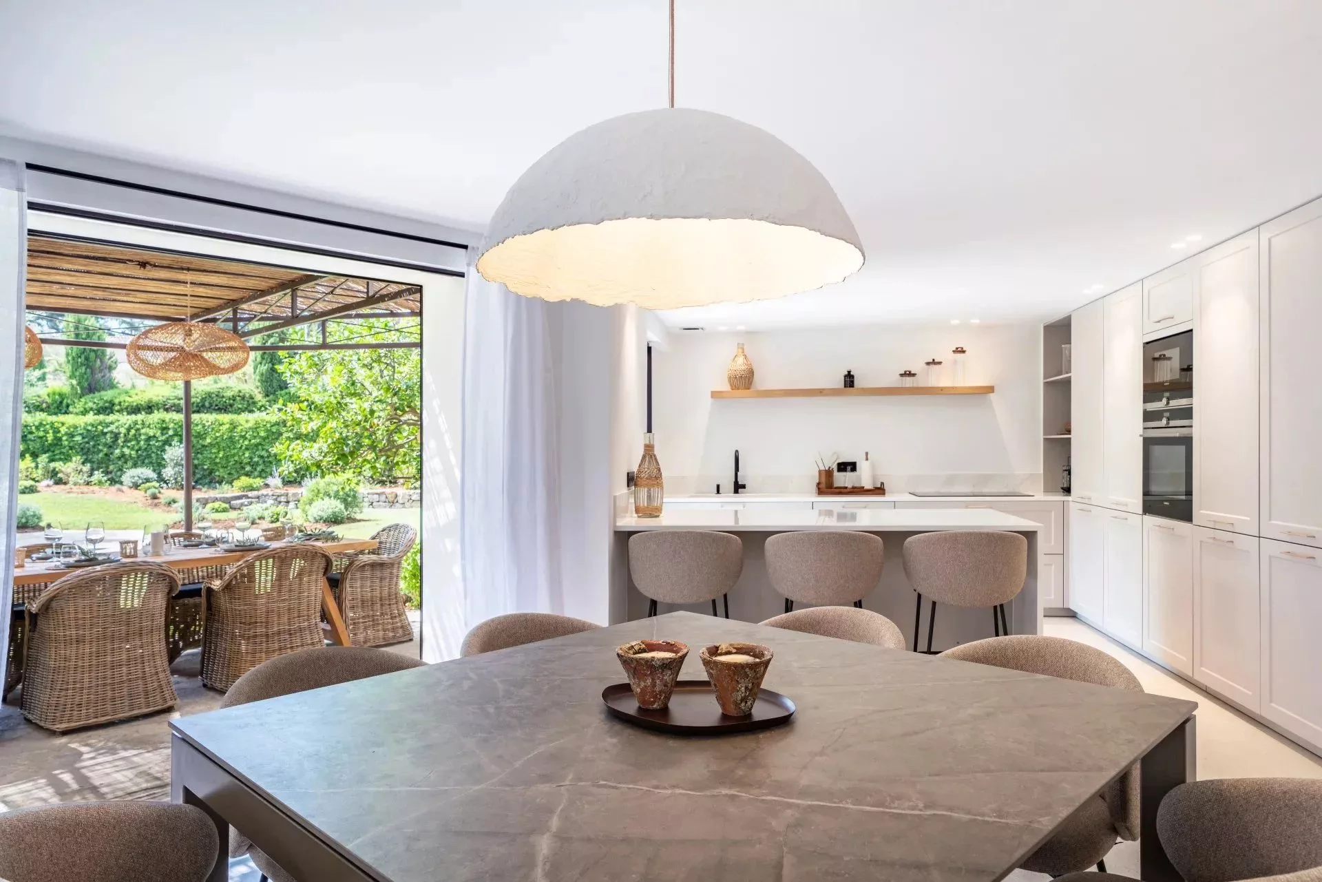 Édifiée sur un terrain plat d'environ 2 500 m², la propriété a été récemment rénovée avec soin dans un style contemporain, et se développe principalement de plain-pied. Ses vastes espaces de réception, lumineux et ouverts, s’étendent sur plus de 80 m² comprenant un séjour, une salle à manger et une cuisine ouverte. L’ensemble s’ouvre directement sur une grande terrasse exposée plein sud, donnant sur l’espace piscine.