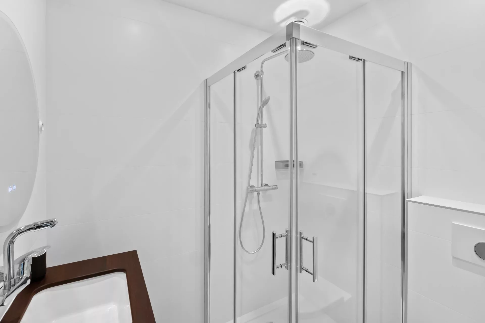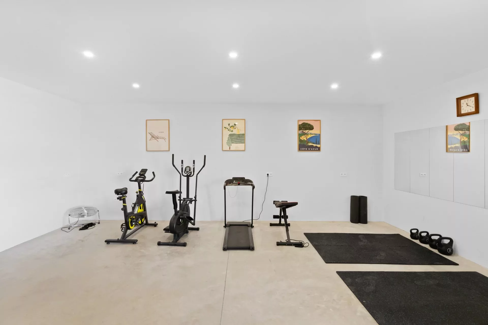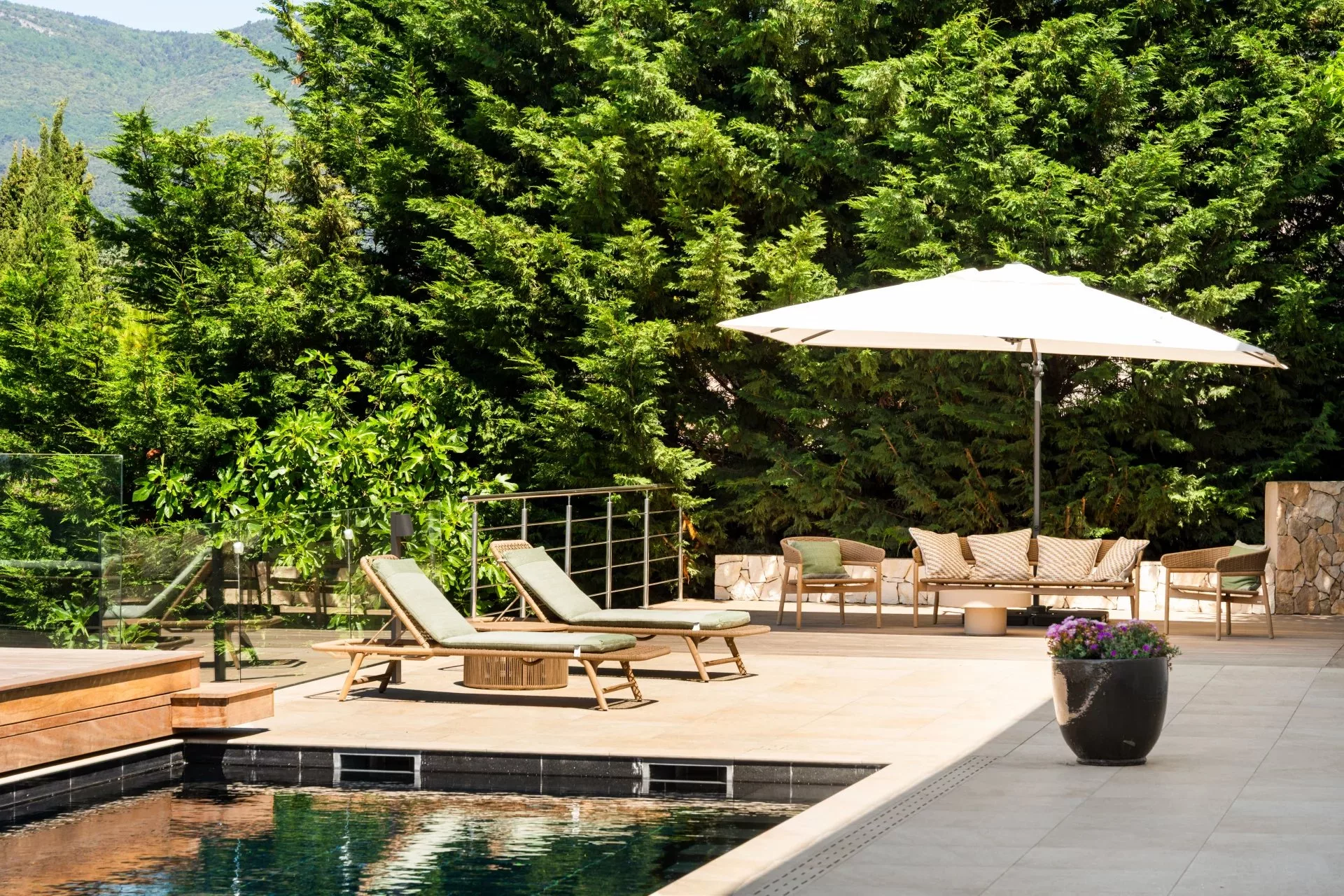 Le rez-de-jardin, accessible également par ascenseur, propose trois chambres, chacune avec sa salle de douche, ainsi qu’une buanderie, une salle de sport et un garage. Ce niveau donne un accès direct à l’espace piscine entièrement aménagé, équipé de nombreux bains de soleil, parasols, d’un salon d’été et d’une douche extérieure.