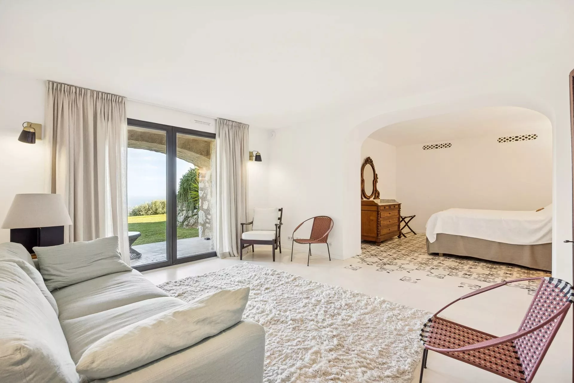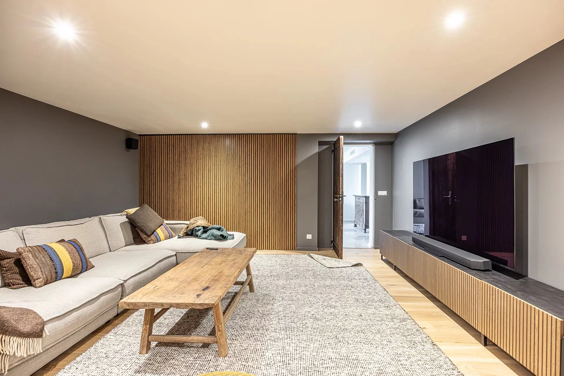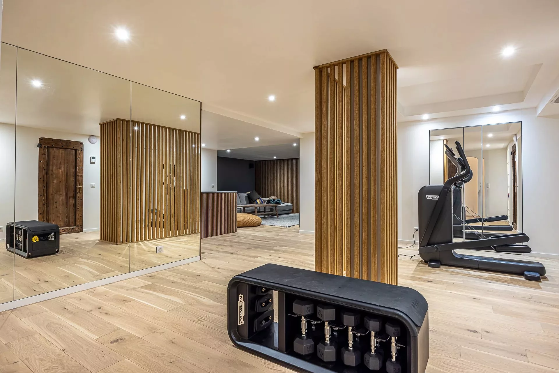 Le rez-de-jardin abrite deux appartements indépendants, chacun doté d’un séjour, d’une chambre et d’une salle de bains, idéals pour accueillir famille et amis en toute autonomie. On y trouve également une salle de sport, un salon TV et une cave à vin avec bar.