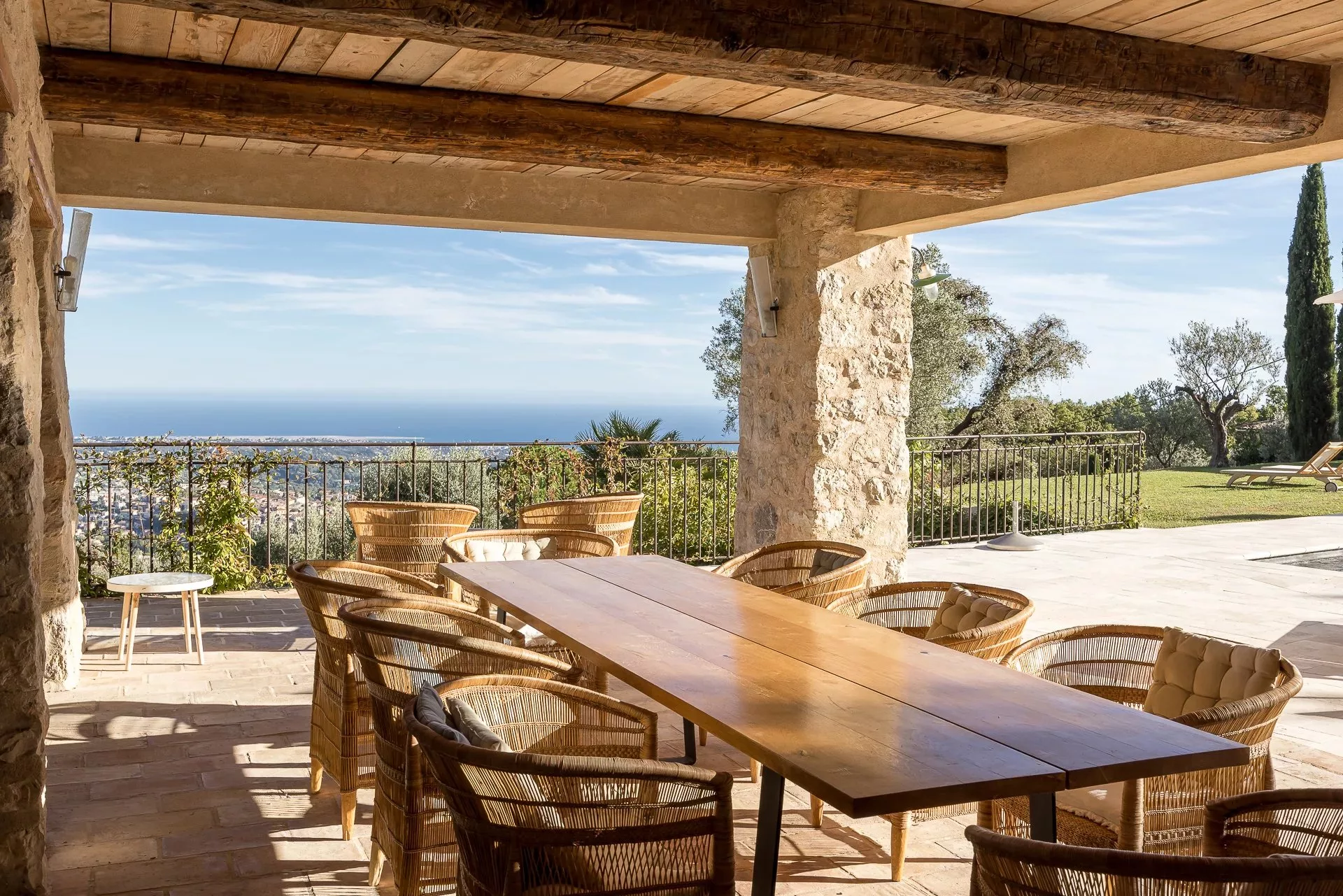 La piscine de 6 x 14 m s’étire face à la mer, bordée de vastes terrasses et d’un espace repas couvert avec cuisine équipée, idéal pour les douces soirées d’été. Le jardin, soigneusement entretenu, bénéficie d’un arrosage automatique, tandis que le portail électrique, les parkings et l’abri voiture garantissent confort et sécurité.