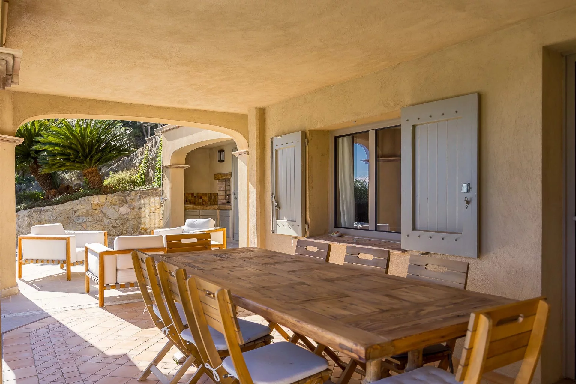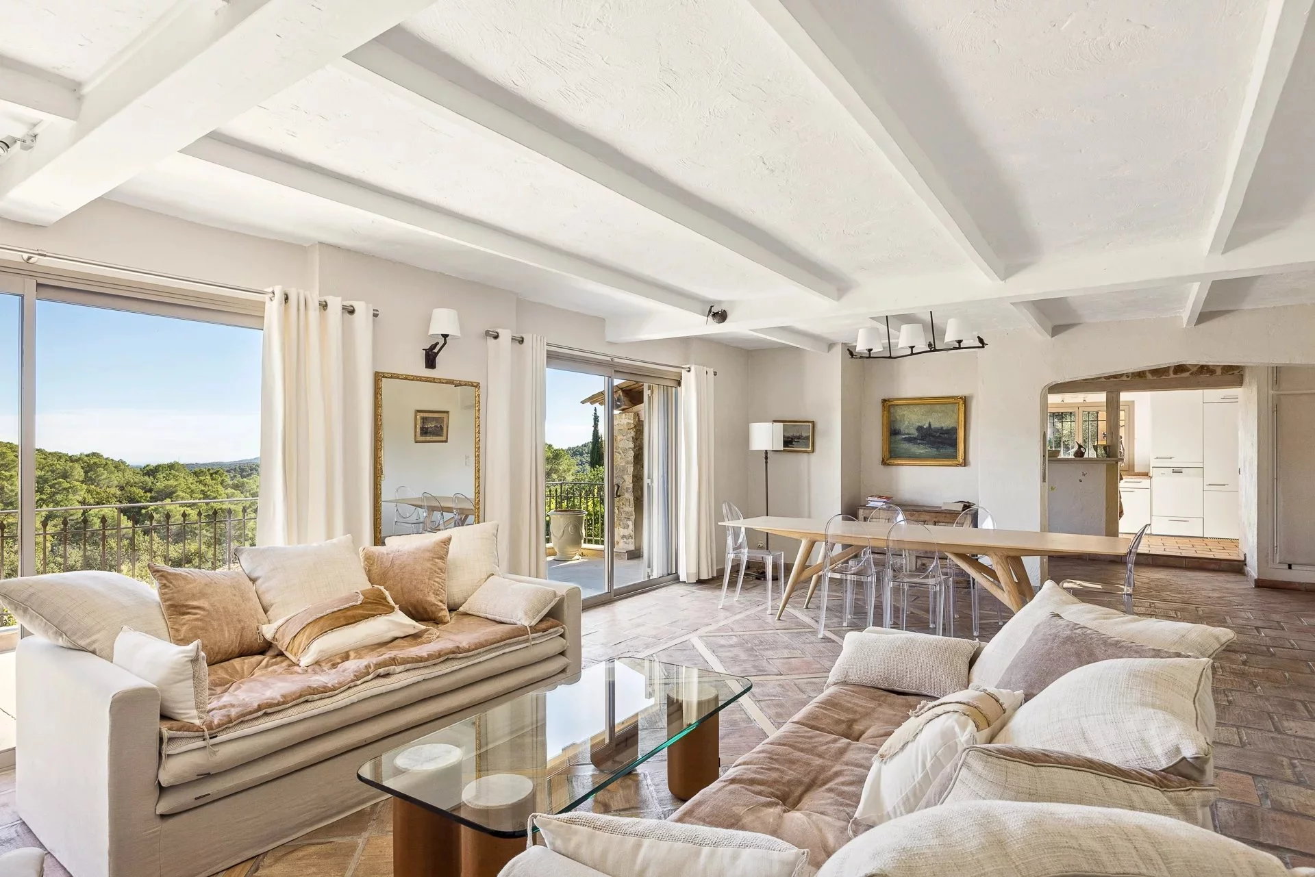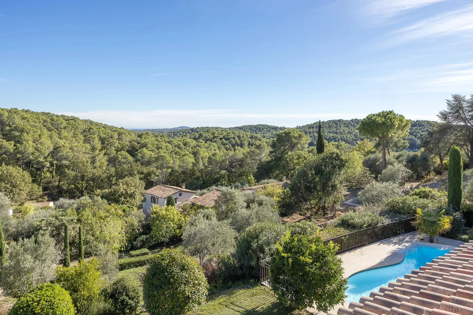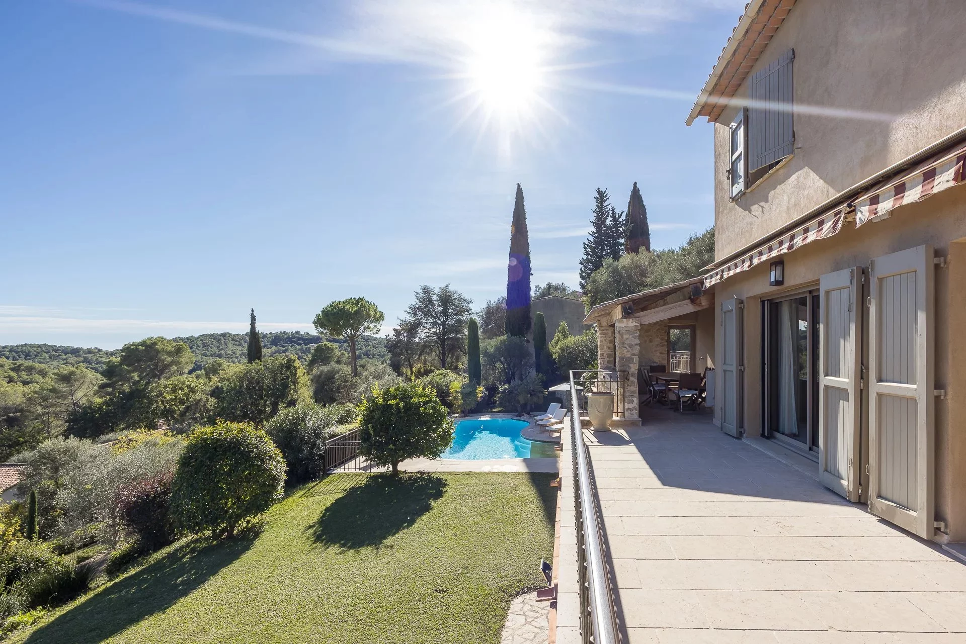 La propriété s’étend sur un terrain paysager de 3 300 m² avec vue sur les collines et aperçu mer. Piscine pouvant être chauffée. Abri voiture.