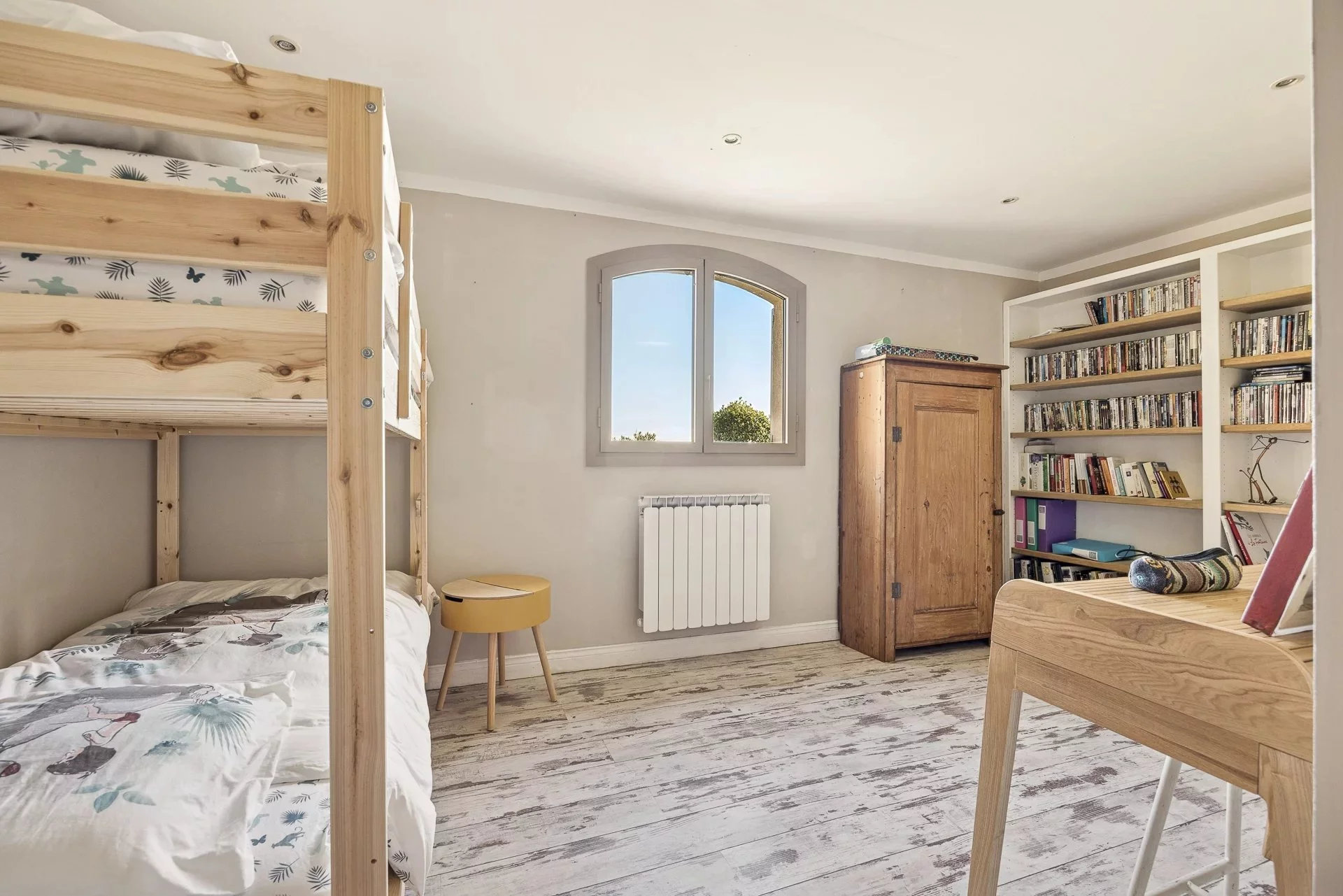 Le rez-de-jardin comprend une salle TV, une chambre enfant avec lits superposés, un espace bureau et un appartement indépendant avec séjour, cuisine ouverte, chambre et salle de douche, bénéficiant d’un accès direct à la piscine.