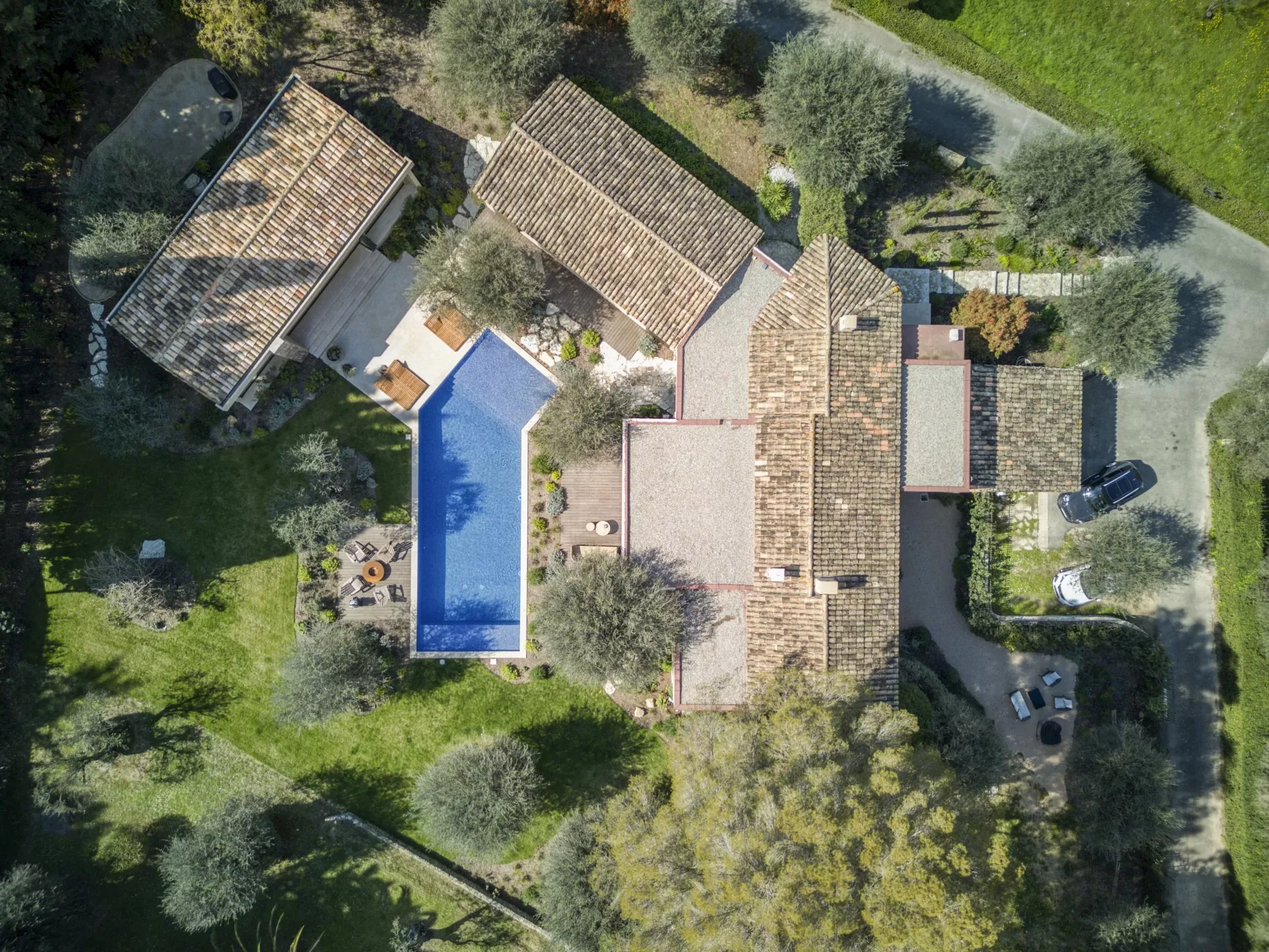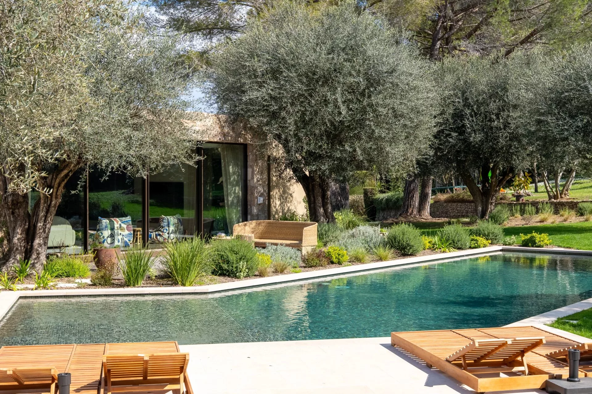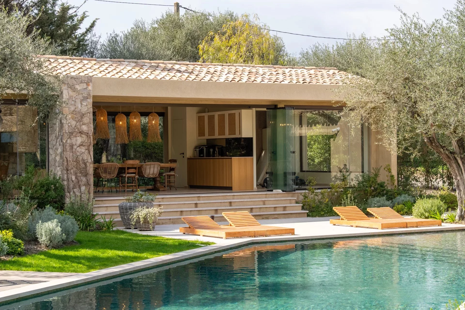 La propriété propose de beaux volumes et une organisation fonctionnelle. Le séjour lumineux s’ouvre sur les espaces extérieurs et la piscine, prolongé par un pool house aménagé, propice aux moments de détente.