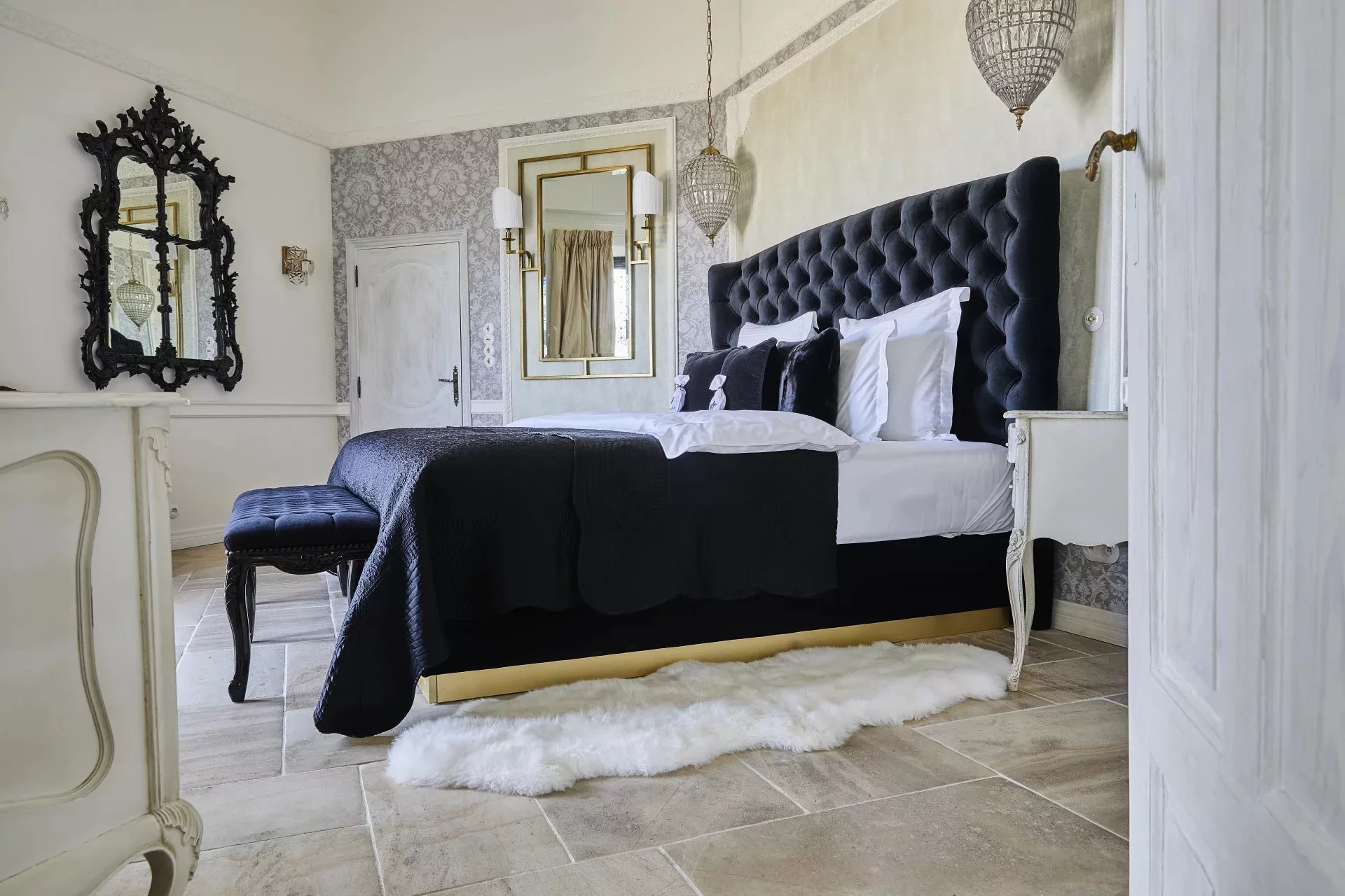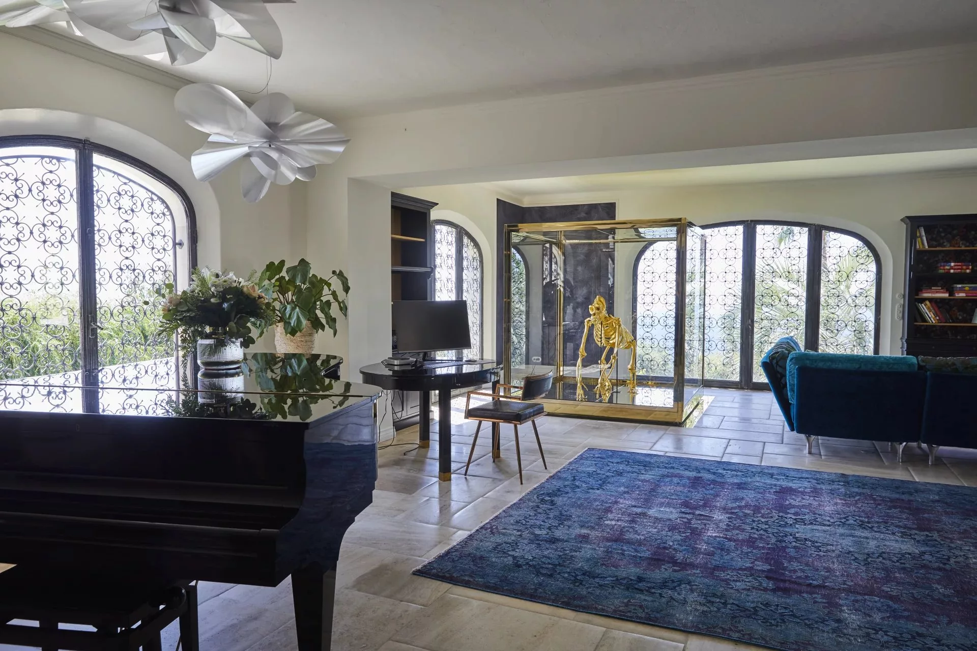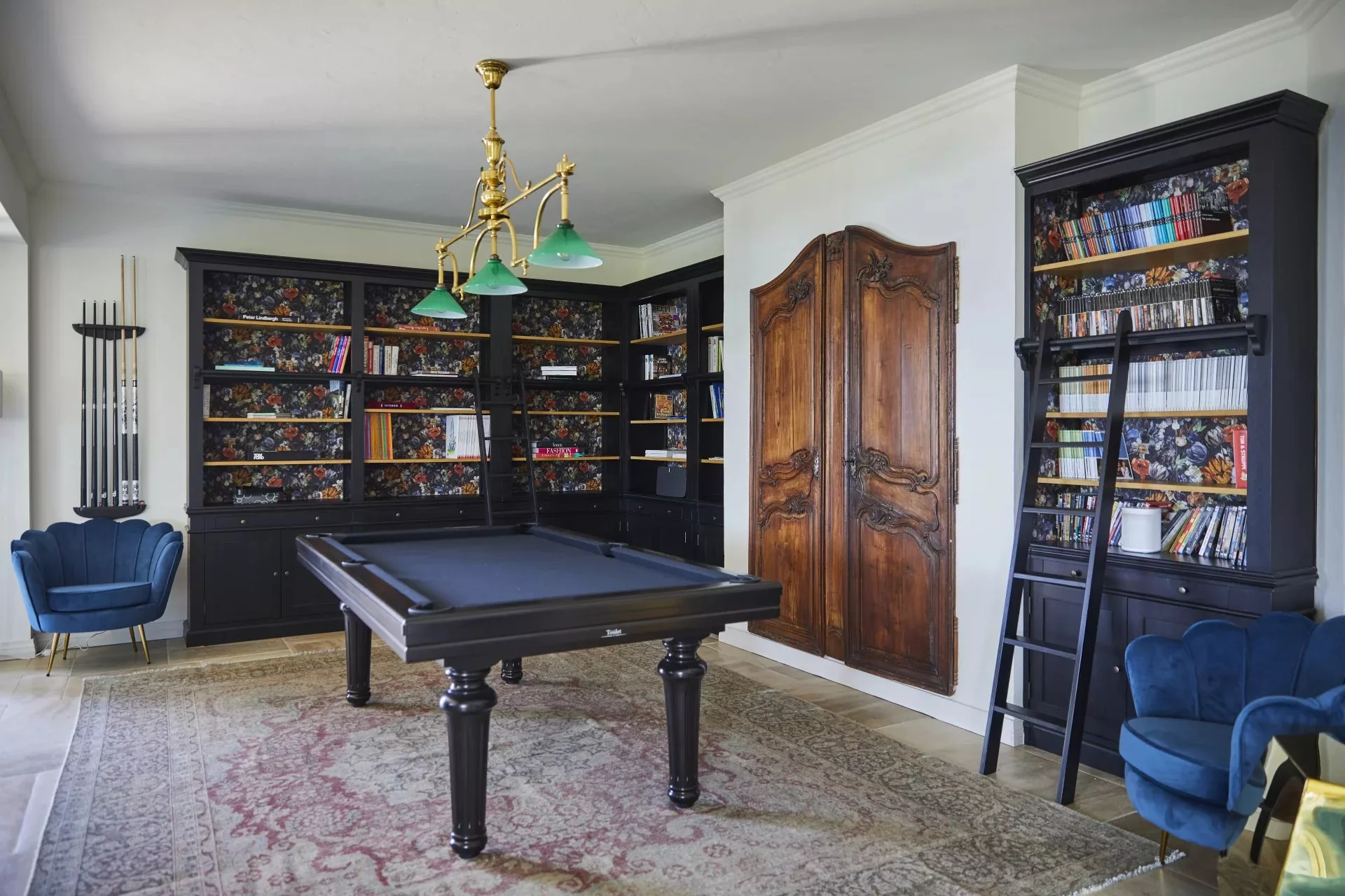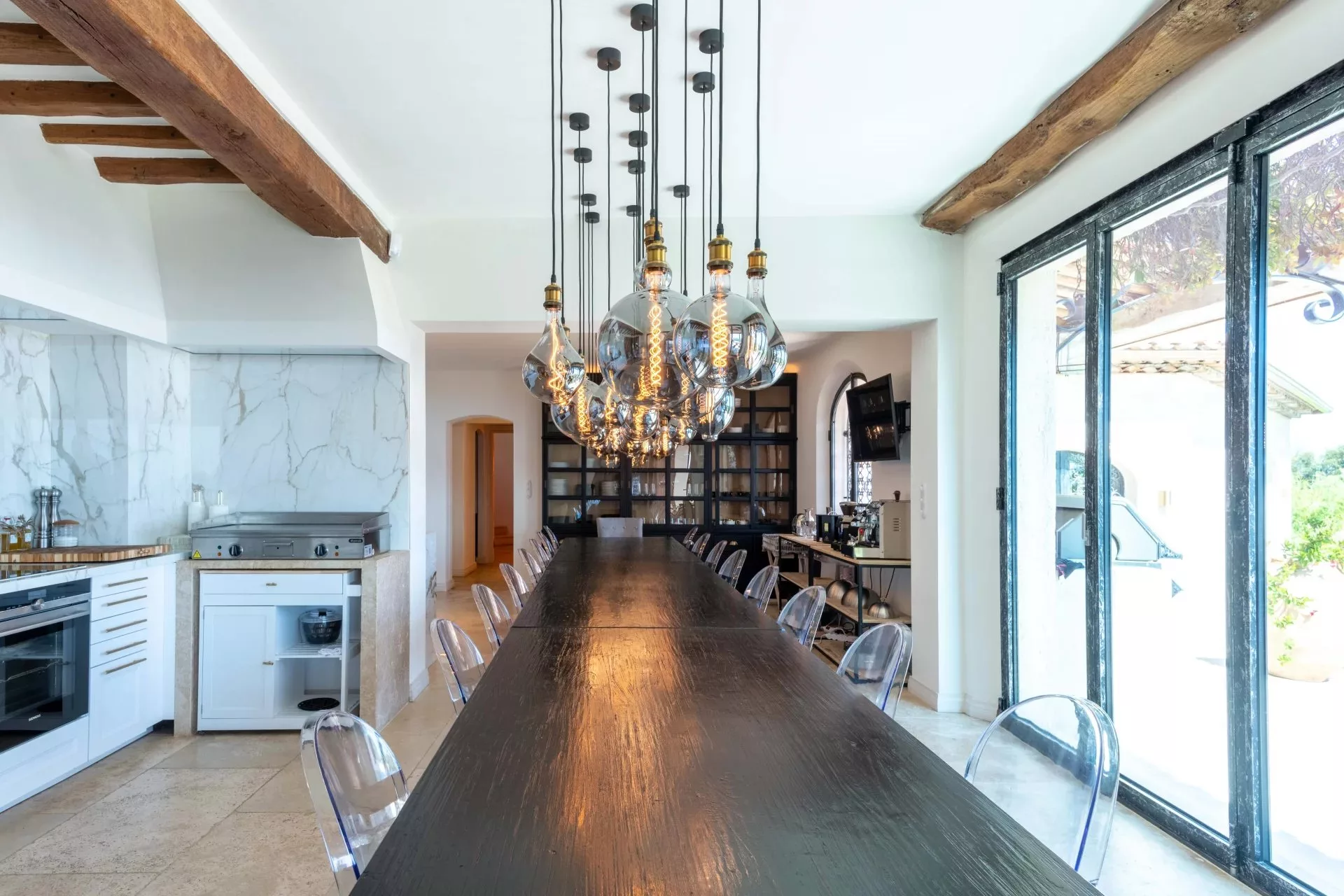 Au rez-de-chaussée, la villa dispose d'une salle à manger, d'une cuisine entièrement équipée avec arrière-cuisine et cave à vin, d’un double salon avec cheminée, piano et billard, et d’un salon TV. Trois chambres disposent chacune de leur salle de douche et wc, ainsi qu’une chambre avec accès indépendant, salle de bains et wc.