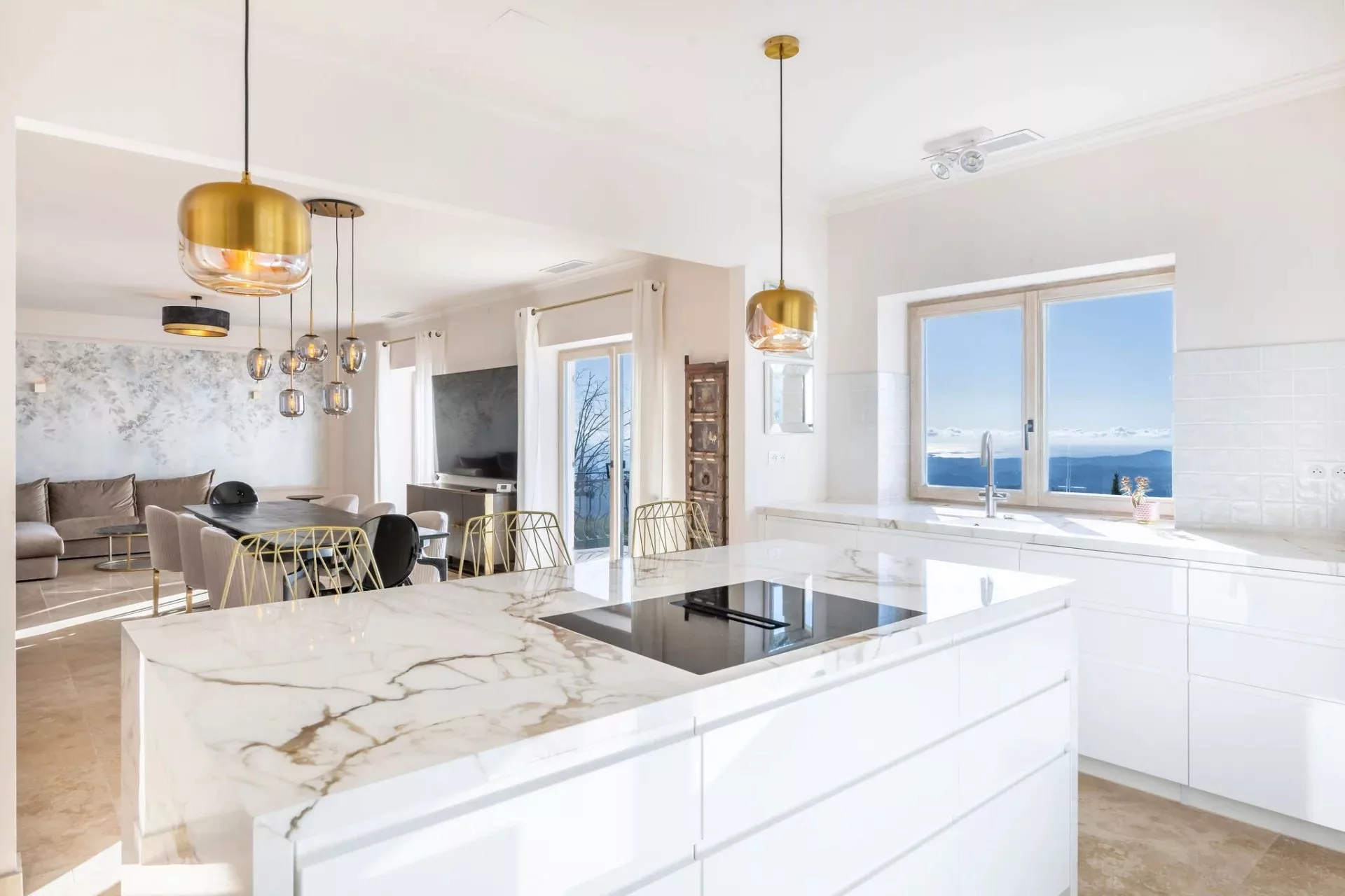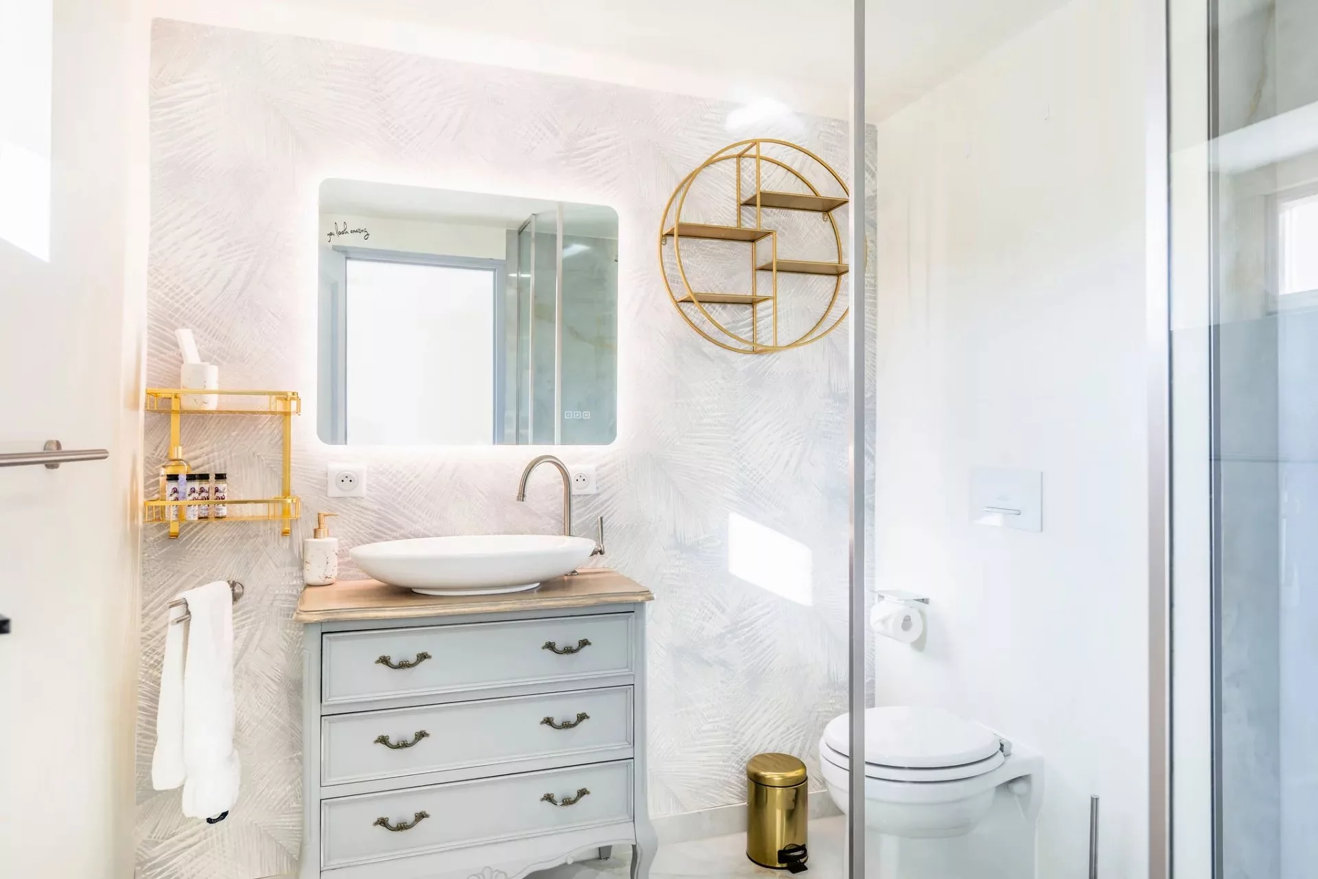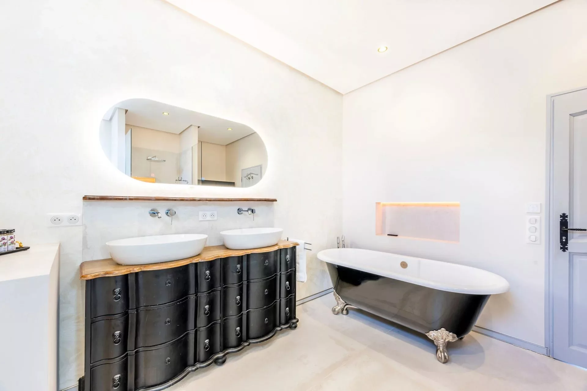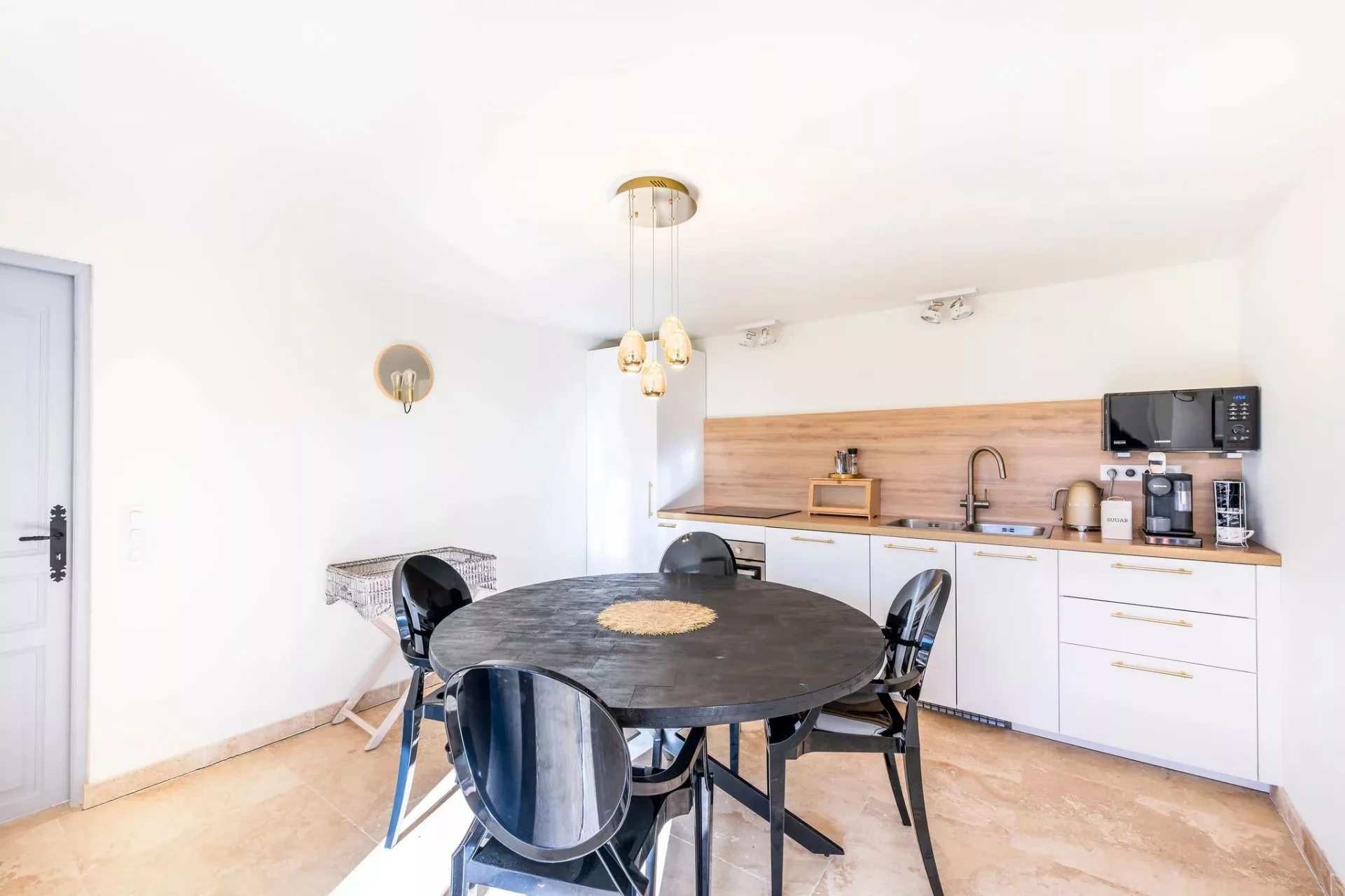 Le rez-de-jardin propose de beaux volumes avec un salon, une salle à manger et une cuisine entièrement équipée. La chambre principale dispose d’une salle de bains complète avec douche, WC et rangements.