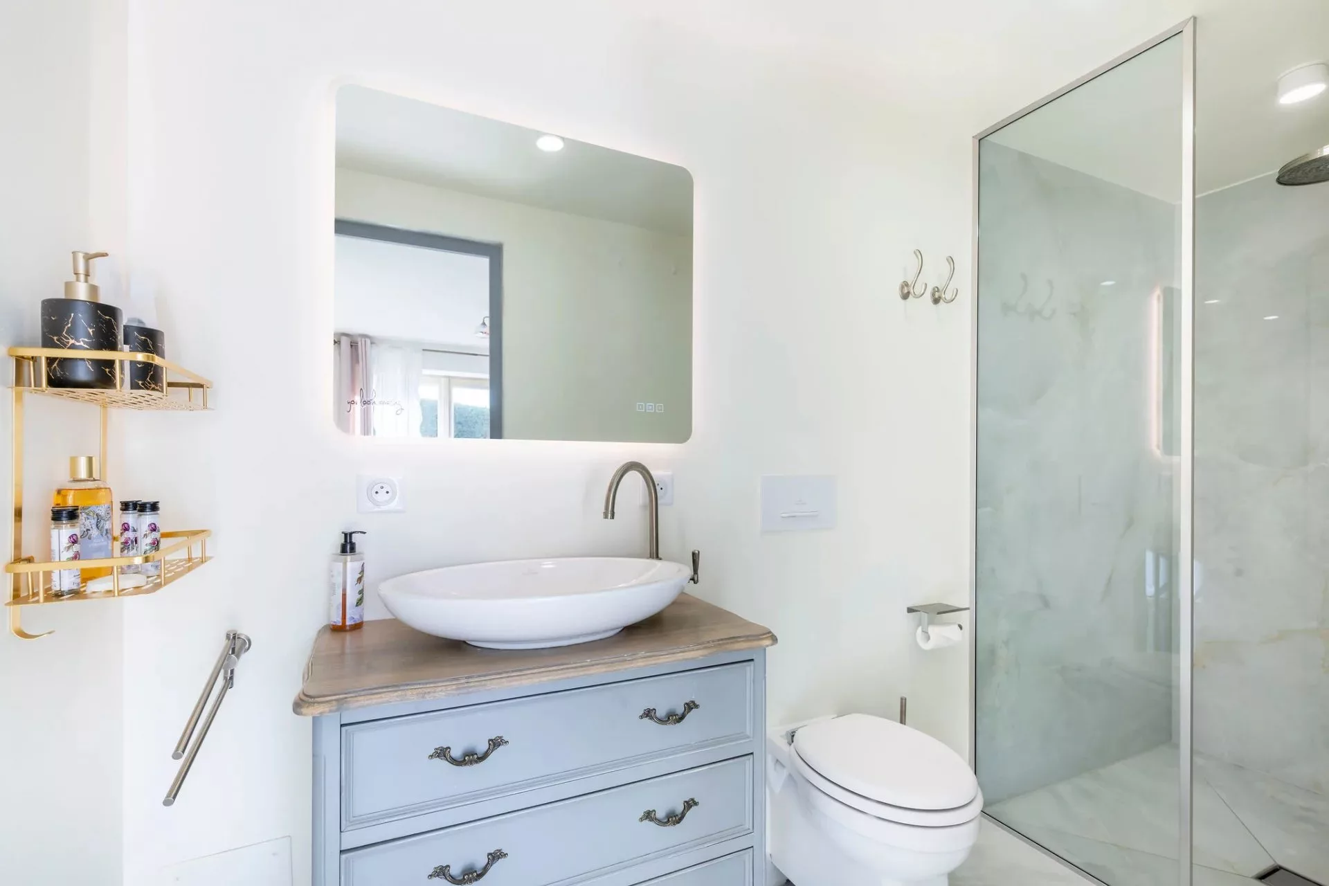 Au rez-de-chaussée, un premier espace de vie indépendant comprend deux chambres, chacune avec sa salle de douche et WC, ainsi qu'une cuisine avec espace repas.
