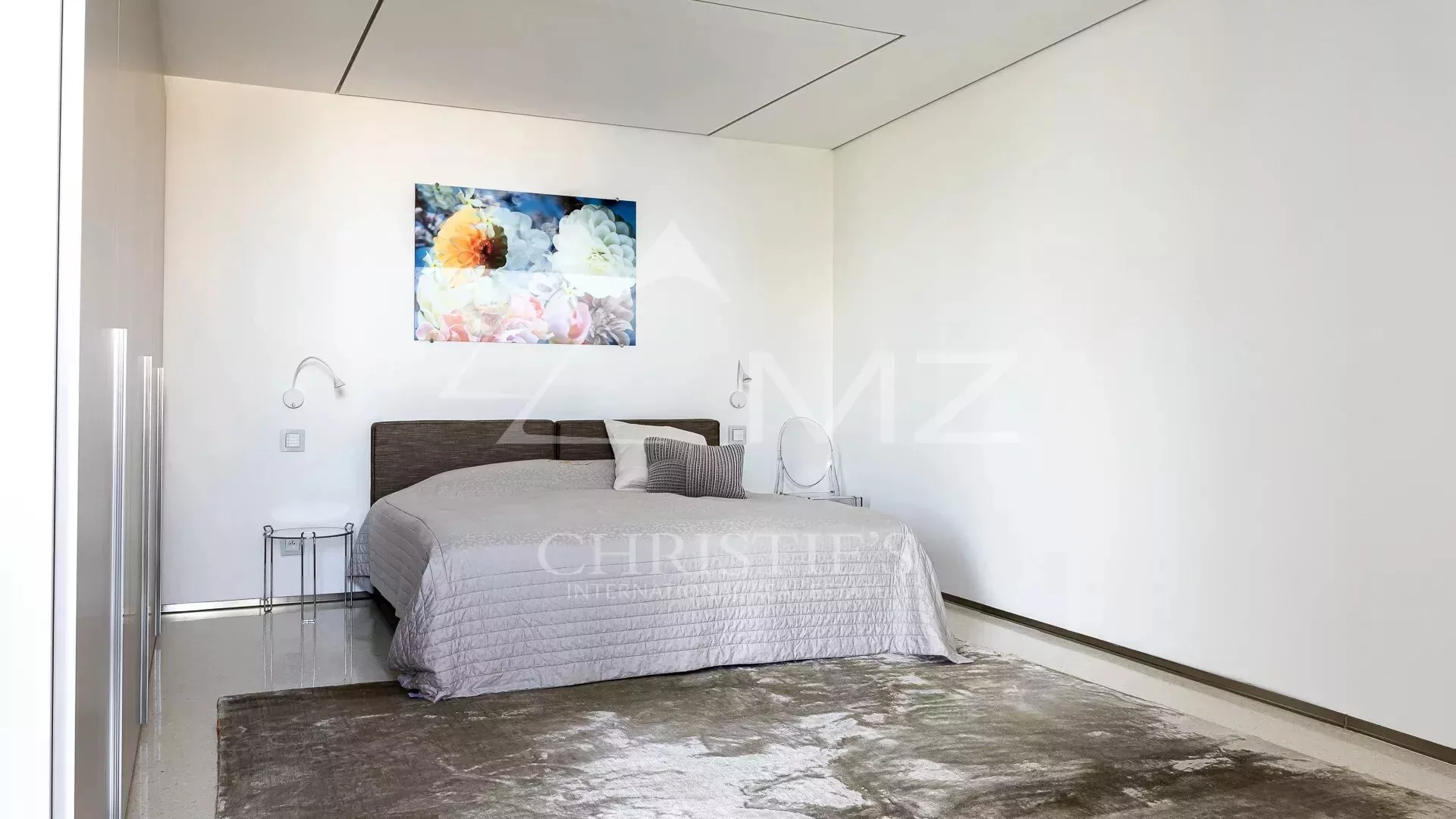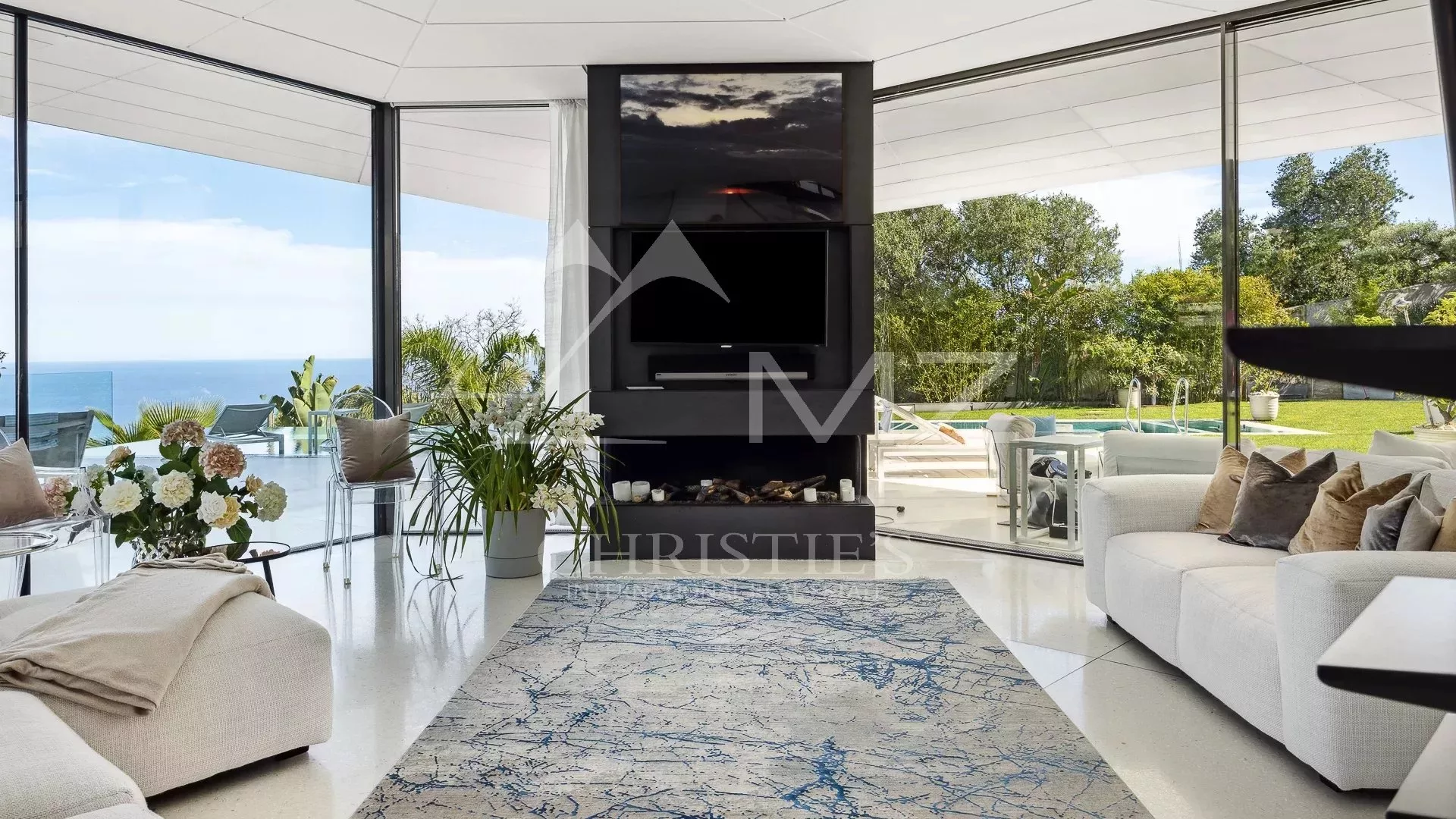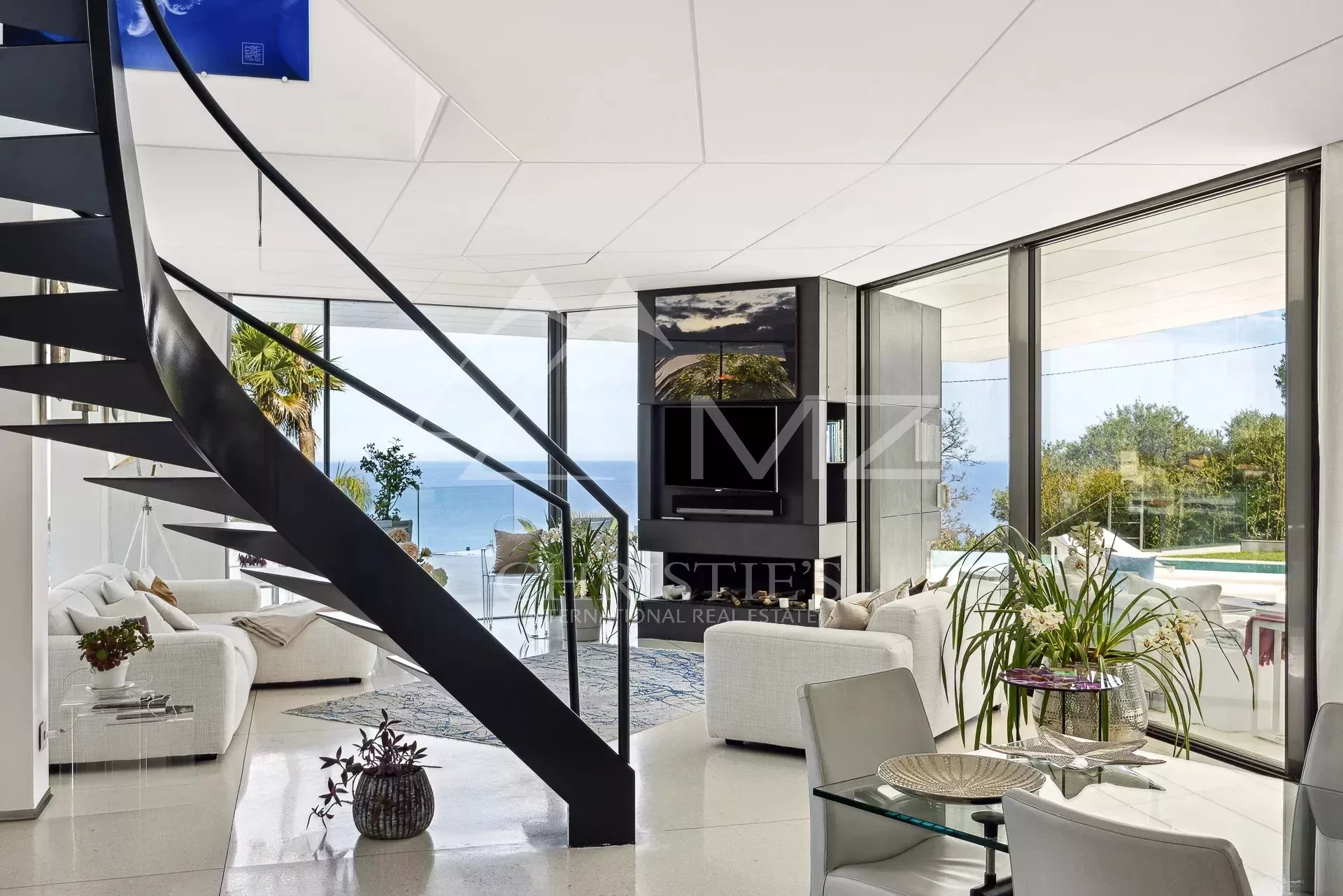 Implantée sur un terrain de 4 500 m², elle bénéficie d’une vue panoramique spectaculaire sur la Méditerranée. Avec 1 250 m² habitables, elle propose des espaces ouverts et lumineux, dont un vaste séjour avec baies vitrées donnant sur une terrasse avec piscine à débordement de 18 mètres. La cuisine ouverte, signée Minimal Italy, s’intègre parfaitement à l’espace de réception.