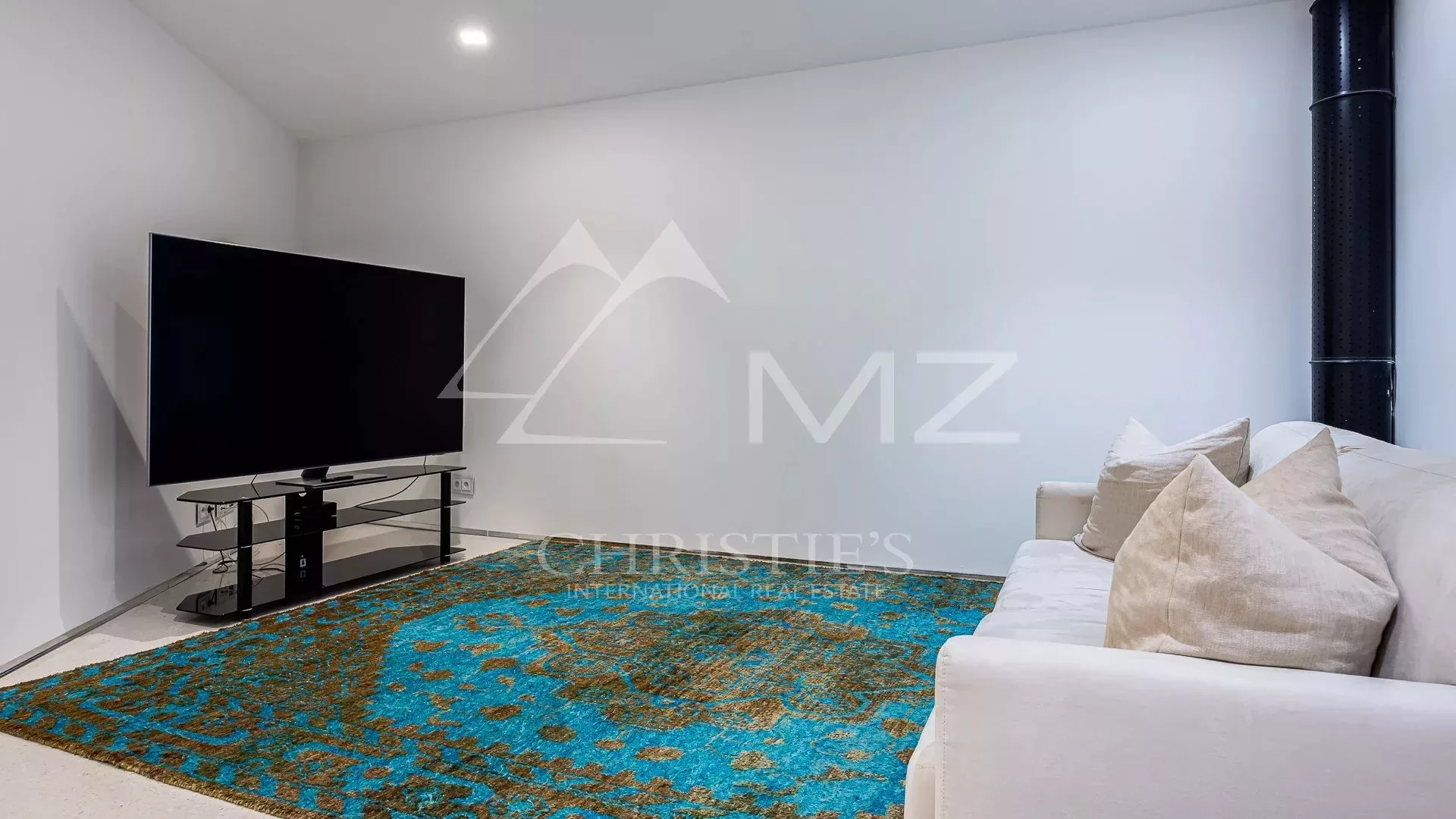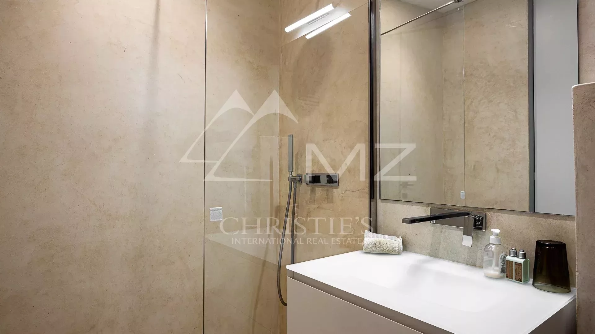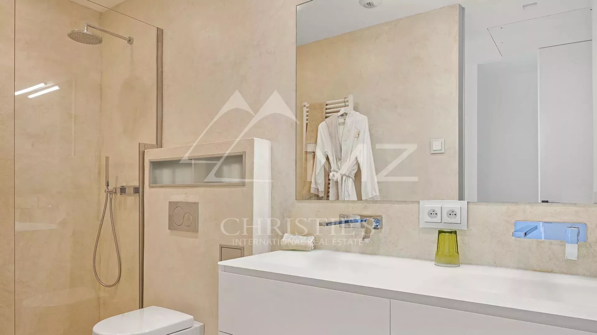 Implantée sur un terrain de 4 500 m², elle bénéficie d’une vue panoramique spectaculaire sur la Méditerranée. Avec 1 250 m² habitables, elle propose des espaces ouverts et lumineux, dont un vaste séjour avec baies vitrées donnant sur une terrasse avec piscine à débordement de 18 mètres. La cuisine ouverte, signée Minimal Italy, s’intègre parfaitement à l’espace de réception.