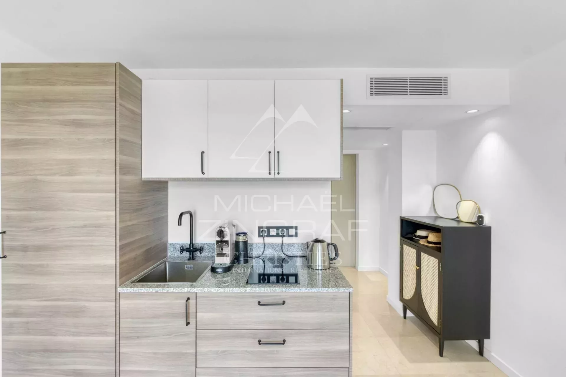Au niveau -1 : une cuisine moderne entièrement équipée, un vaste séjour baigné de lumière avec une double hauteur sous-plafond.