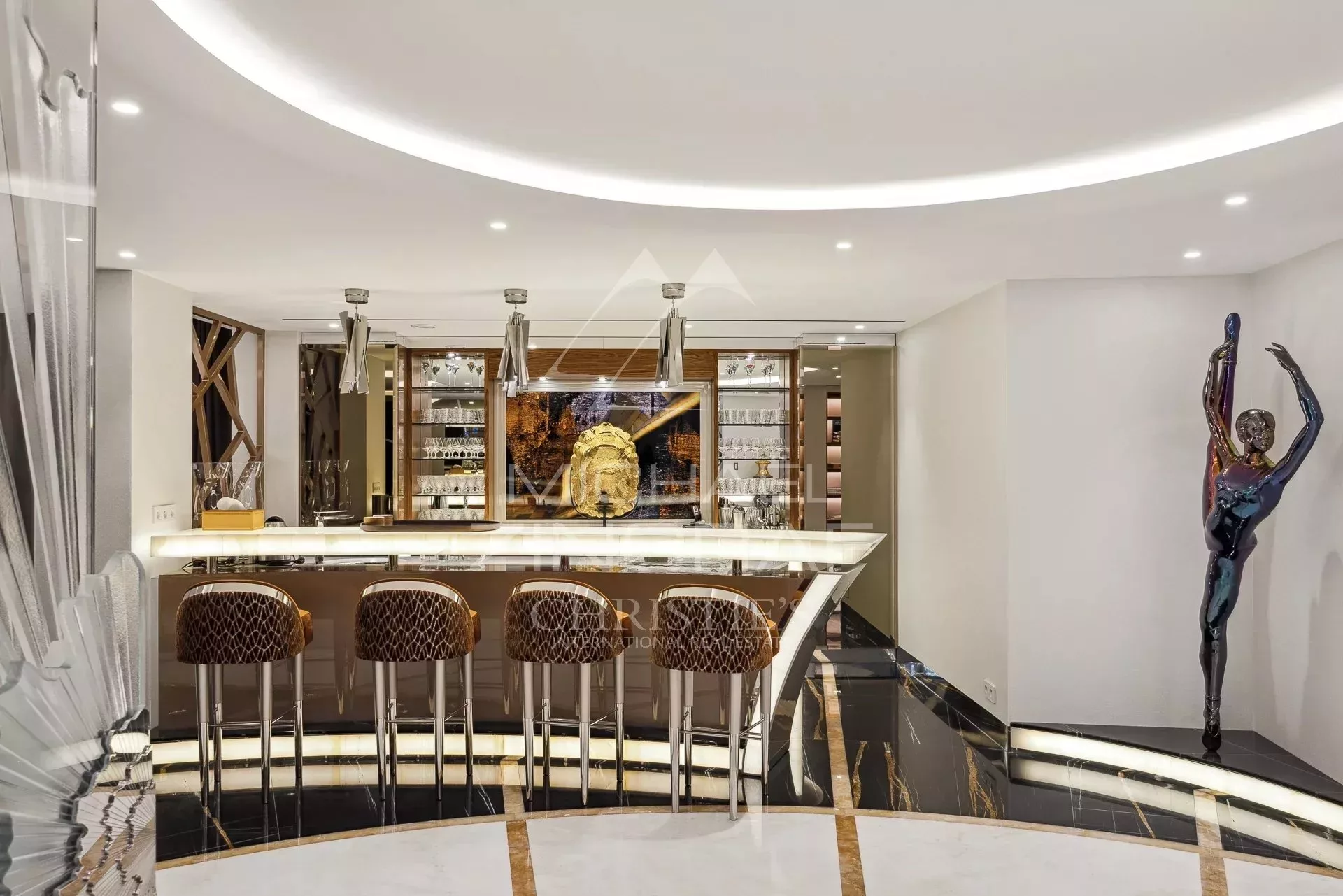 Elle développe une surface habitable d’environ 500 m², répartie sur quatre niveaux, intégralement desservis par un ascenseur intérieur.