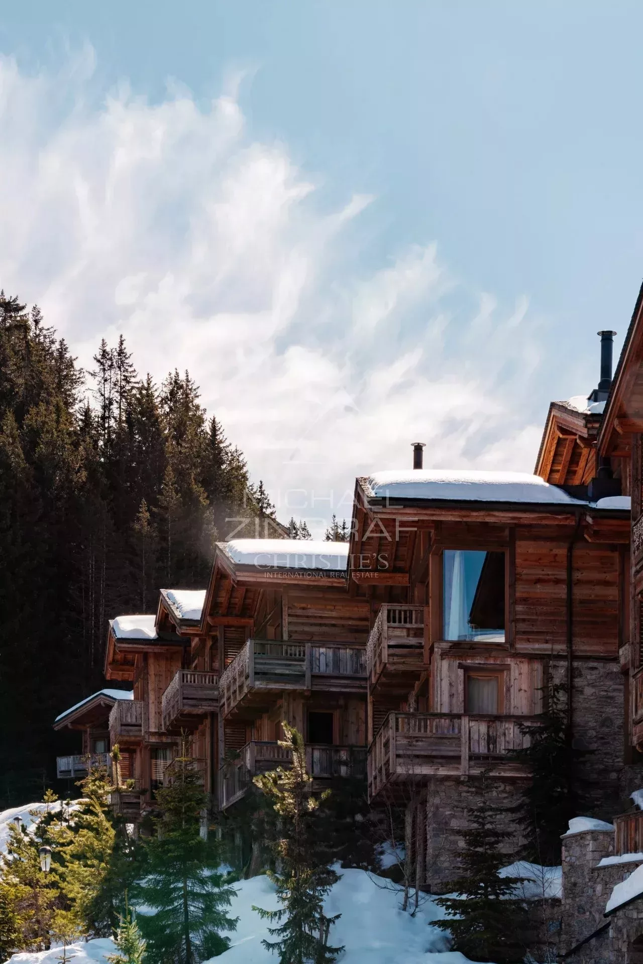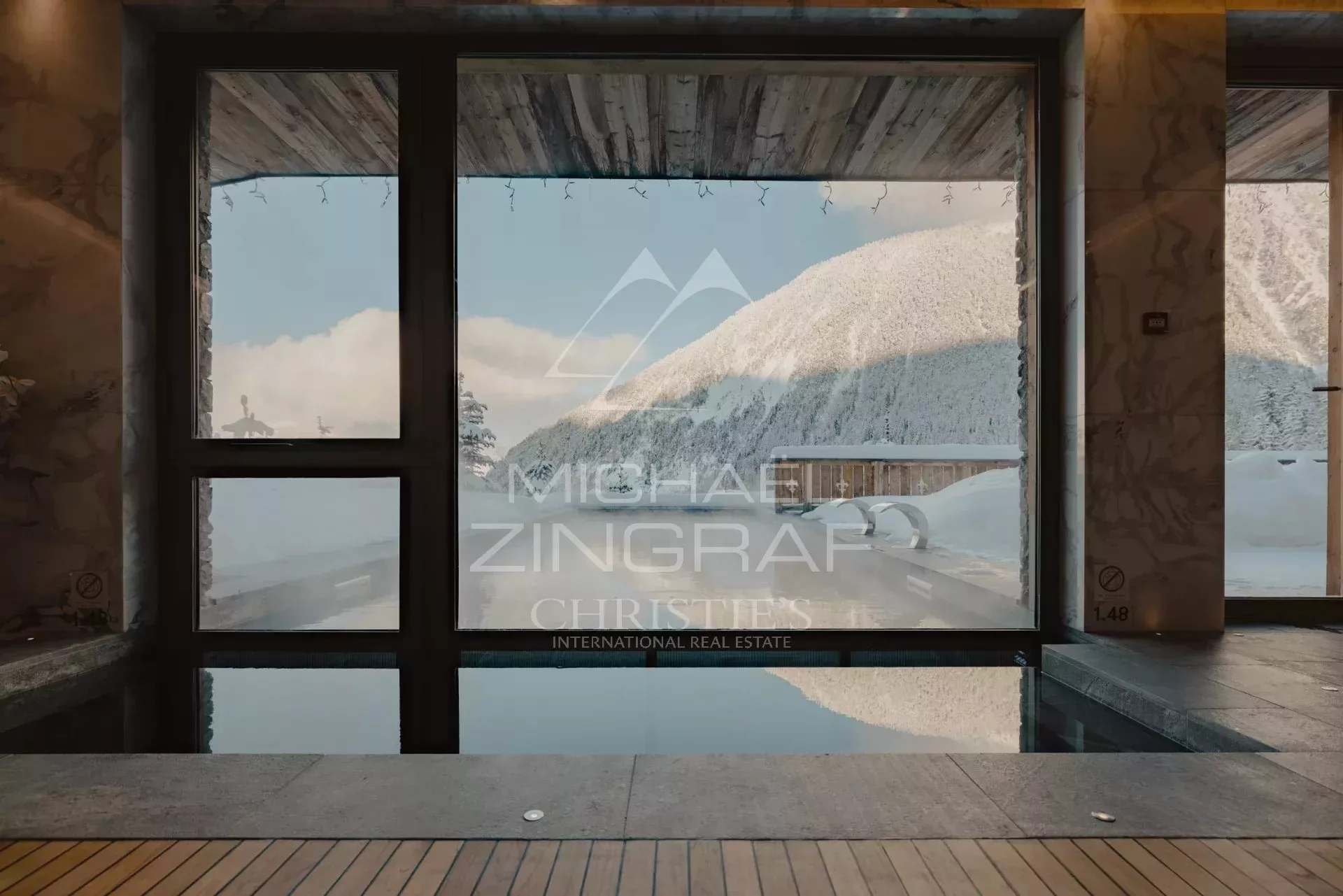 À l’extérieur, une terrasse et un balcon prolongent les espaces de vie vers les sommets enneigés. Le chalet donne accès à un espace bien-être complet, comprenant une piscine intérieure chauffée, un jacuzzi extérieur, un hammam, un sauna et une salle de sport accessible à toute heure.