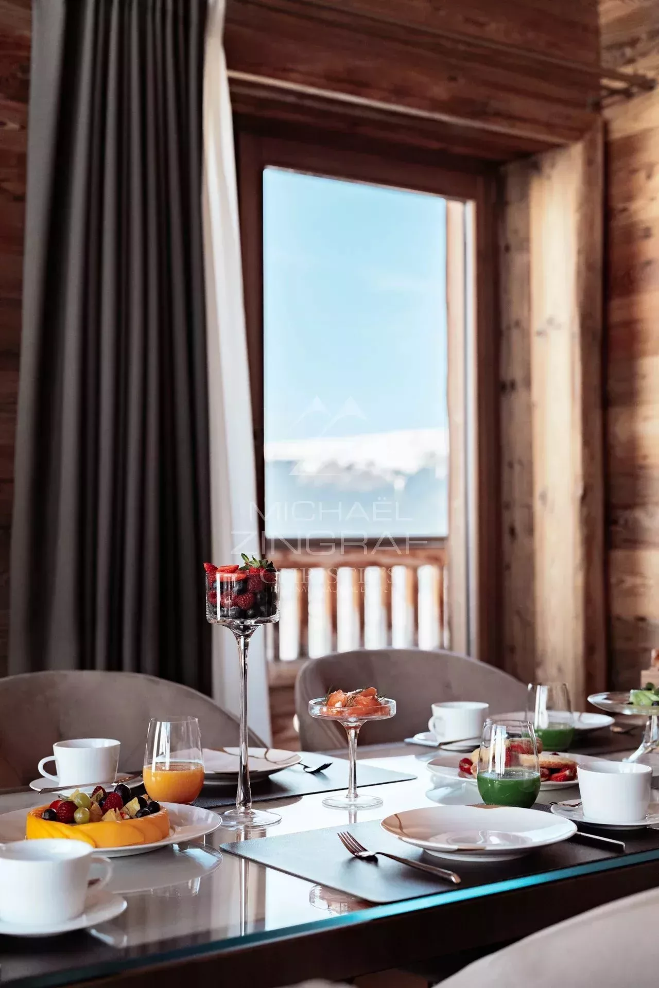 Chaque détail traduit un raffinement alpin discret : matériaux nobles, tons apaisants, lignes contemporaines et confort absolu. Les services haut de gamme – conciergerie, navette dans la station, ski room, petit-déjeuner servi en résidence et entretien quotidien – assurent une expérience sans fausse note.
