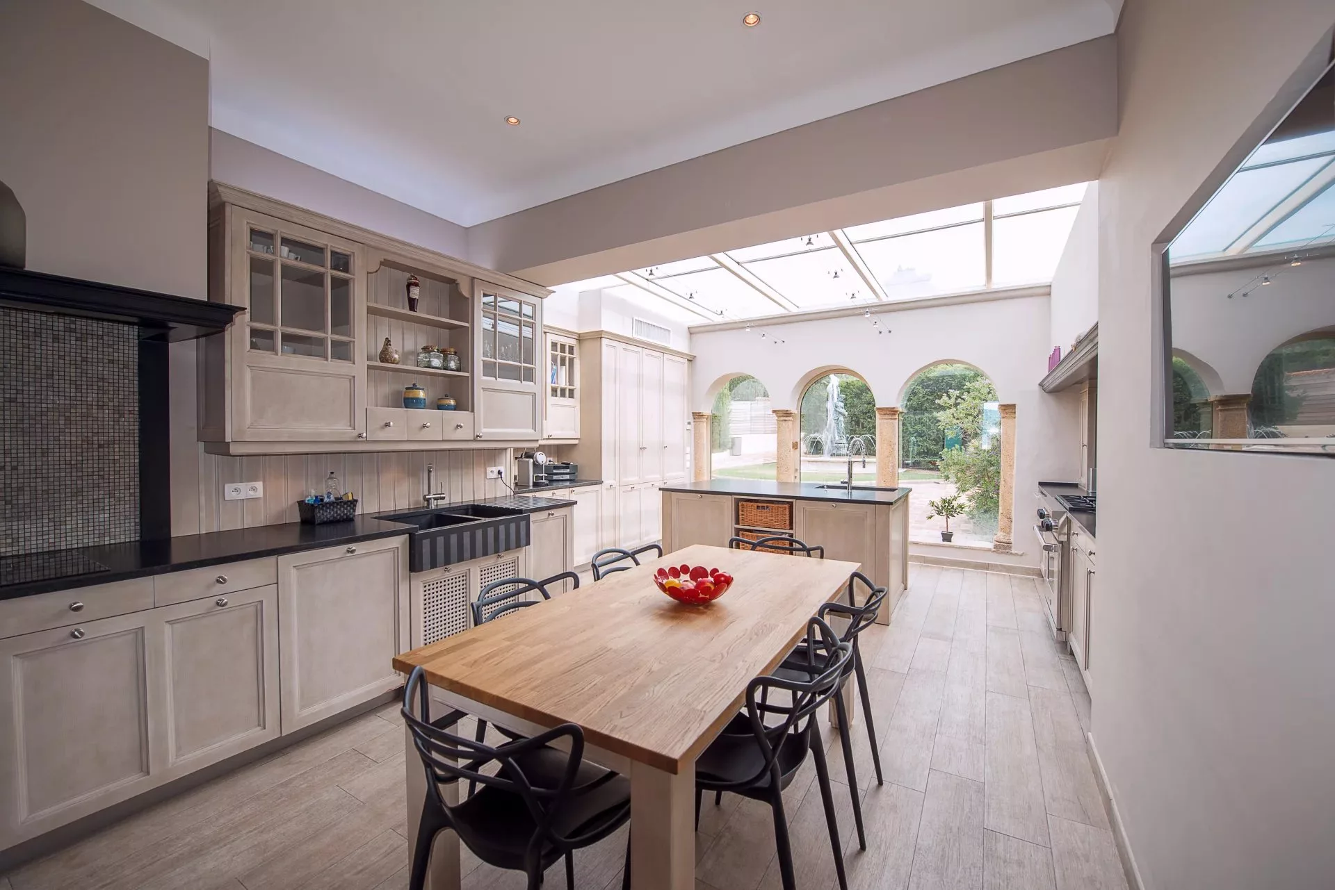 Elle se compose d'une entrée, d'un salon et salle à manger, d'une grande cuisine équipée accessible de l'extérieur, d'un salon de lecture et cinéma, d'une chambre de maître avec sa salle de douche/bain/toilette, de 4 chambres doubles avec salle de douche et/ou bain, toilette, d'une chambre avec deux lits simples avec salle de douche/toilettes et de deux chambres dépendantes dont une chambre de service.