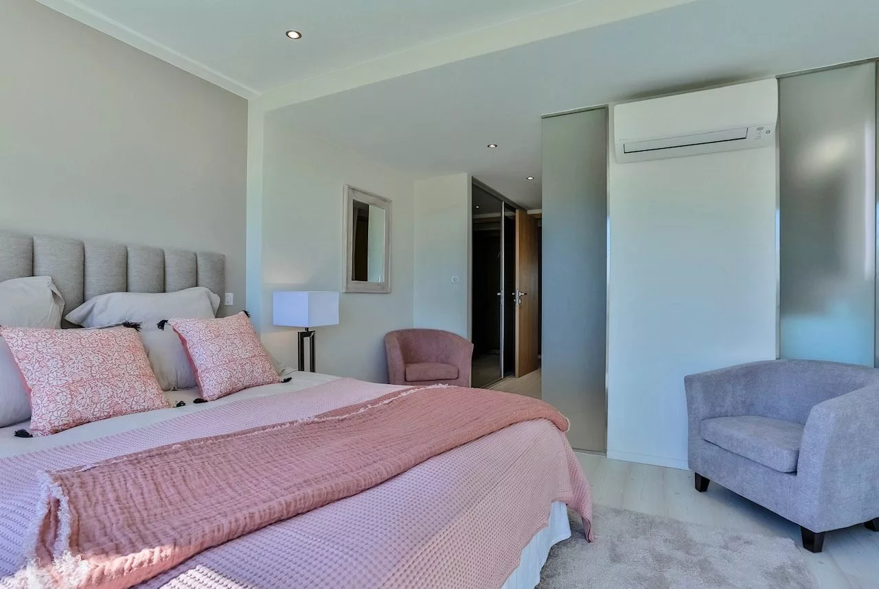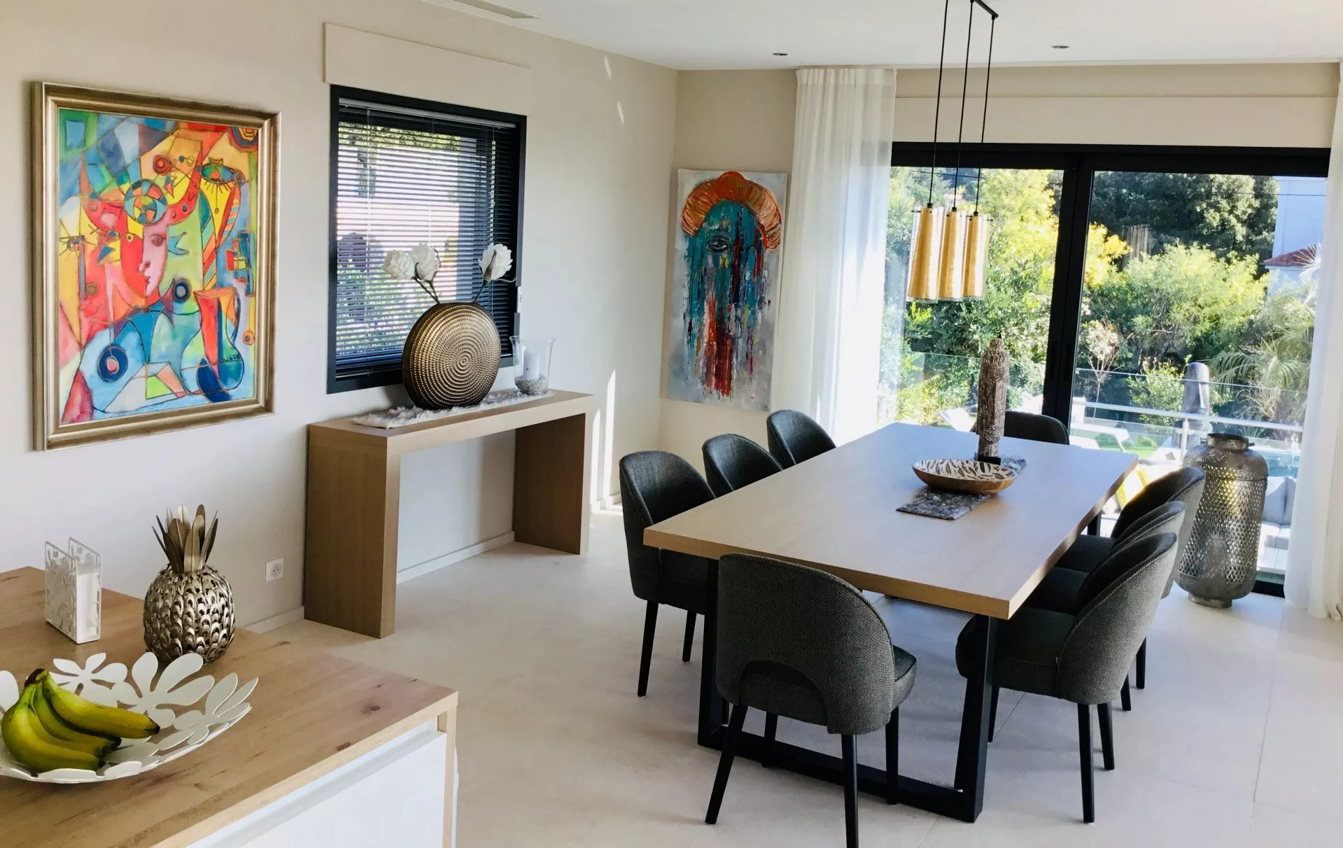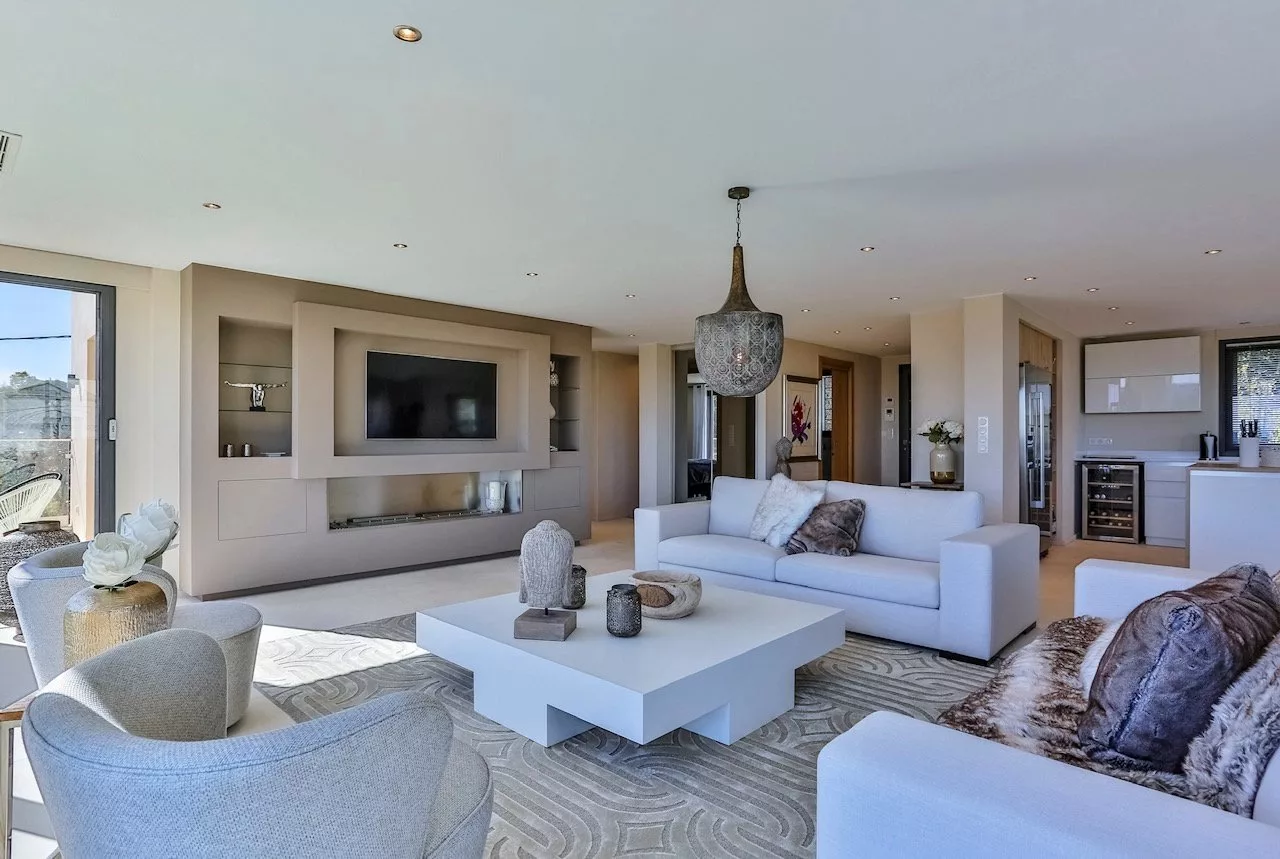 La maison, neuve, dispose d'une vaste pièce à vivre comprenant un coin salon, une cuisine ouverte équipée avec un îlot central ainsi qu'une salle à manger, de 3 chambres avec chacune leur salle de douche et une chambre de maître avec sa salle de bains, une salle de jeux avec un billard, un hammam et un sauna.