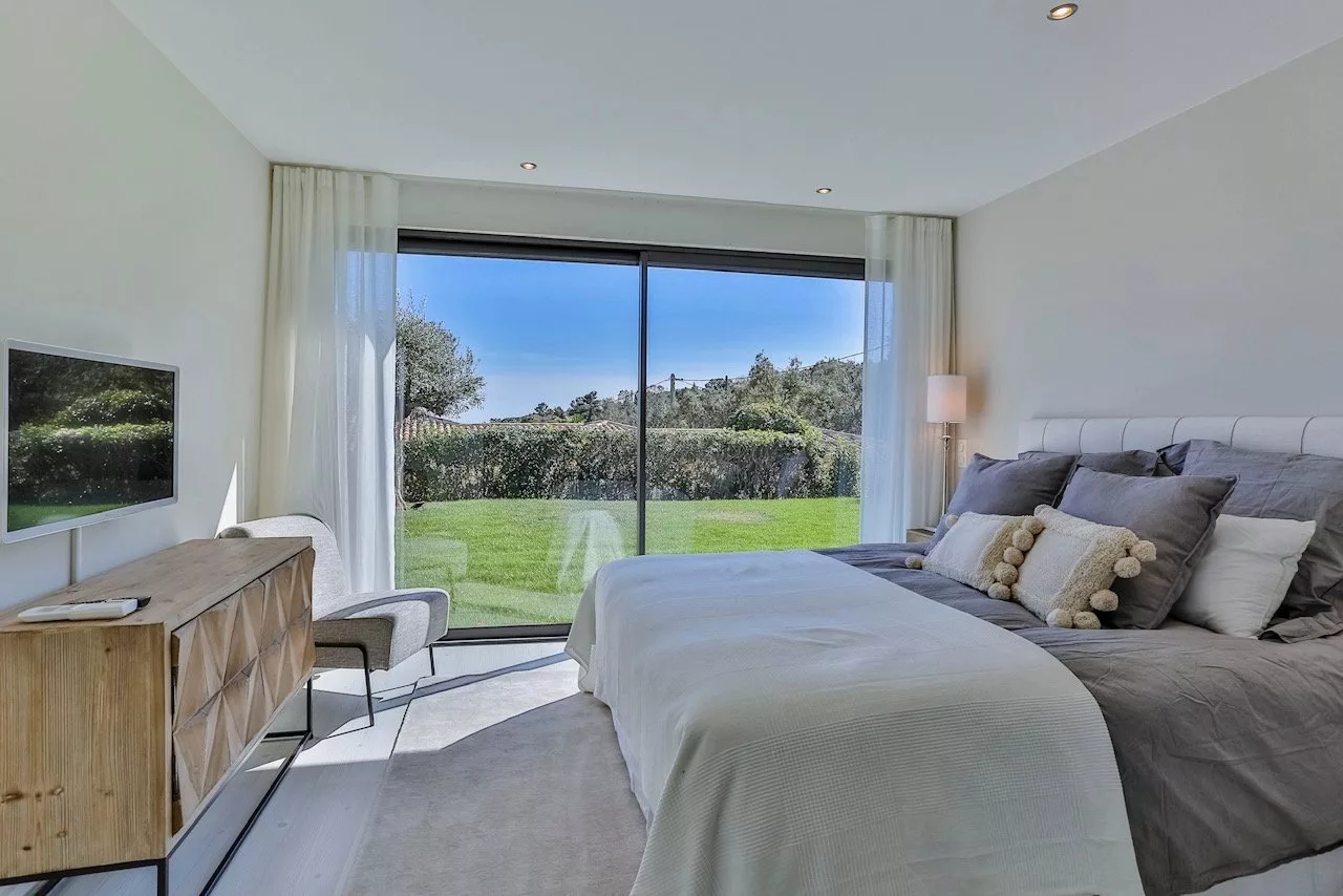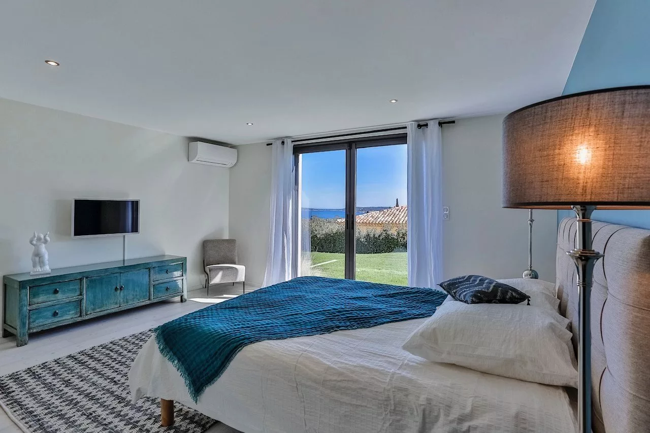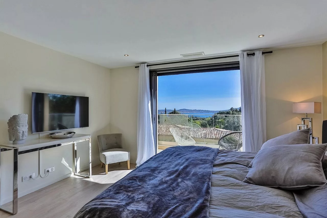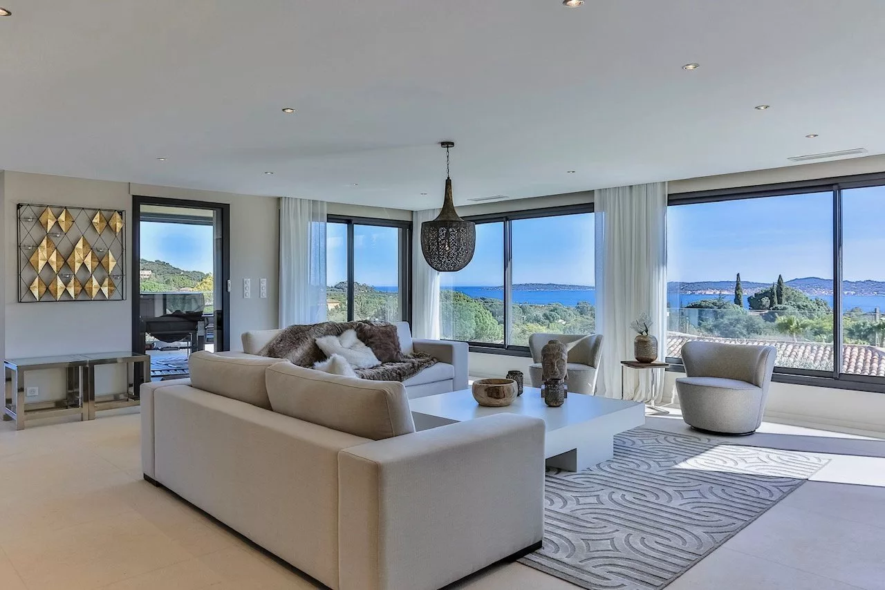 Cette propriété située dans un domaine privé dans le Golfe de Saint-Tropez offre des prestations de grande qualité ainsi qu'une très belle vue mer.