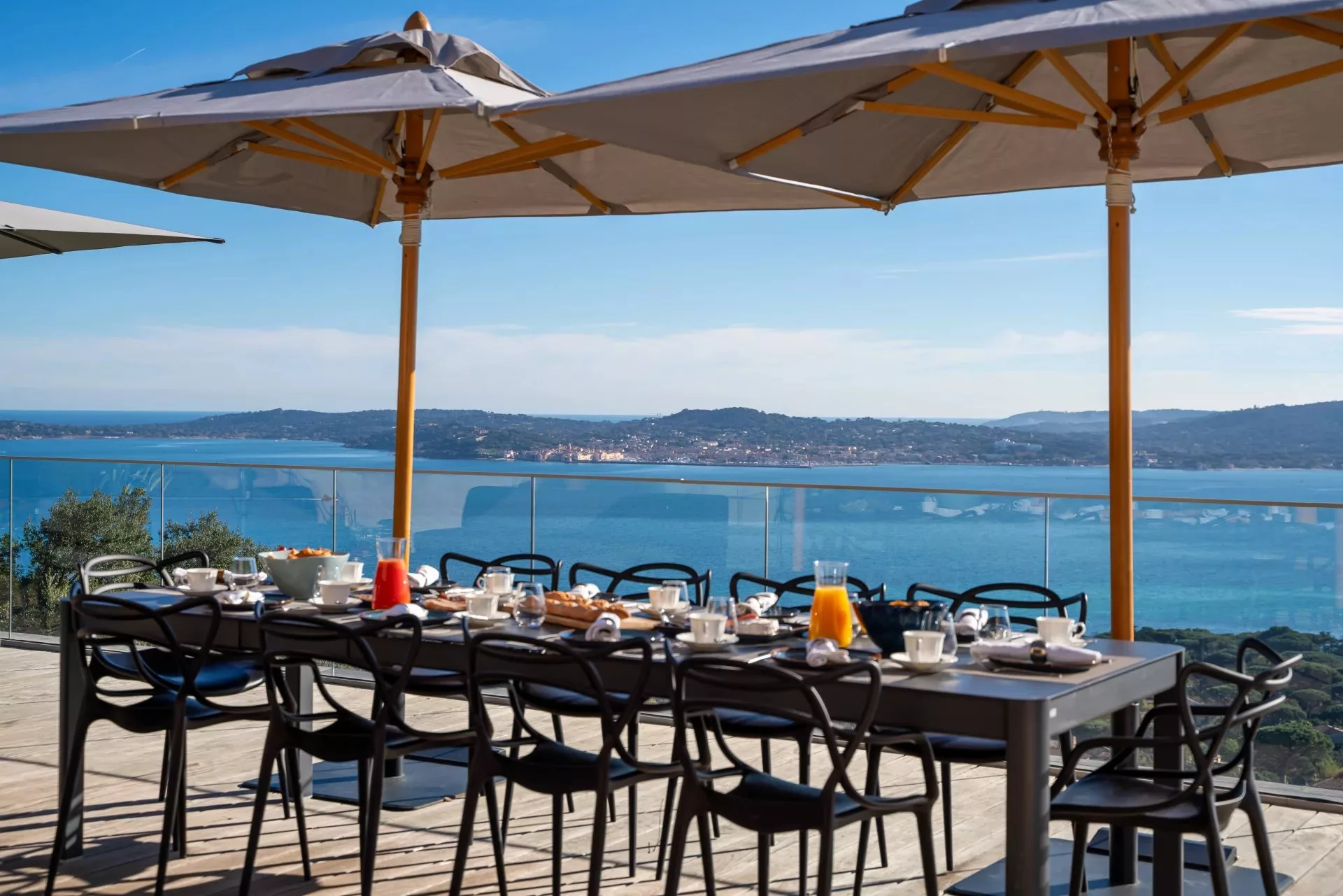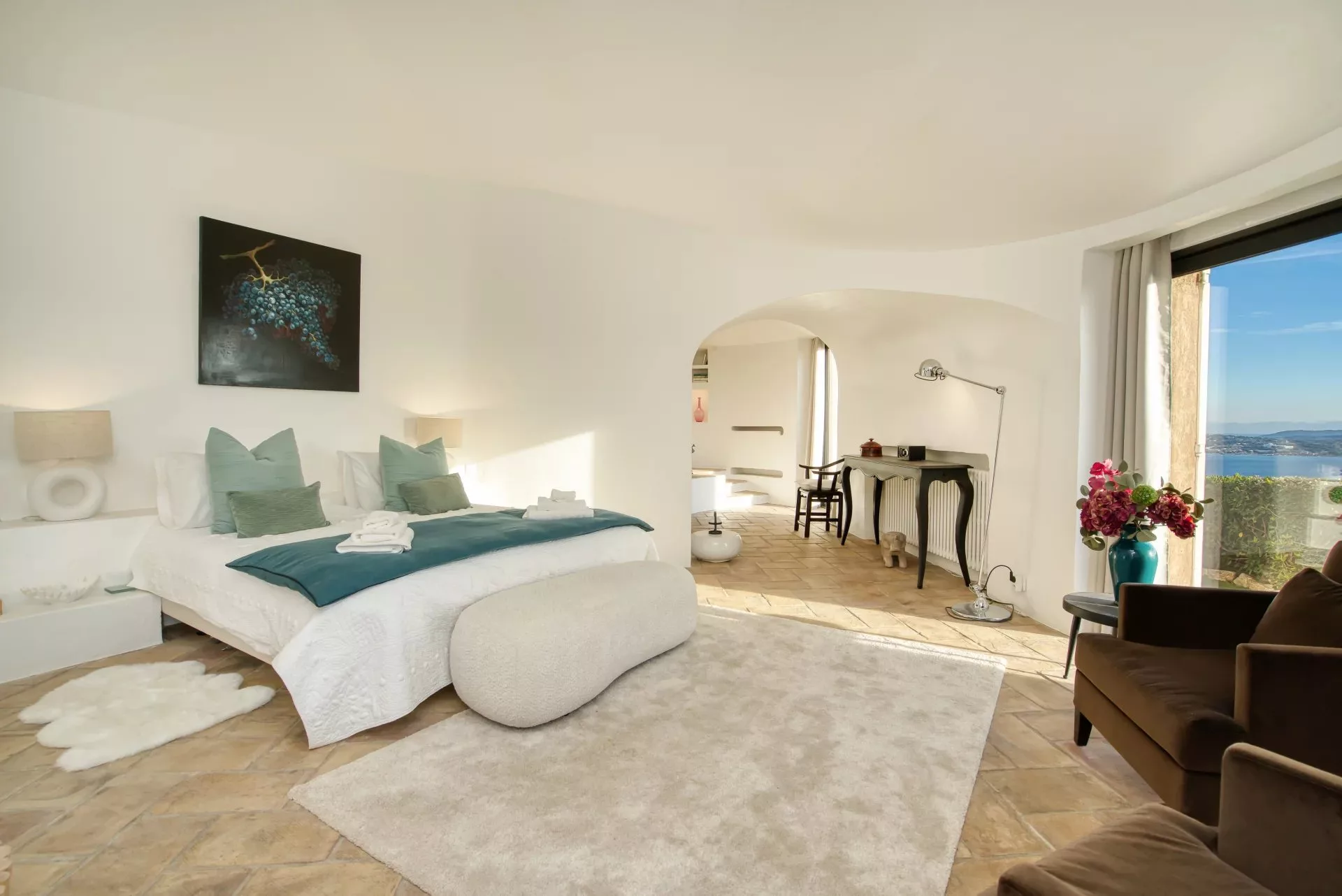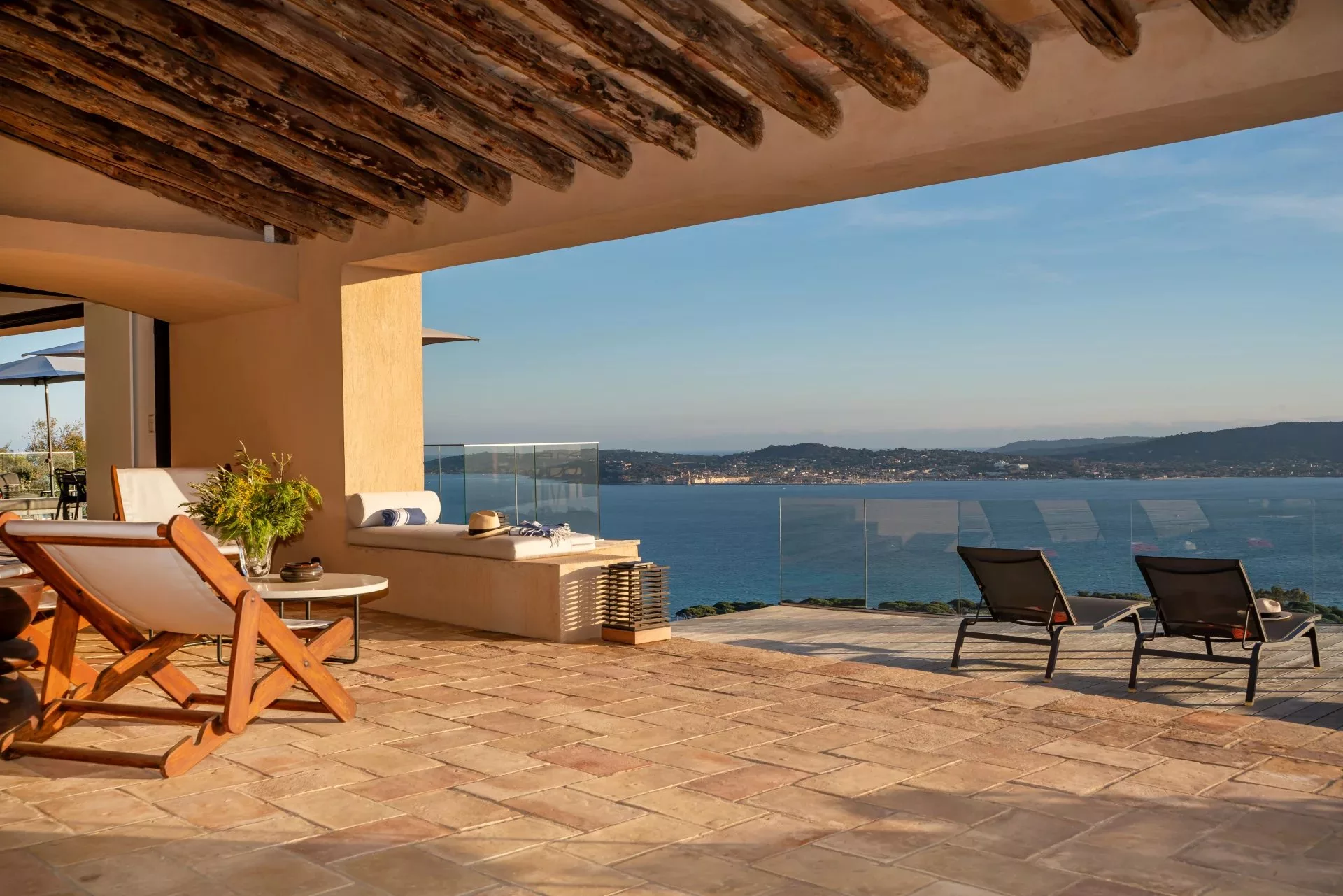 La villa surplombe tout le golfe de Saint-Tropez, et dévoile une vue panoramique et époustouflante sur la mer, les collines environnantes et le village mythique de Saint-Tropez.