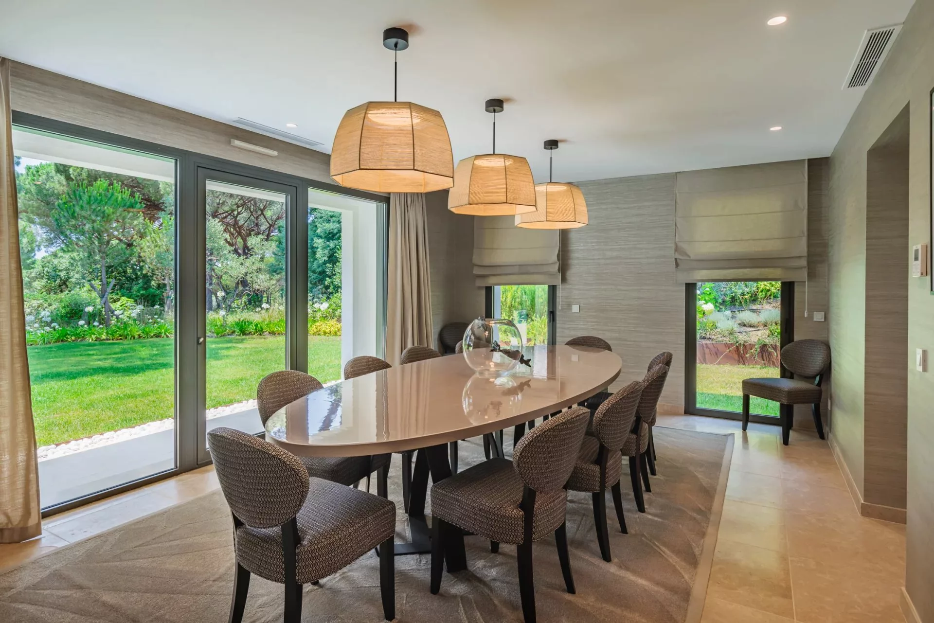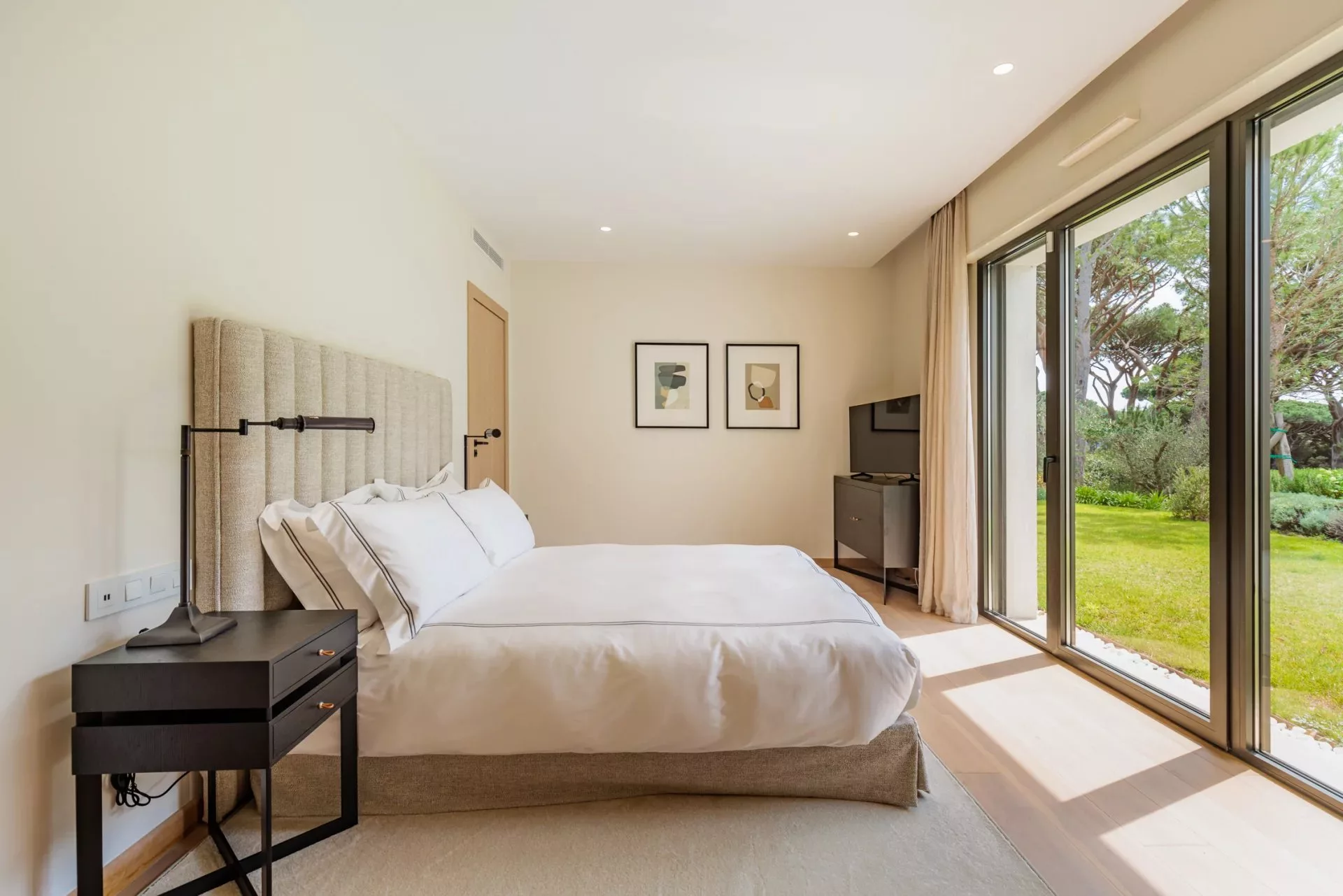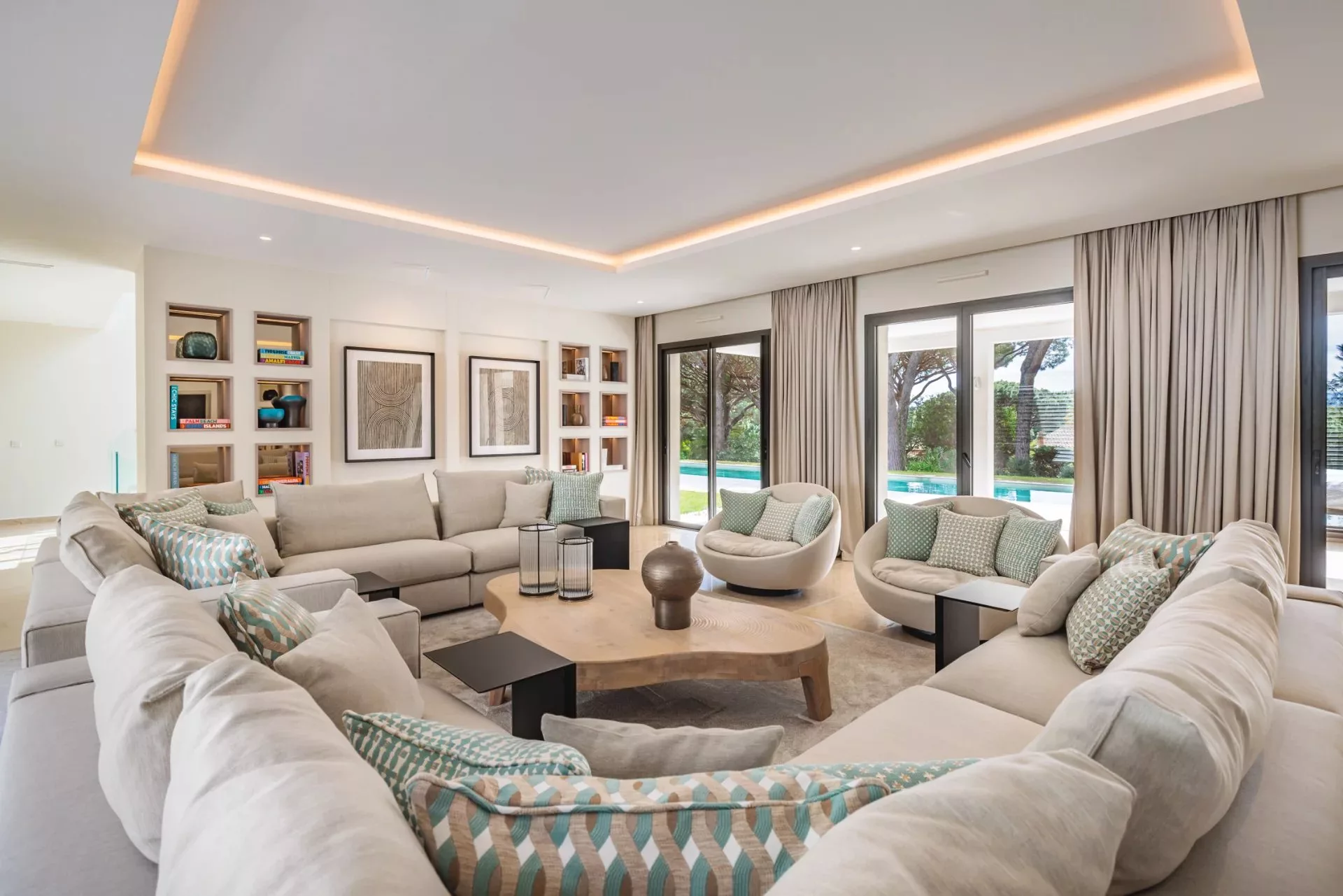 Belle villa contemporaine dans le domaine sécurisé des Parcs de Saint Tropez, offre de jolies de pièces de vie intérieures dont un salon, une salle à manger, une cuisine entièrement équipée, 6 chambres en suite dont une chambre de maître avec sa terrasse, une salle de massage avec un hammam et une salle de sport.