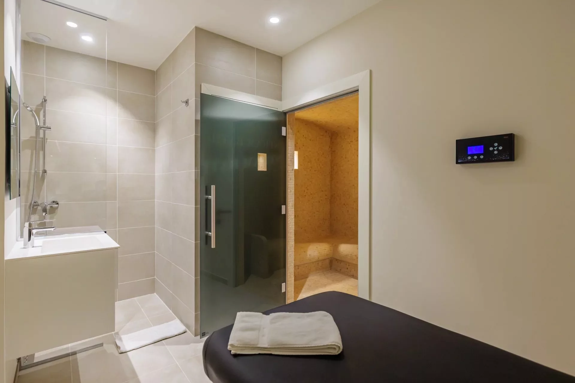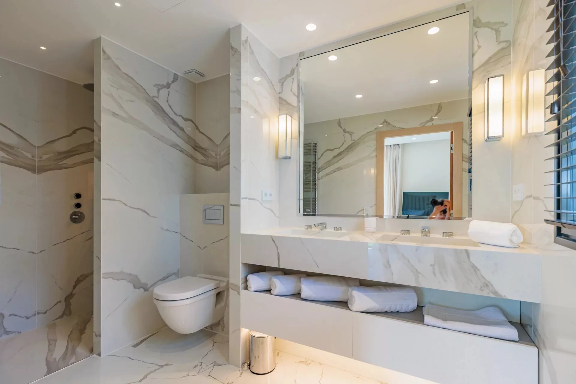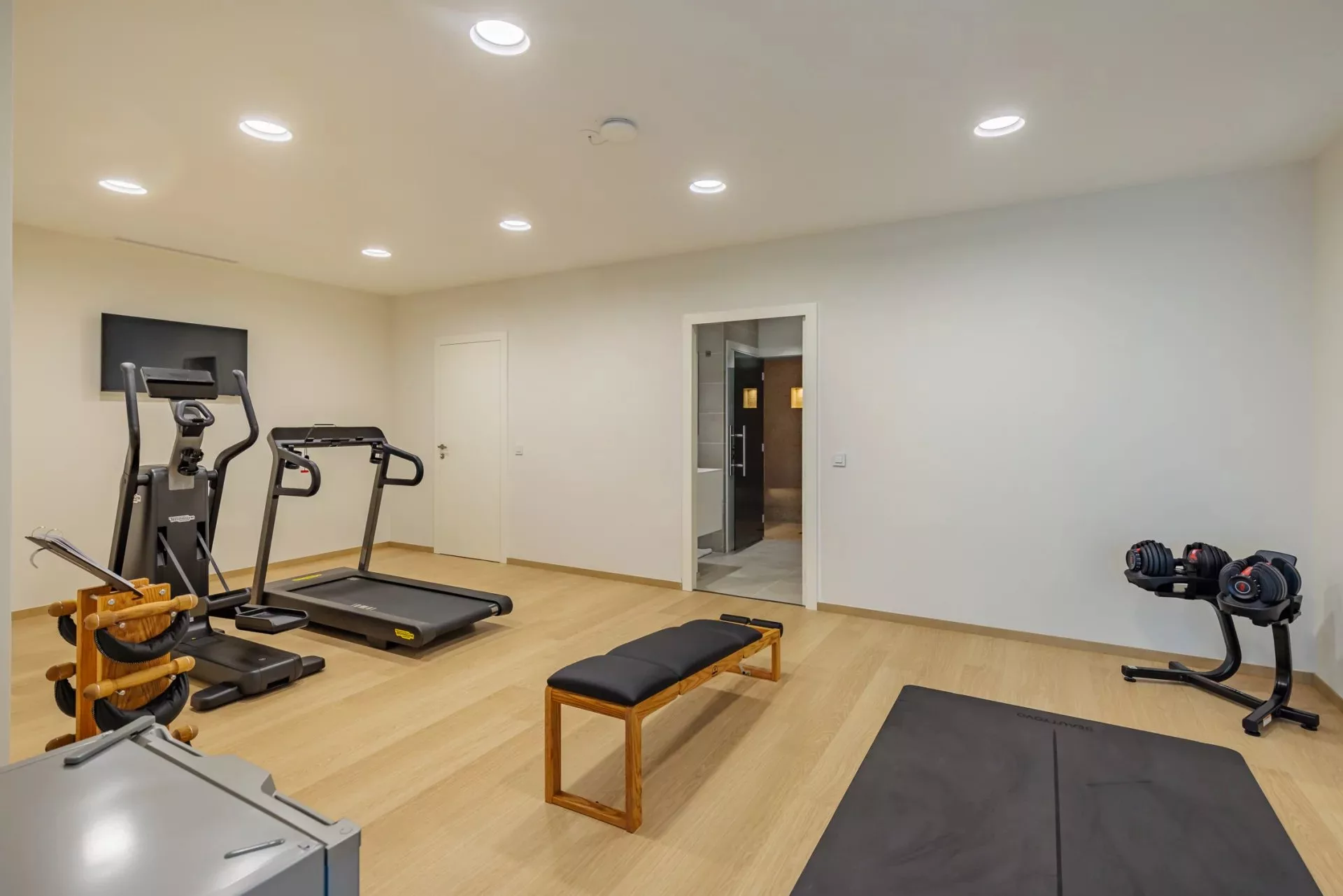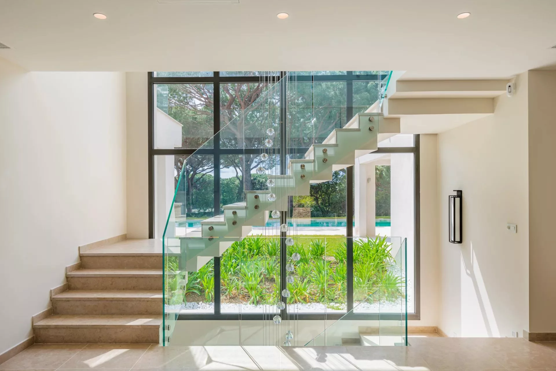 Belle villa contemporaine dans le domaine sécurisé des Parcs de Saint Tropez, offre de jolies de pièces de vie intérieures dont un salon, une salle à manger, une cuisine entièrement équipée, 6 chambres en suite dont une chambre de maître avec sa terrasse, une salle de massage avec un hammam et une salle de sport.