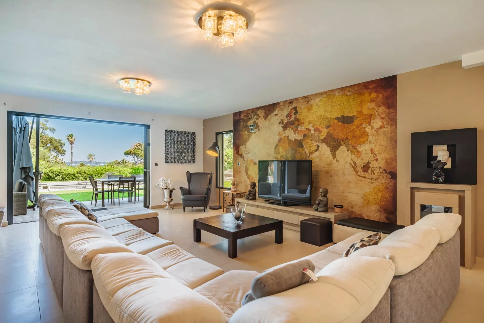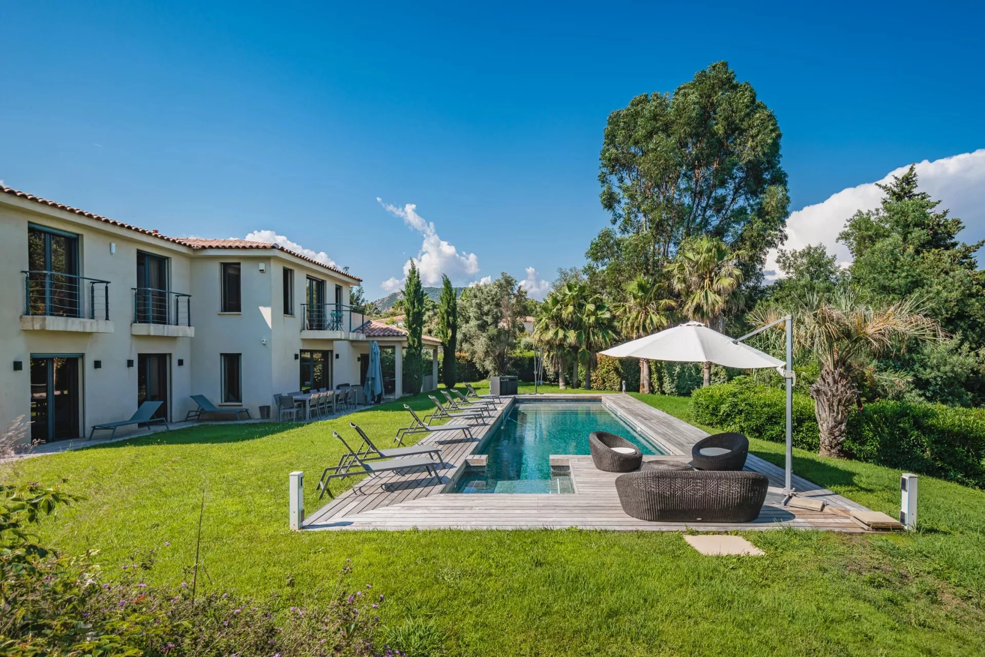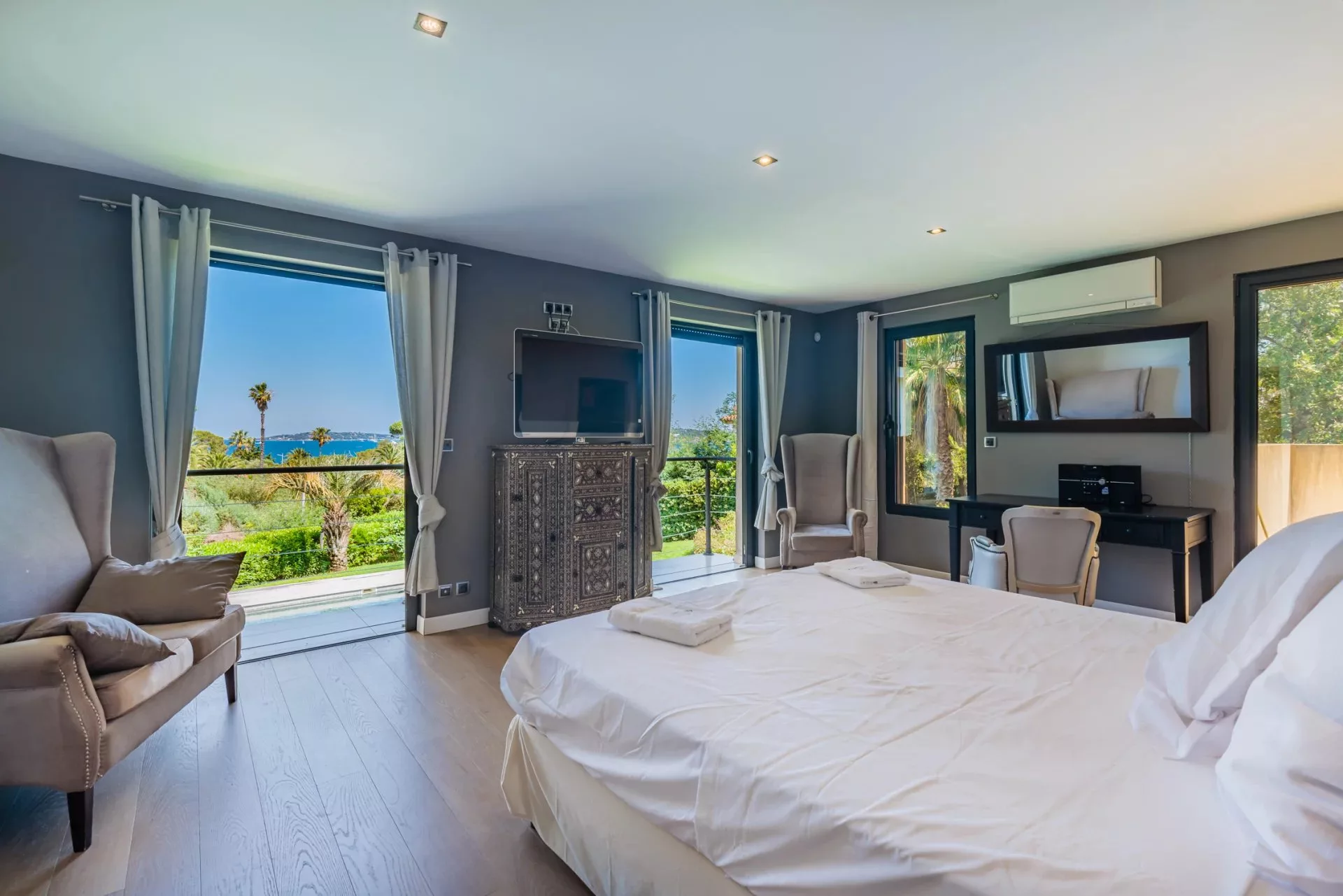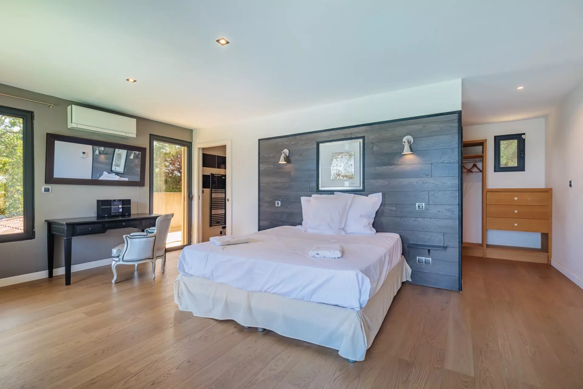 Offrant des prestations haut de gamme, elle dispose d'un salon, une cuisine ouverte équipée, de 7 chambres avec 6 salles de bains, une piscine, un jacuzzi, un pool house et un garage, le tout entouré d'un jardin arboré et d'un joli aperçu mer.