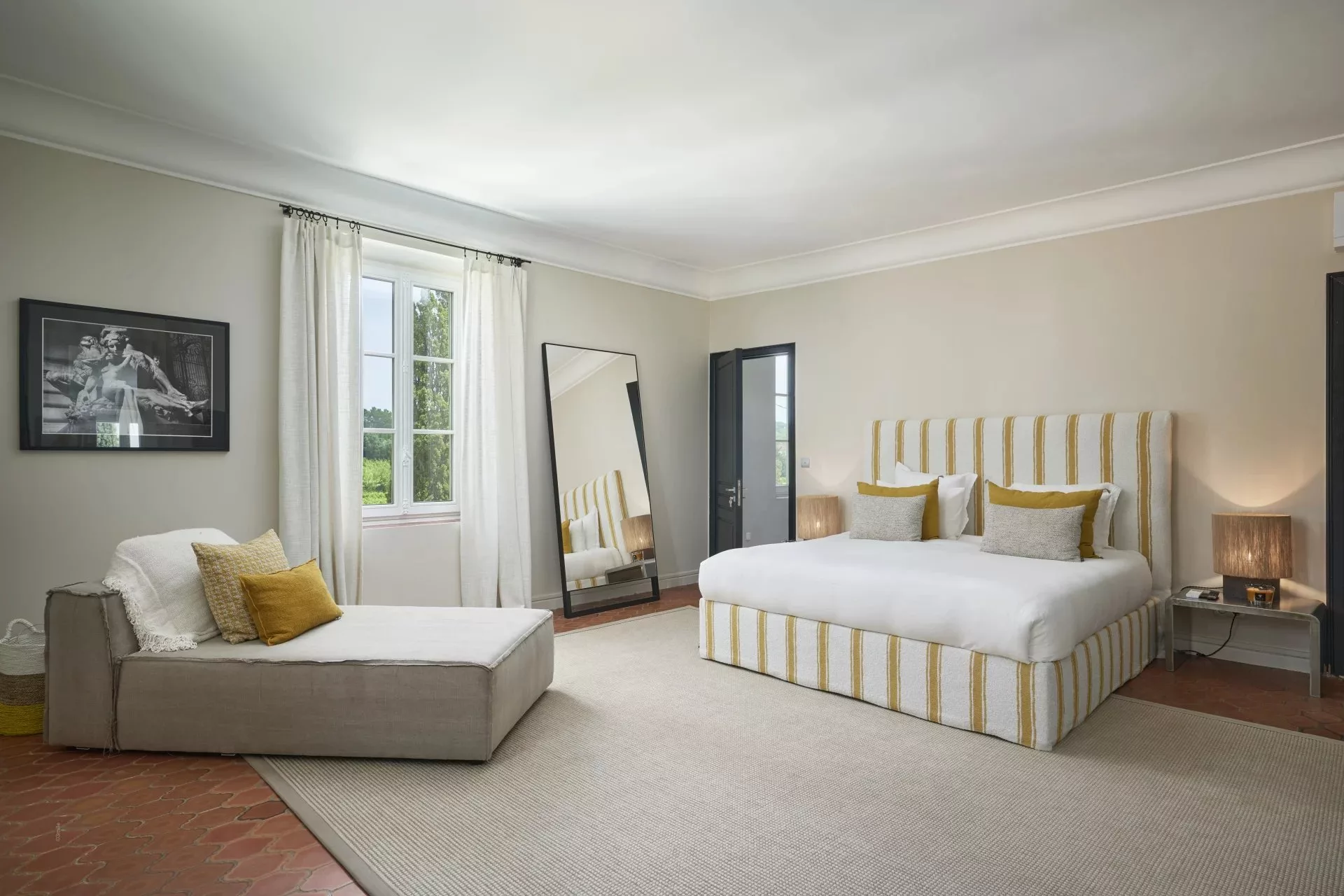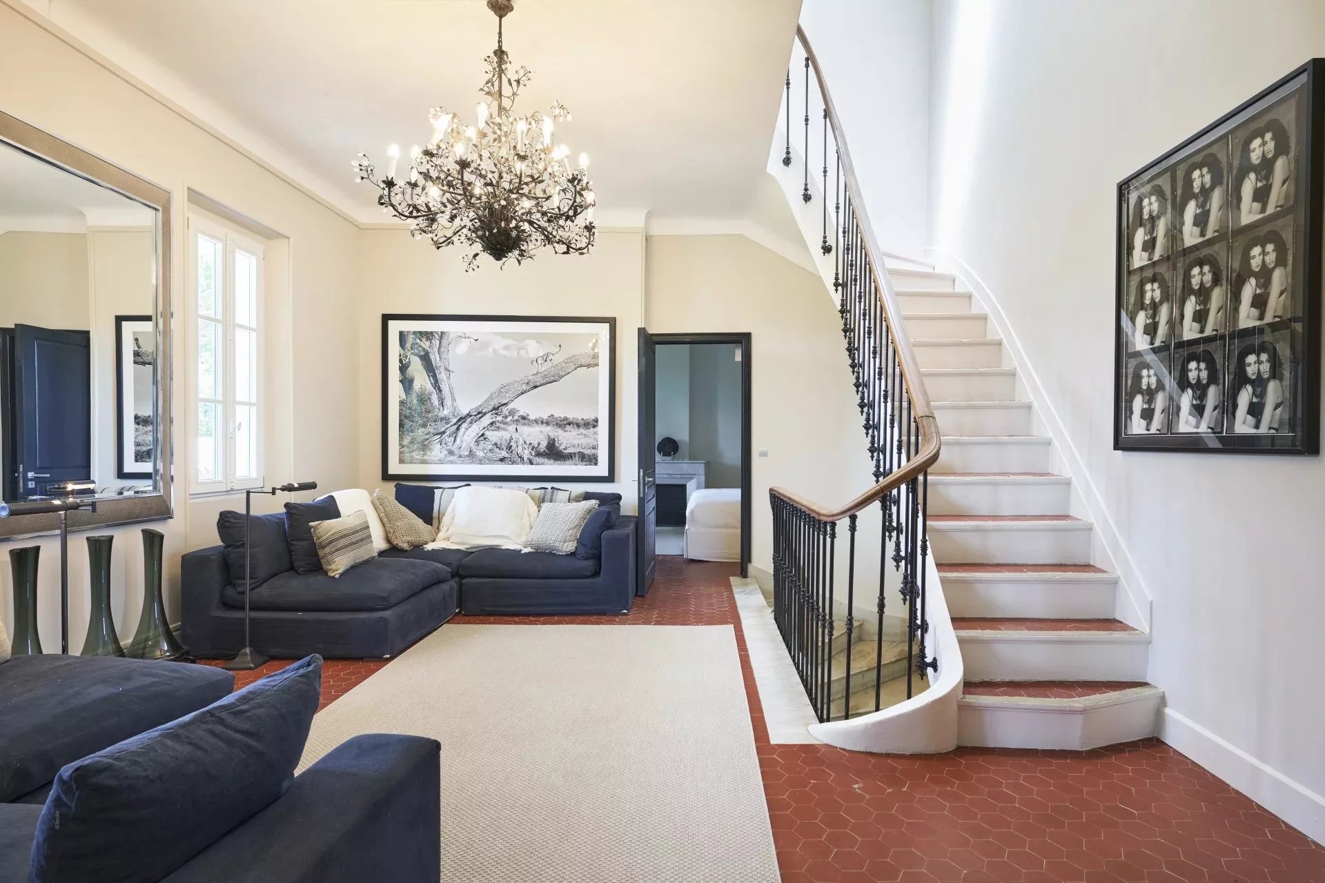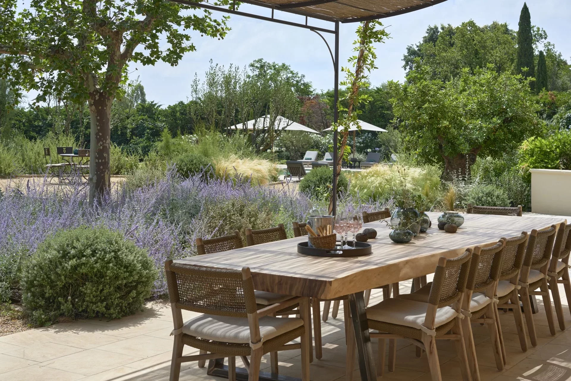 Elle est entourée d'un magnifique jardin arboré, de grandes terrasses, d'une piscine spacieuse, d'un terrain de pétanque et d'une salle de sport en annexe.