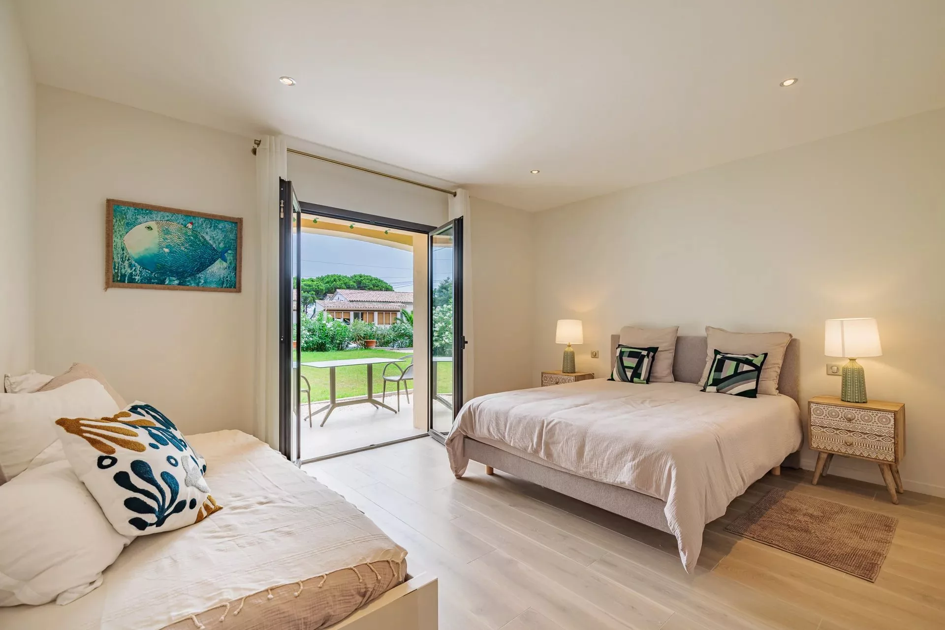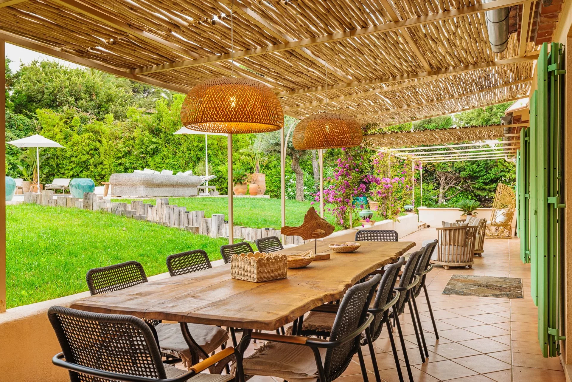 Située au calme à seulement quelques minutes à pieds de la plage, et 4kms de Saint-Tropez, cette magnifique villa entièrement rénovée pourra accueillir toute la famille ou vos amis avec ses 8 chambres en suite, son séjour lumineux et sa cuisine entièrement équipée ouverte sur une belle terrasse Tropézienne et sa cuisine d'été.