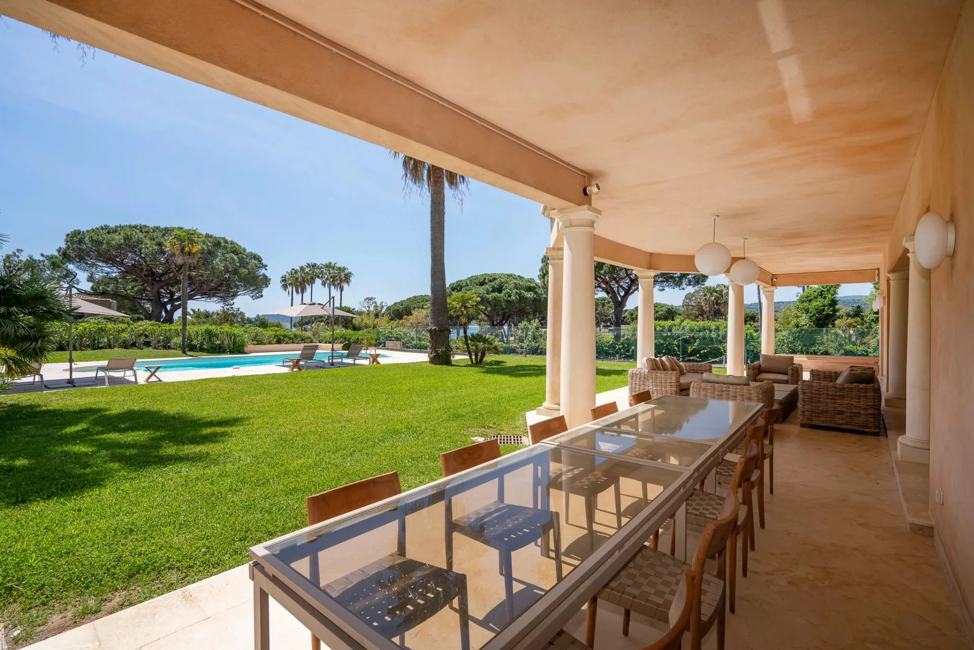 Cette villa de style néo-provençal orientée sud est située dans un domaine privé très prisé à Ramatuelle, à seulement 2 min à pieds de la plage de Pampelonne, et bénéficie d'une belle vue mer.