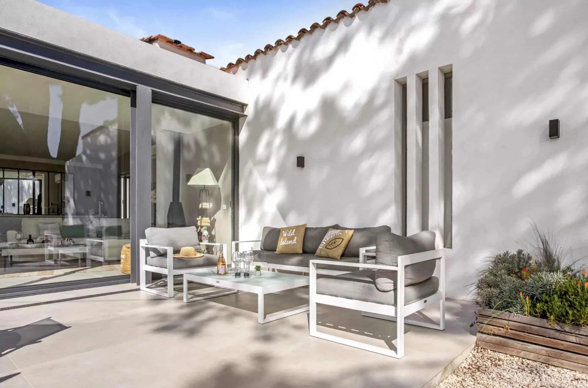 La Villa Artemis d'une superficie d'environ 150 m², rénovée en 2021, est située sur un terrain clos de 2 000 m² dans le domaine privé des Rives de Beauvallon à Grimaud, à 60 m au-dessus du niveau de la mer, offrant une vue imprenable sur le Golfe de Saint-Tropez.