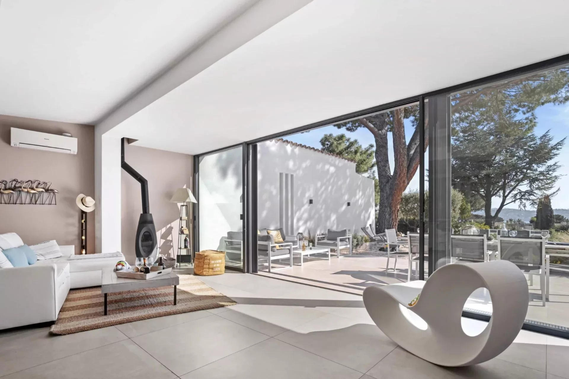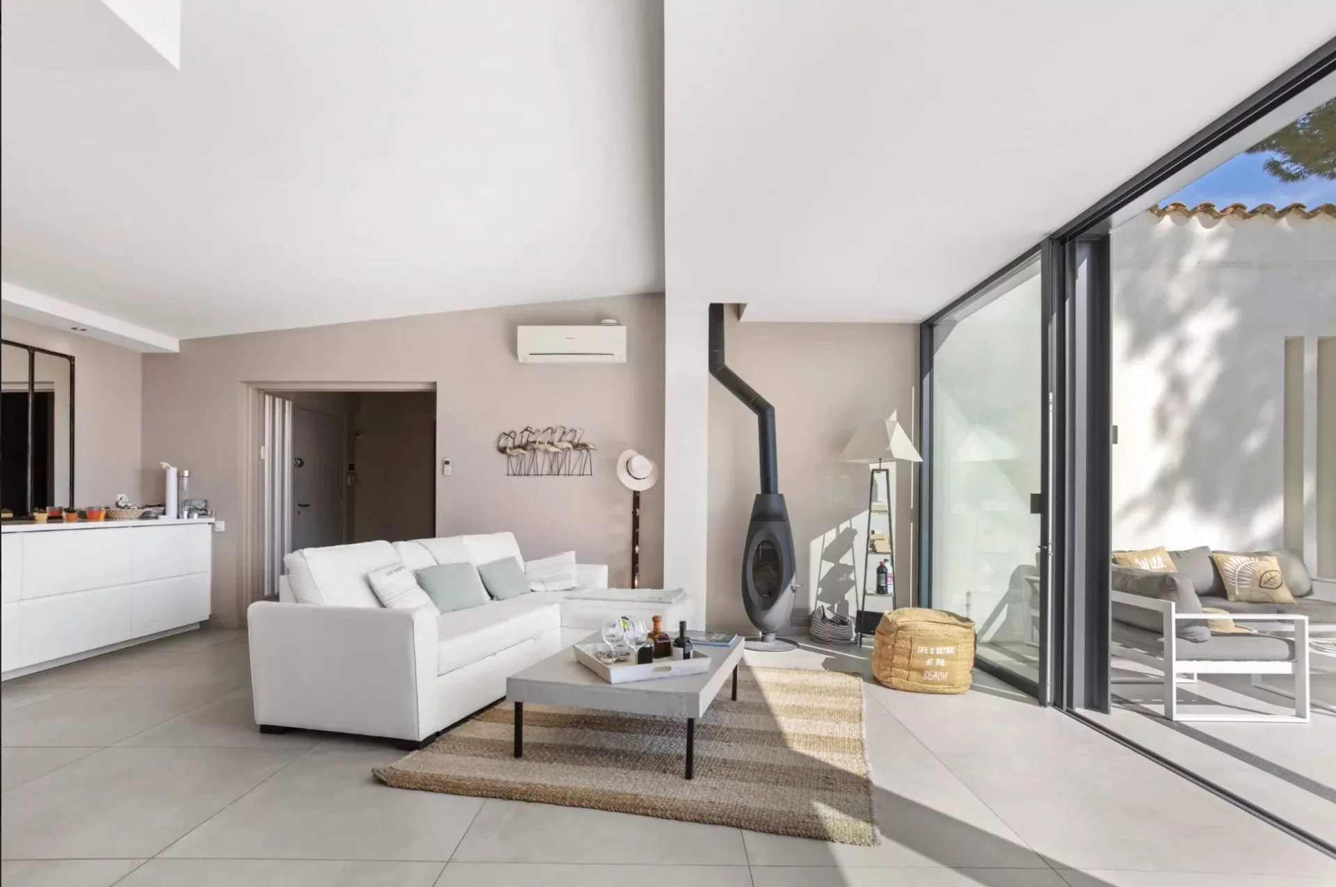 Le séjour de 50 m² avec cuisine ouverte et îlot central (cave à vin réfrigérée) s’ouvre sur une terrasse de 150 m² avec plancha et piscine privée (10 × 5 m) exposée plein sud.