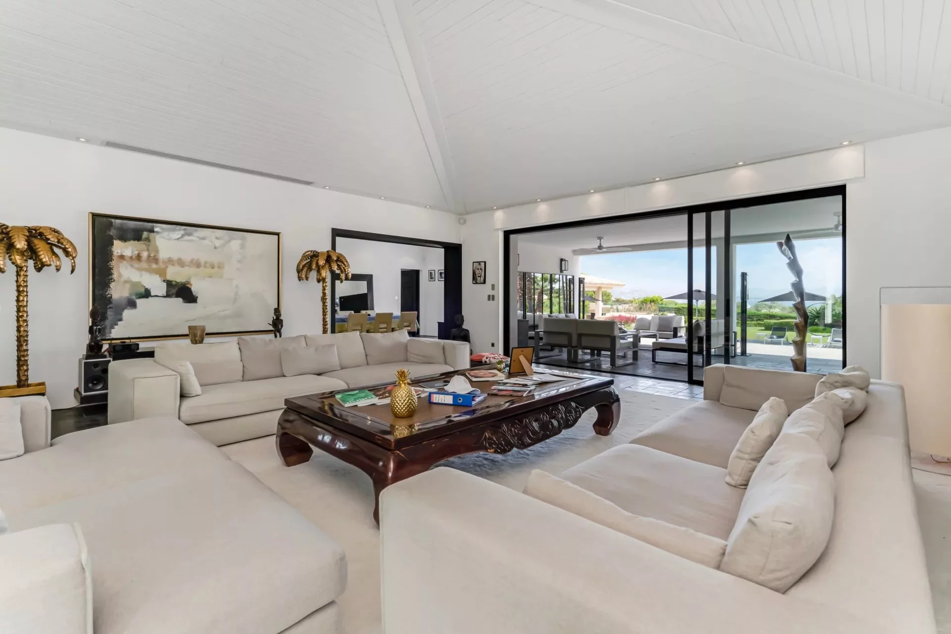 La première villa, se compose d'un grand salon, d’une cuisine professionnelle, avec un accès privatif(portillon), une salle à manger, 1 salle de sport, 1 très grande suite de maître à l’étage, vue mer sur la baie des Canoubiers, avec belle salle de bain ouverte, au RDC, 3 chambres double en suite, avec chacune leur salle de bain, en sous sol, buanderie, frigos pro, stockages, monte charge, direct office cuisine.