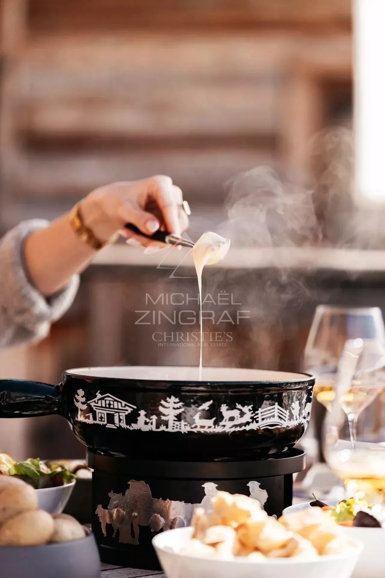 Le salon, baigné de lumière naturelle, s’ouvre sur une vue spectaculaire des montagnes. Un feu de cheminée anime les soirées d’hiver, tandis que la cuisine ouverte et la salle à manger invitent à partager des moments conviviaux après une journée sur les pistes.