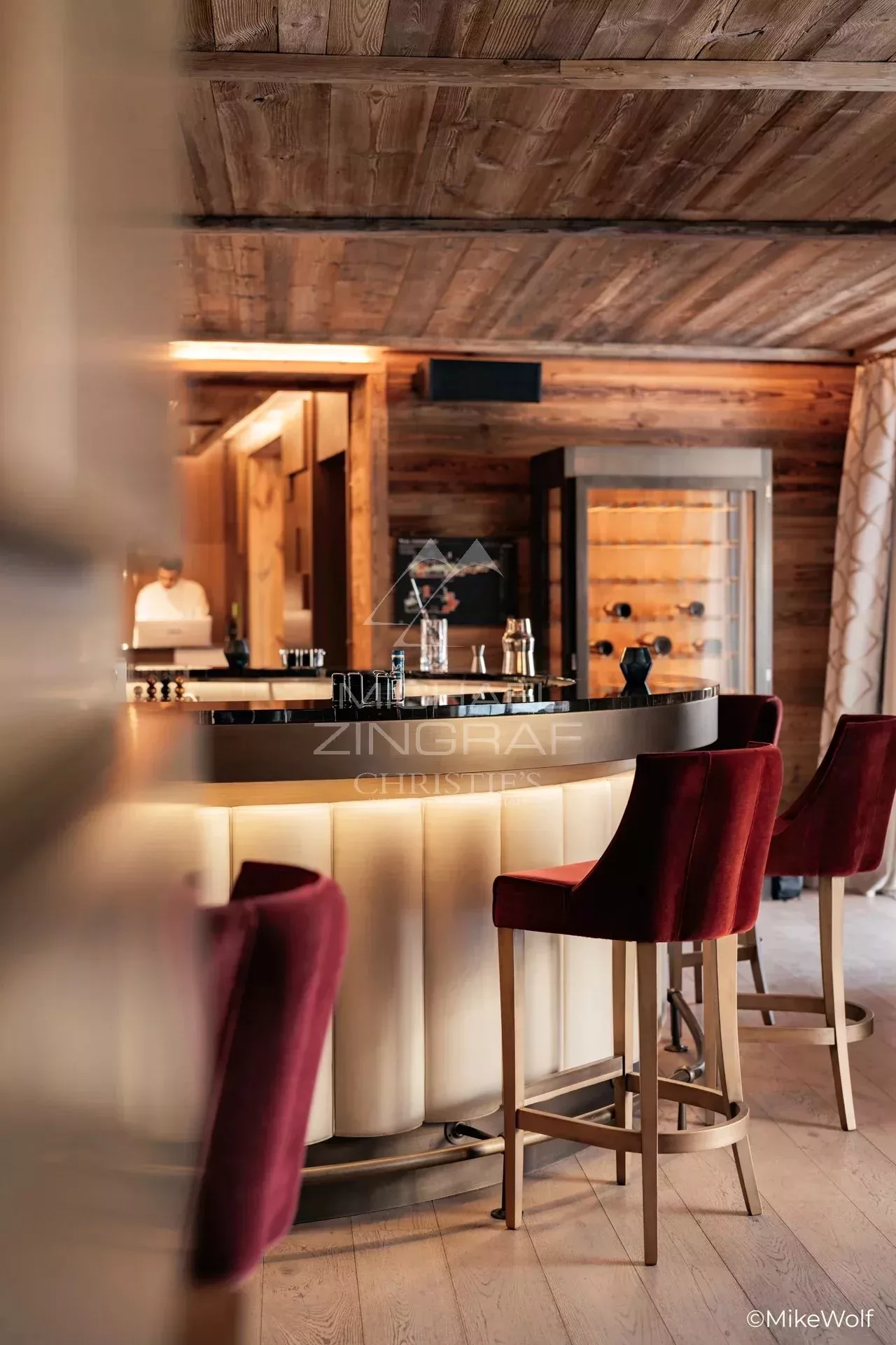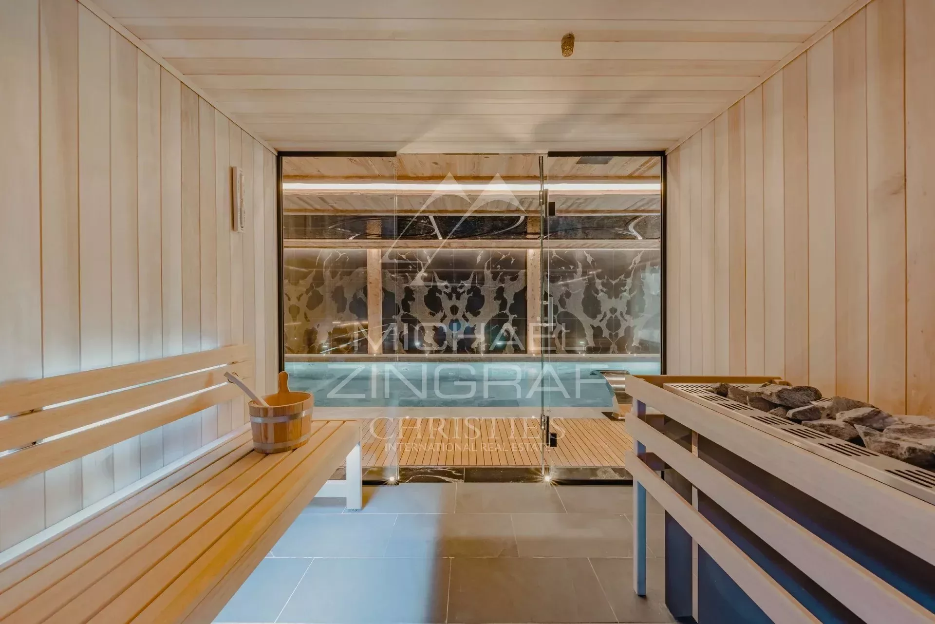 À l’extérieur, une terrasse et un balcon prolongent les espaces de vie vers les sommets enneigés. Le chalet donne accès à un espace bien-être complet, comprenant une piscine intérieure chauffée, un jacuzzi extérieur, un hammam, un sauna et une salle de sport accessible à toute heure.