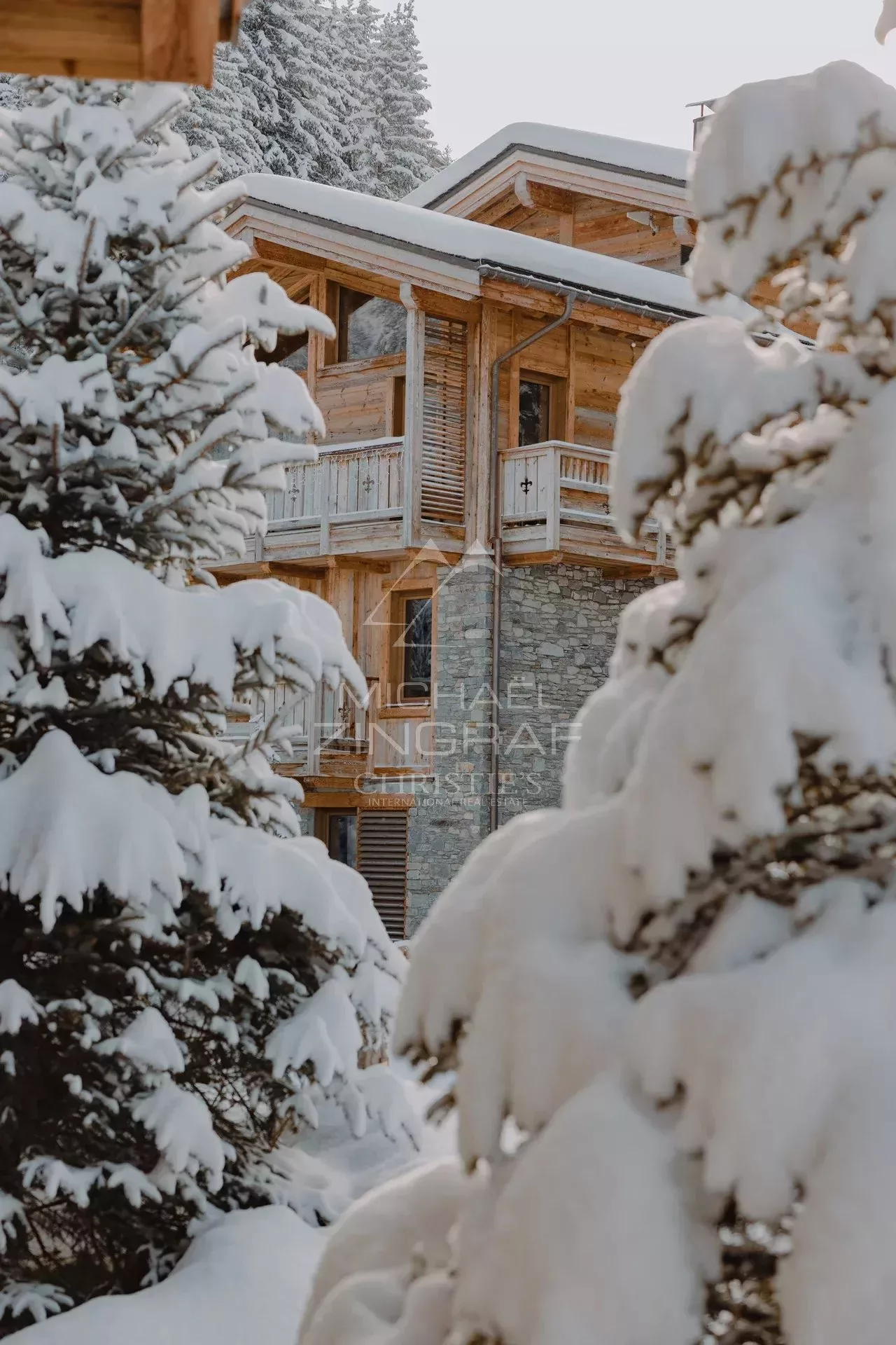 Au cœur de Courchevel Belvédère, ce chalet d’exception se dresse comme un refuge intime, à quelques pas seulement des pistes. Étendu sur trois étages et environ 180 m², il abrite cinq chambres avec salles de bain attenantes et dressings, pensées pour conjuguer confort et élégance.