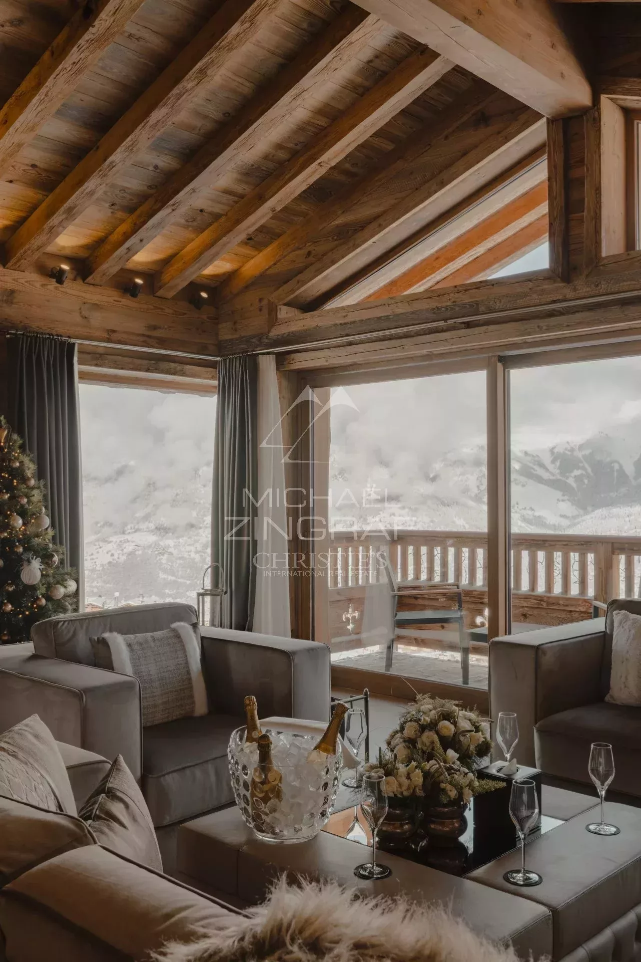 Le salon, baigné de lumière naturelle, s’ouvre sur une vue spectaculaire des montagnes. Un feu de cheminée anime les soirées d’hiver, tandis que la cuisine ouverte et la salle à manger invitent à partager des moments conviviaux après une journée sur les pistes.